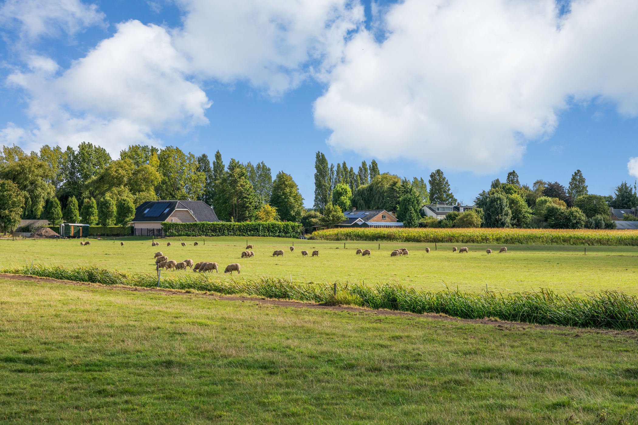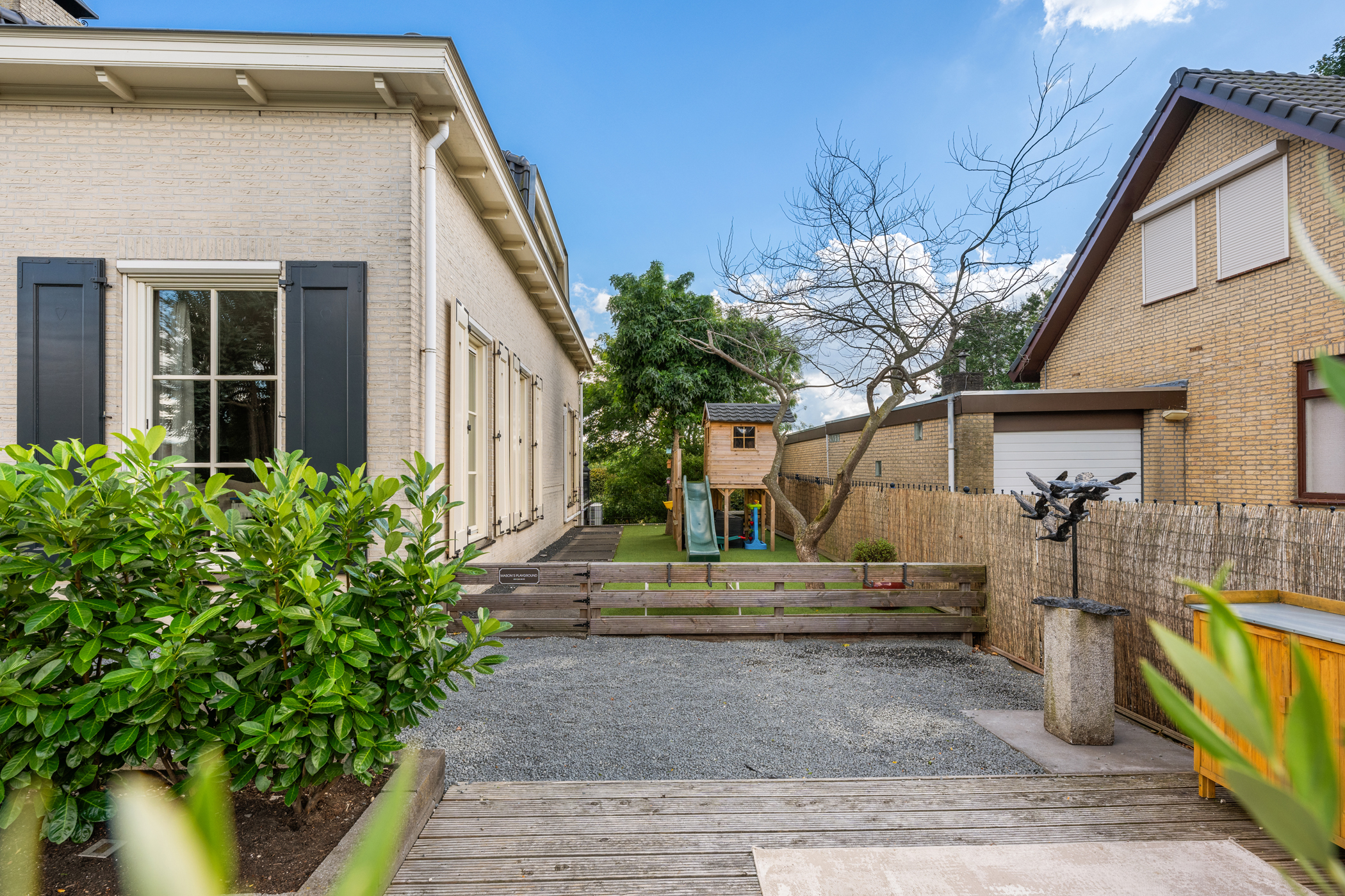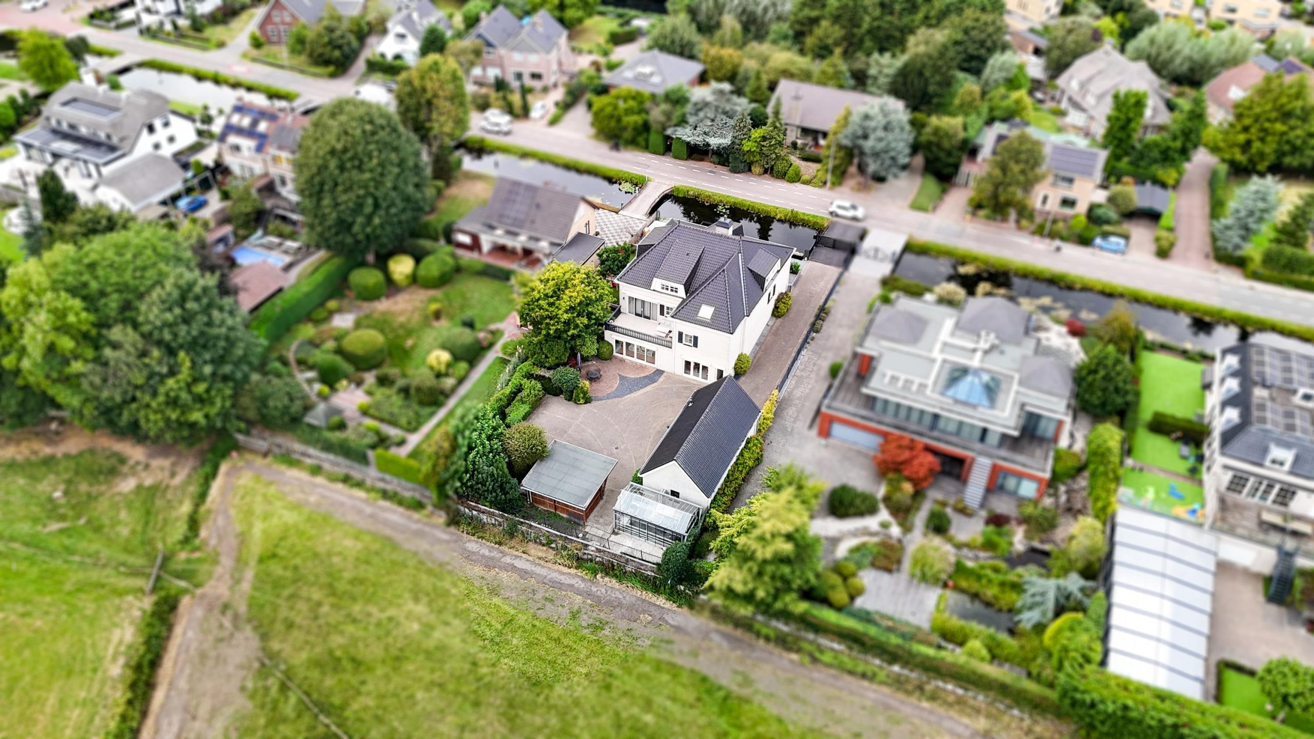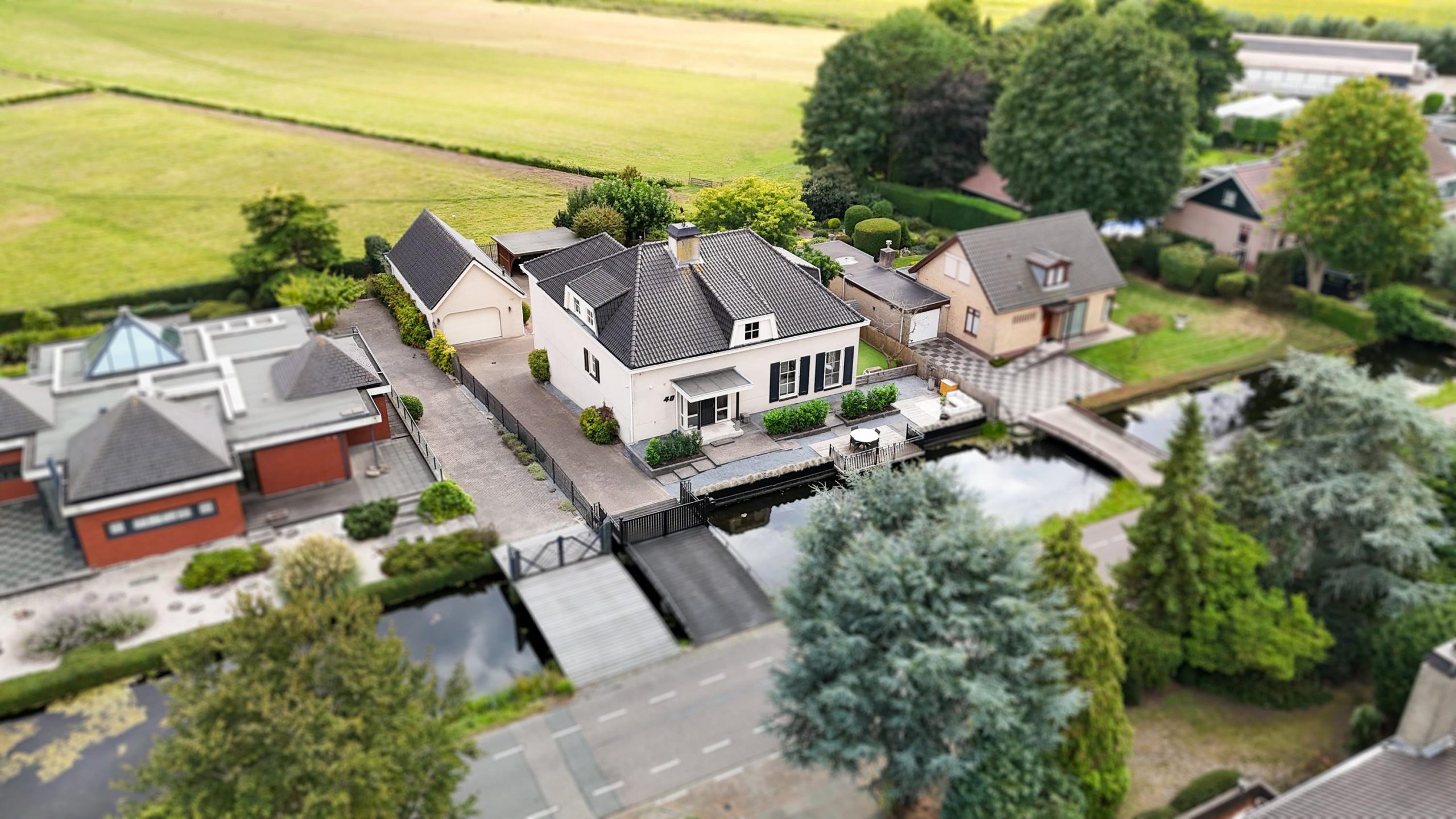 Via een eigen af te sluiten brug is het perceel te bereiken. De oprijlaan leidt naar de achterzijde, met voldoende parkeergelegenheid voor meerdere auto’s en een ruime garage.
