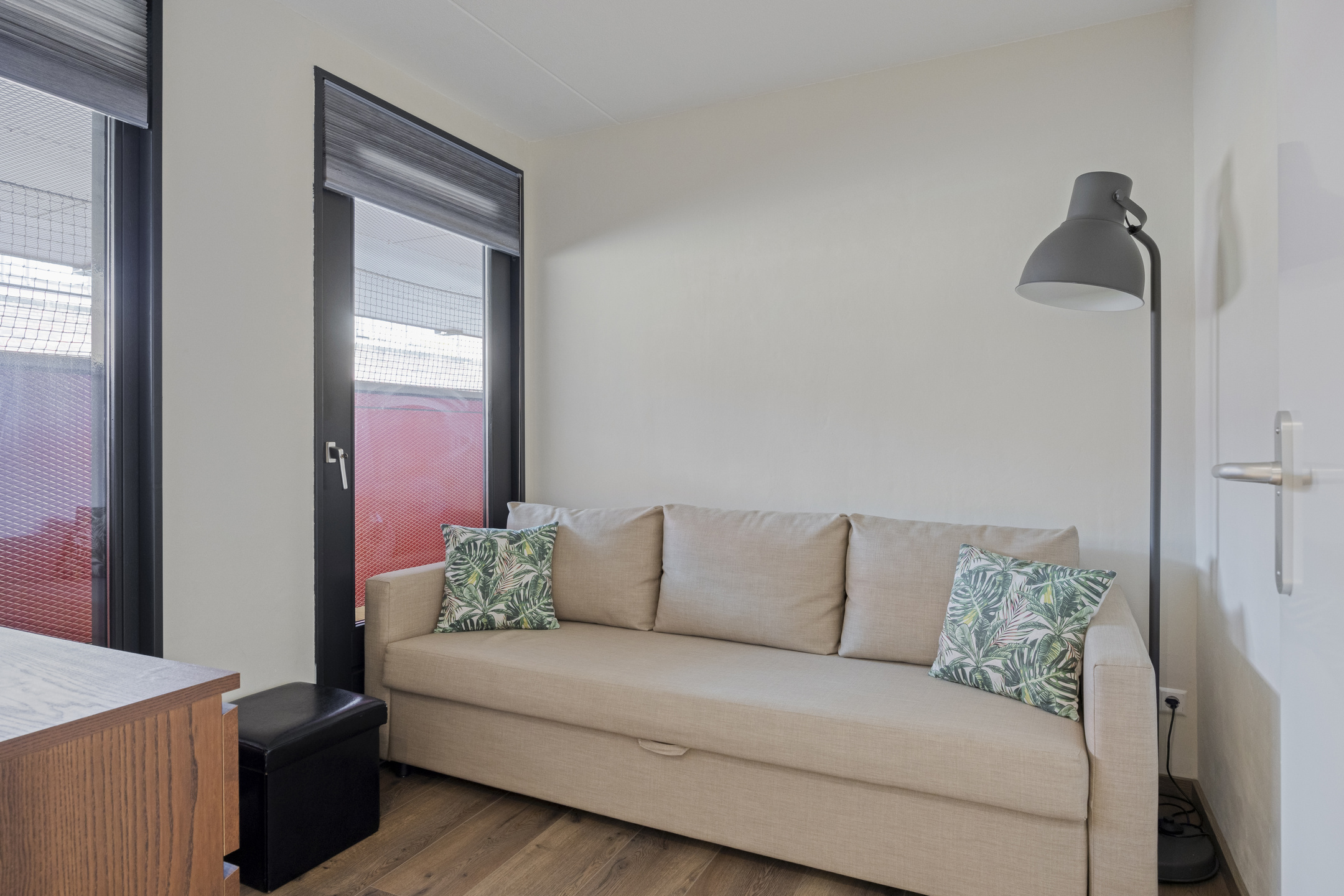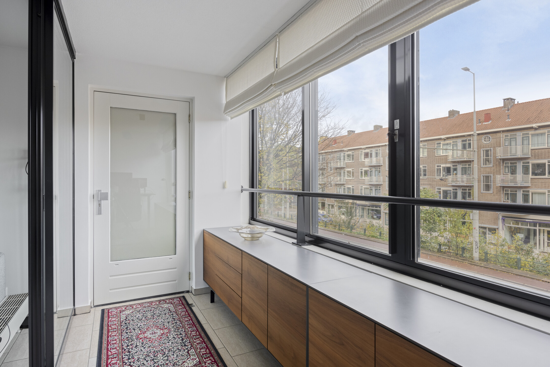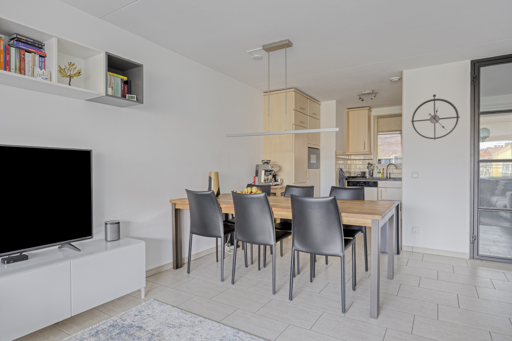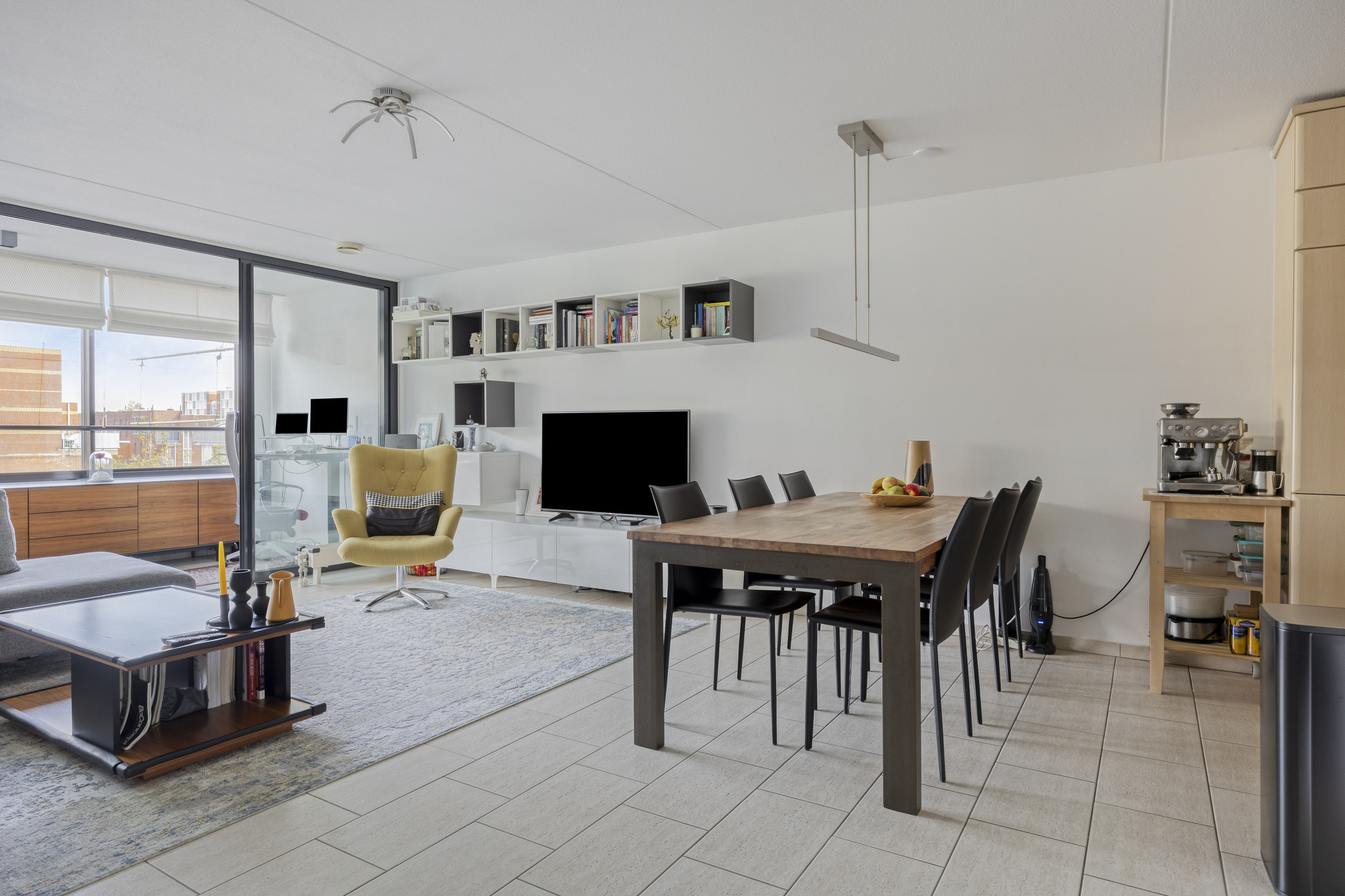 De lichte woonkamer ligt aan de voorzijde en is vanuit de hal bereikbaar. Via de schuifpui kom je op de loggia, waar je heerlijk van het uitzicht over Kralingen kunt genieten. De woonkamer is voorzien van een stenen vloer met vloerverwarming.