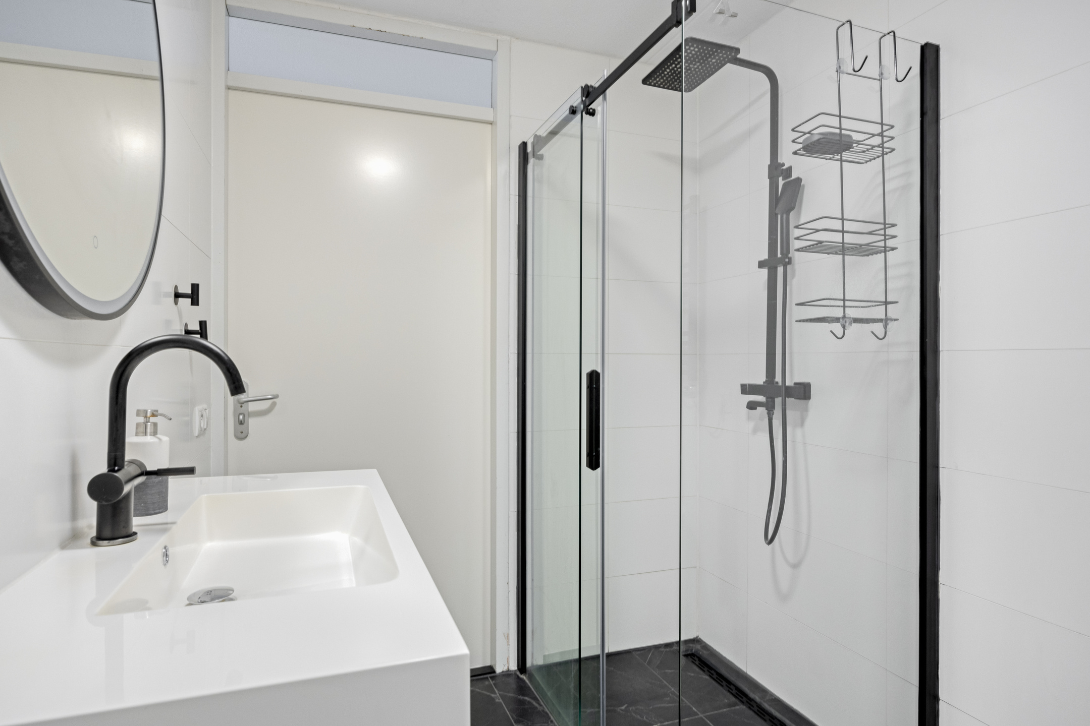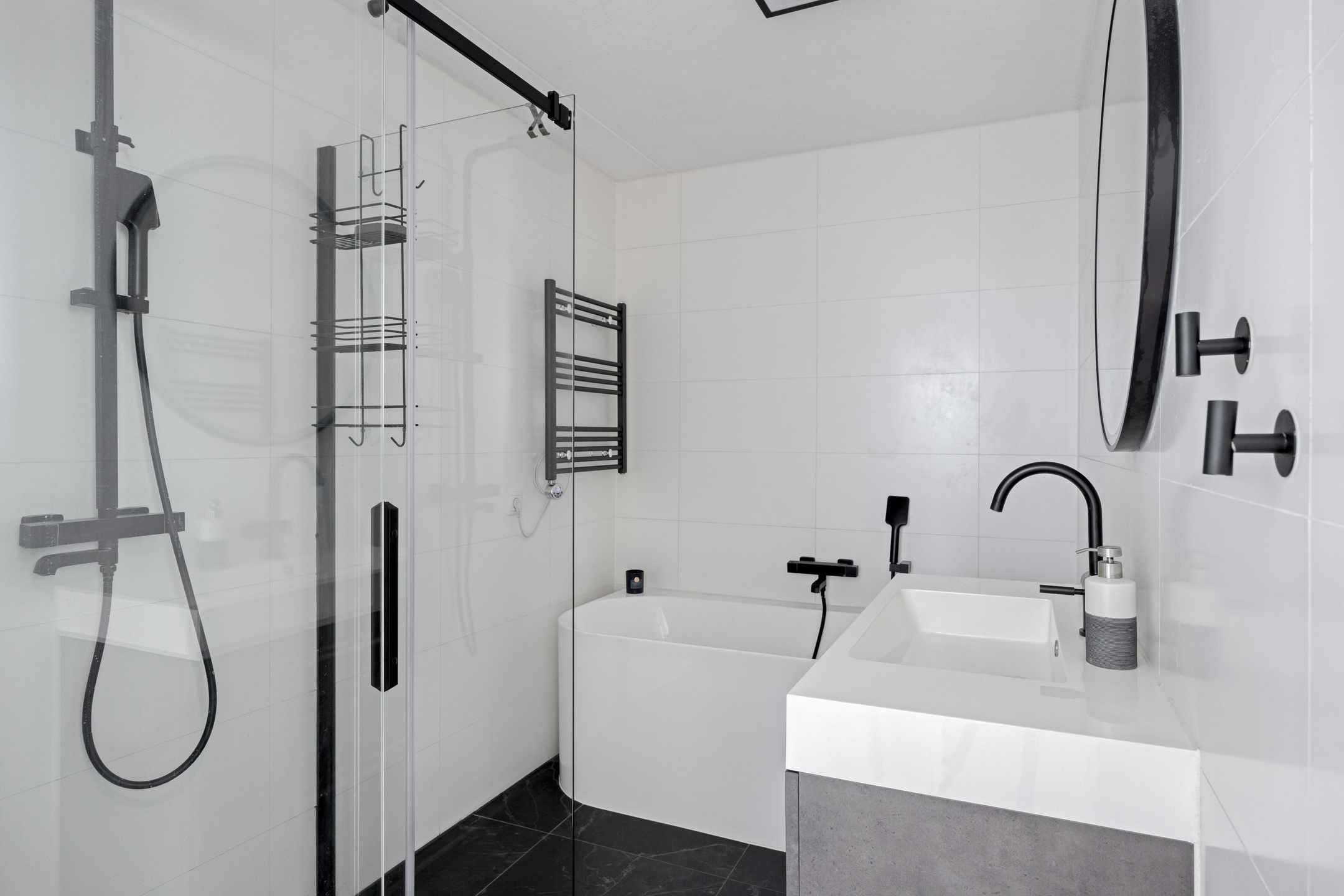 De badkamer is in 2022 gemoderniseerd en voorzien van ligbad, douche, wastafelmeubel, spiegel met verlichting, handdoekradiator en mechanische ventilatie.