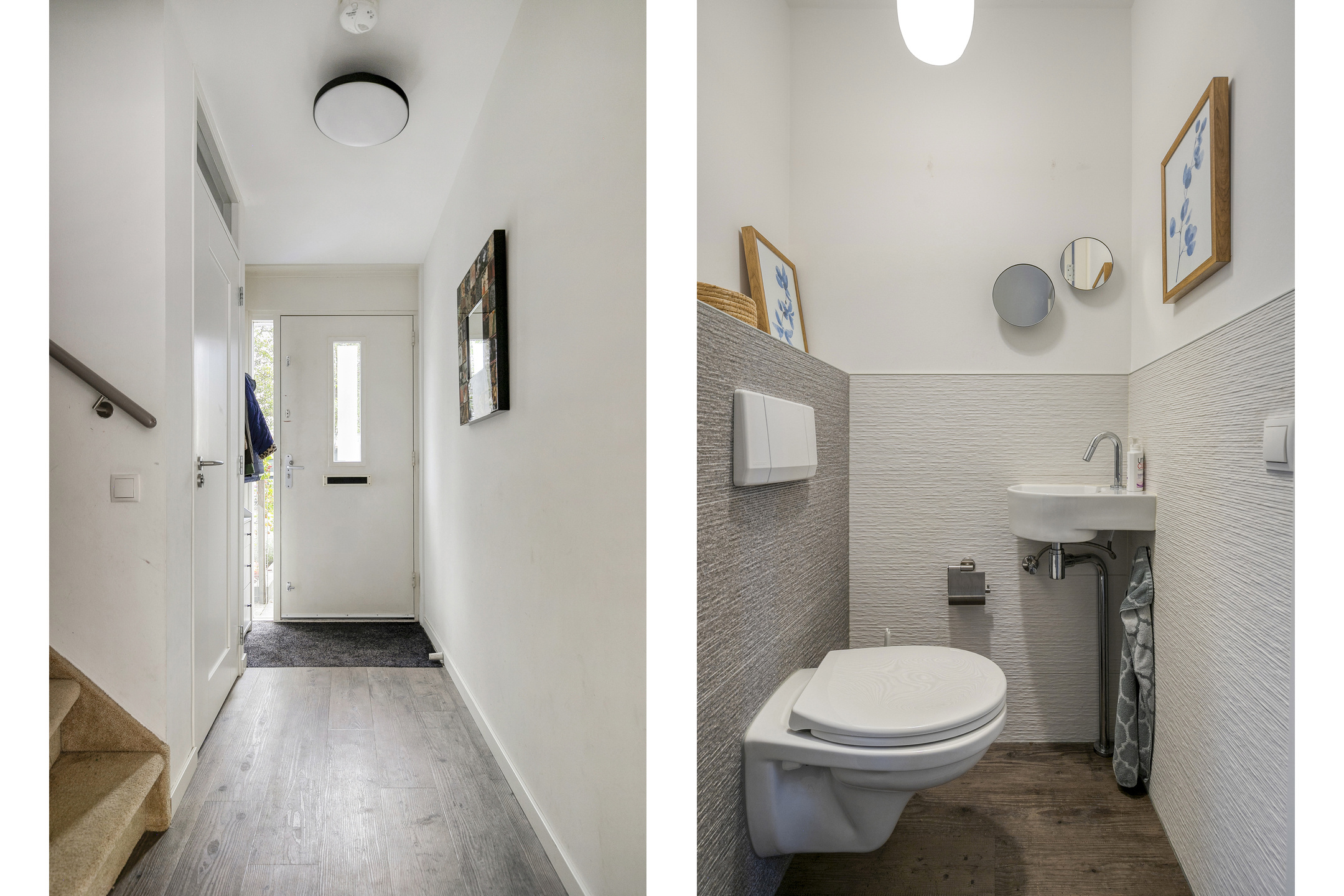 Verzorgde voortuin. Entree met meterkast, modern toilet en trapopgang.