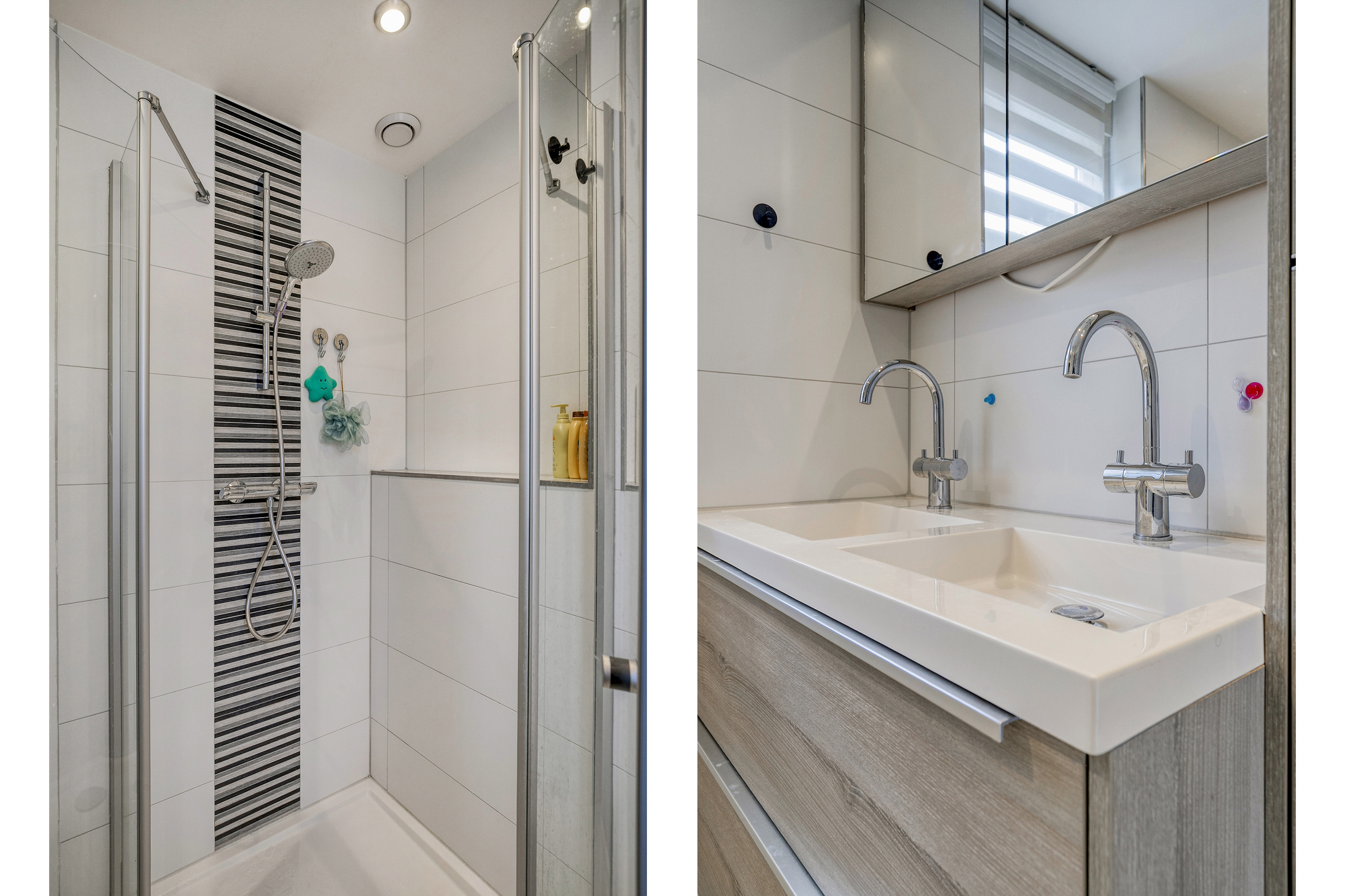 De badkamer is uitgevoerd met een douche, toilet, handdoekradiator en dubbele wastafel met meubel en elektrische vloerverwarming.