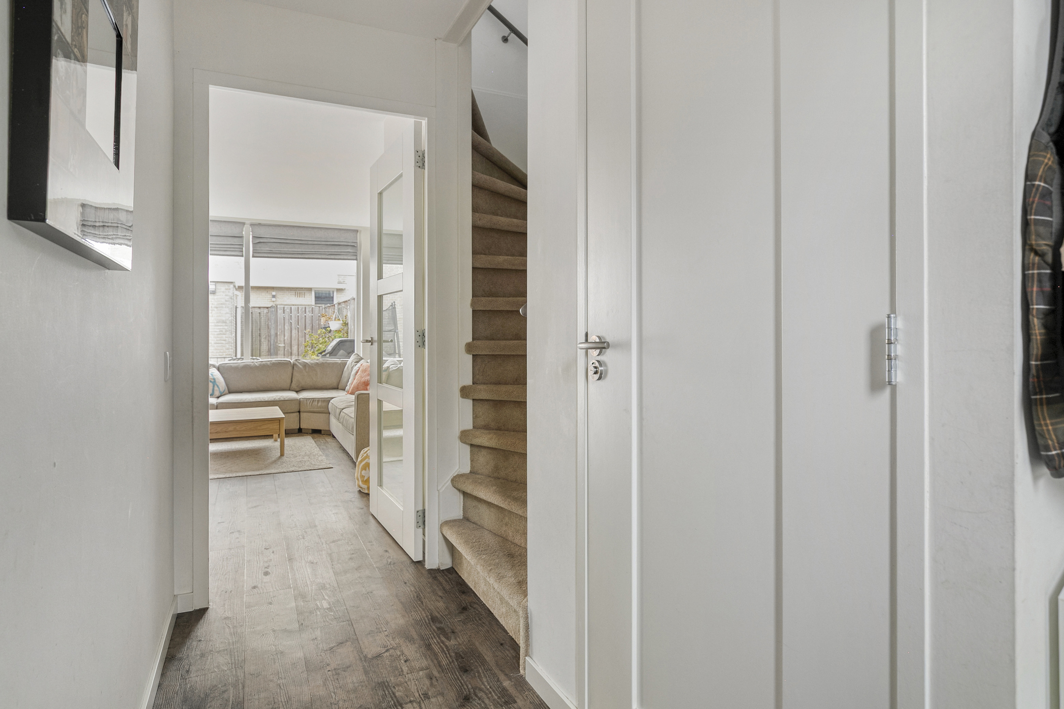 En onder de trap zit een handige bergkast voor het opbergen van de stofzuiger en voor de boodschappen voorraad.