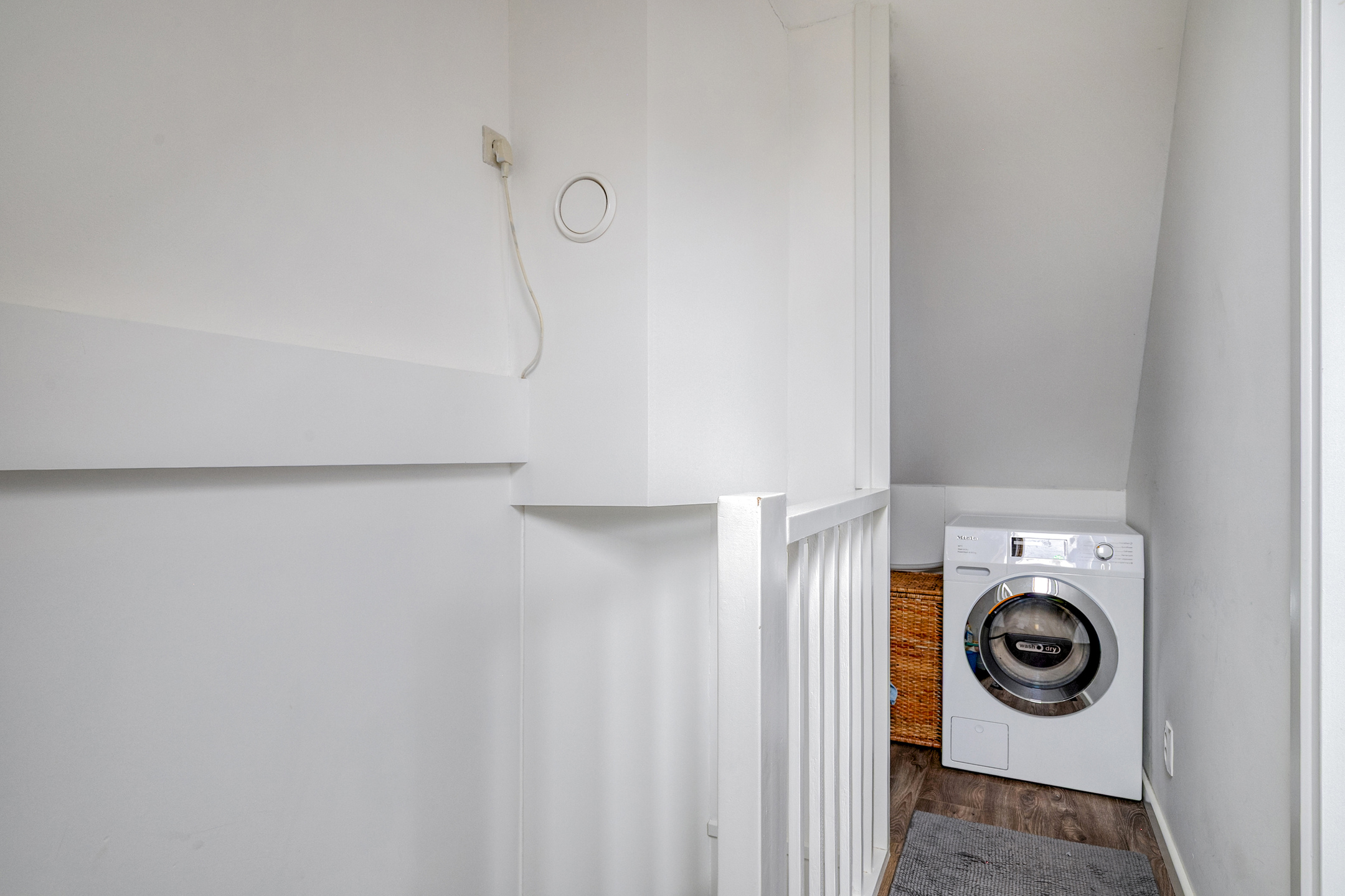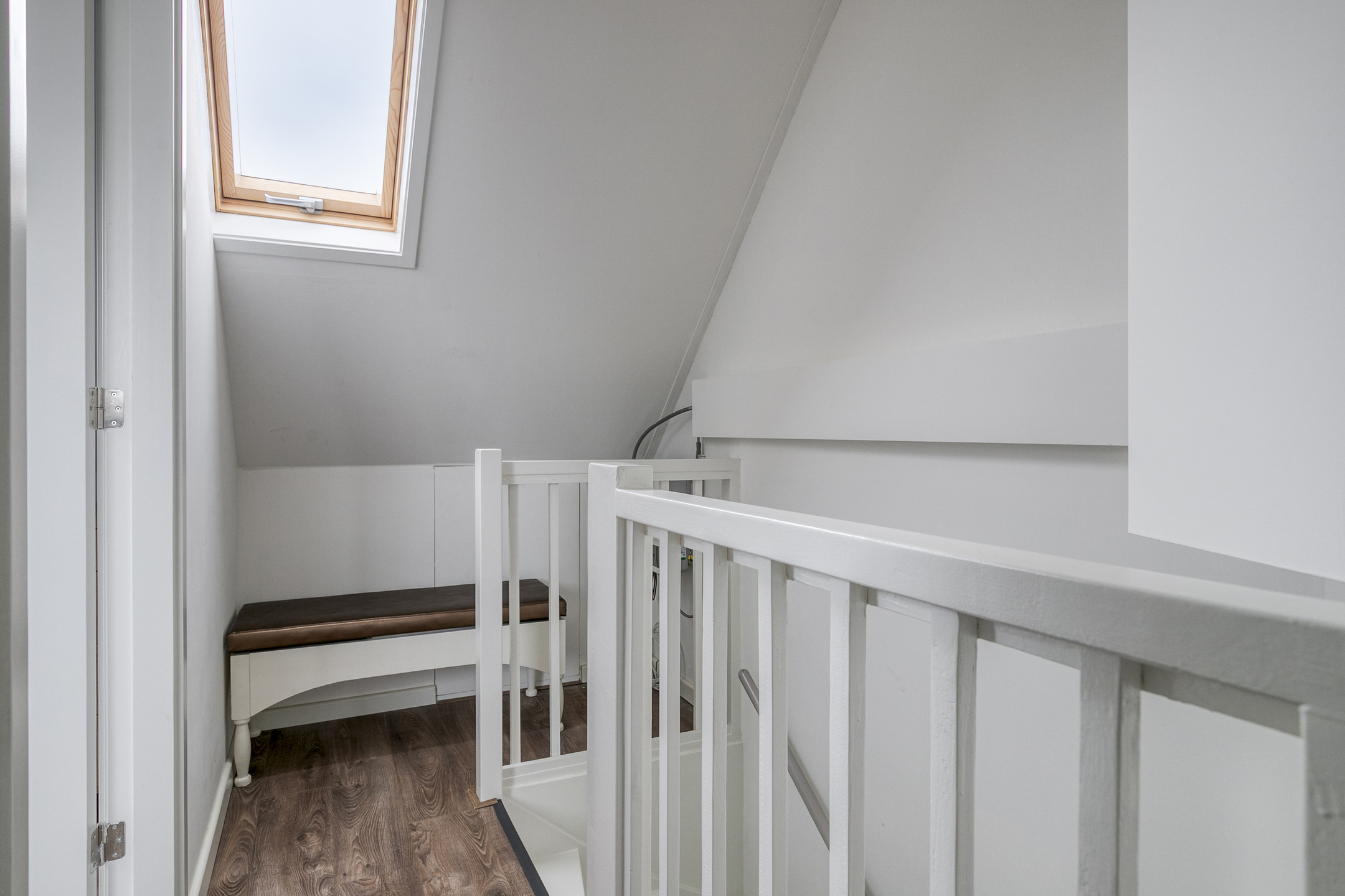 Overloop met dakraam, bergruimte achter de knieschotten en opstelplaats voor de wasmachine, droger en de cv-ketel (2022). Ook bevindt zich hier de omvormer van de zonnepanelen.