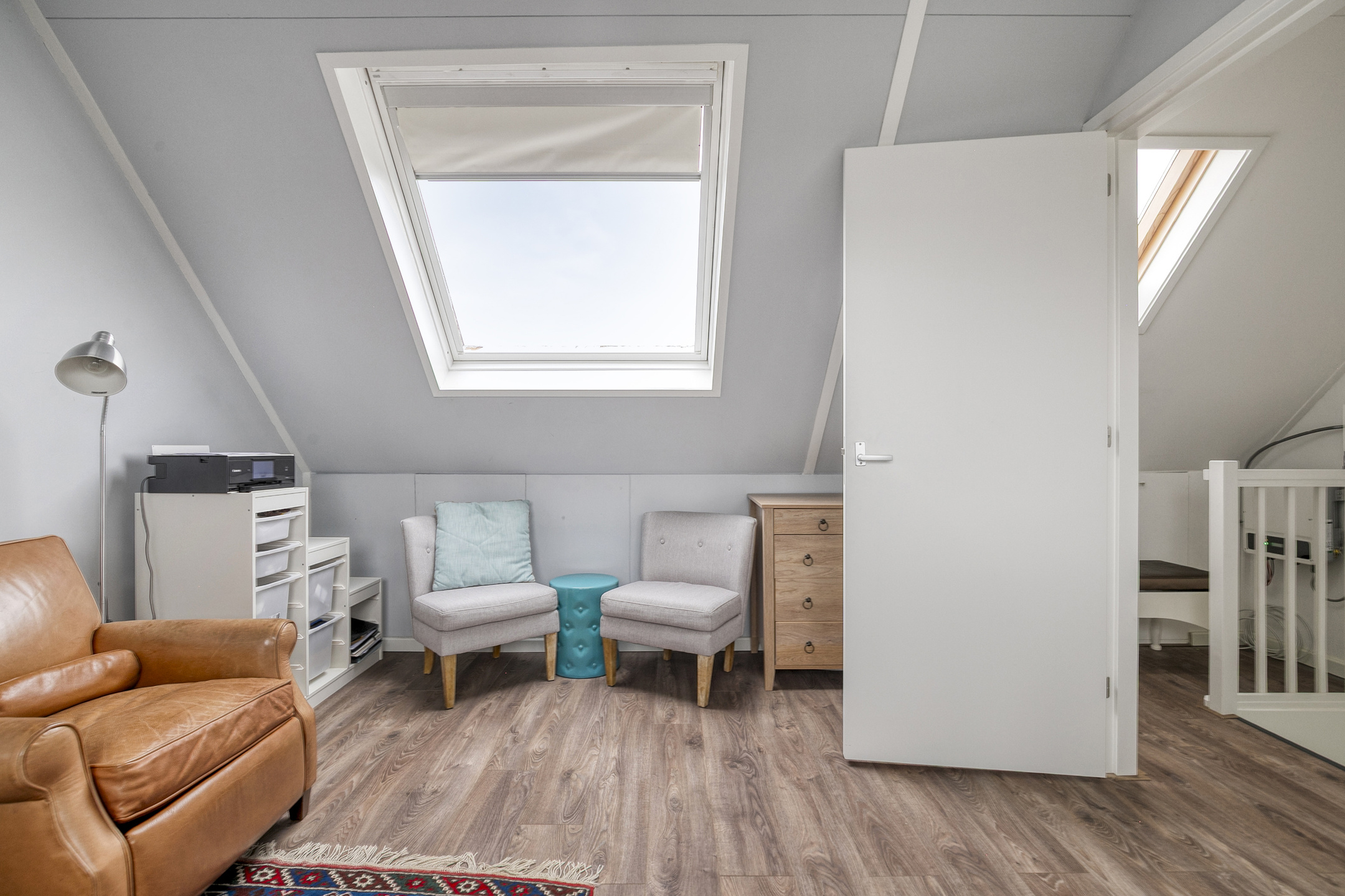 Ruime zolder slaapkamer (nu in gebruik als werkkamer) met aan de voorzijde een dakkapel met kunststof kozijnen en aan de achterzijde een groot dakraam.
