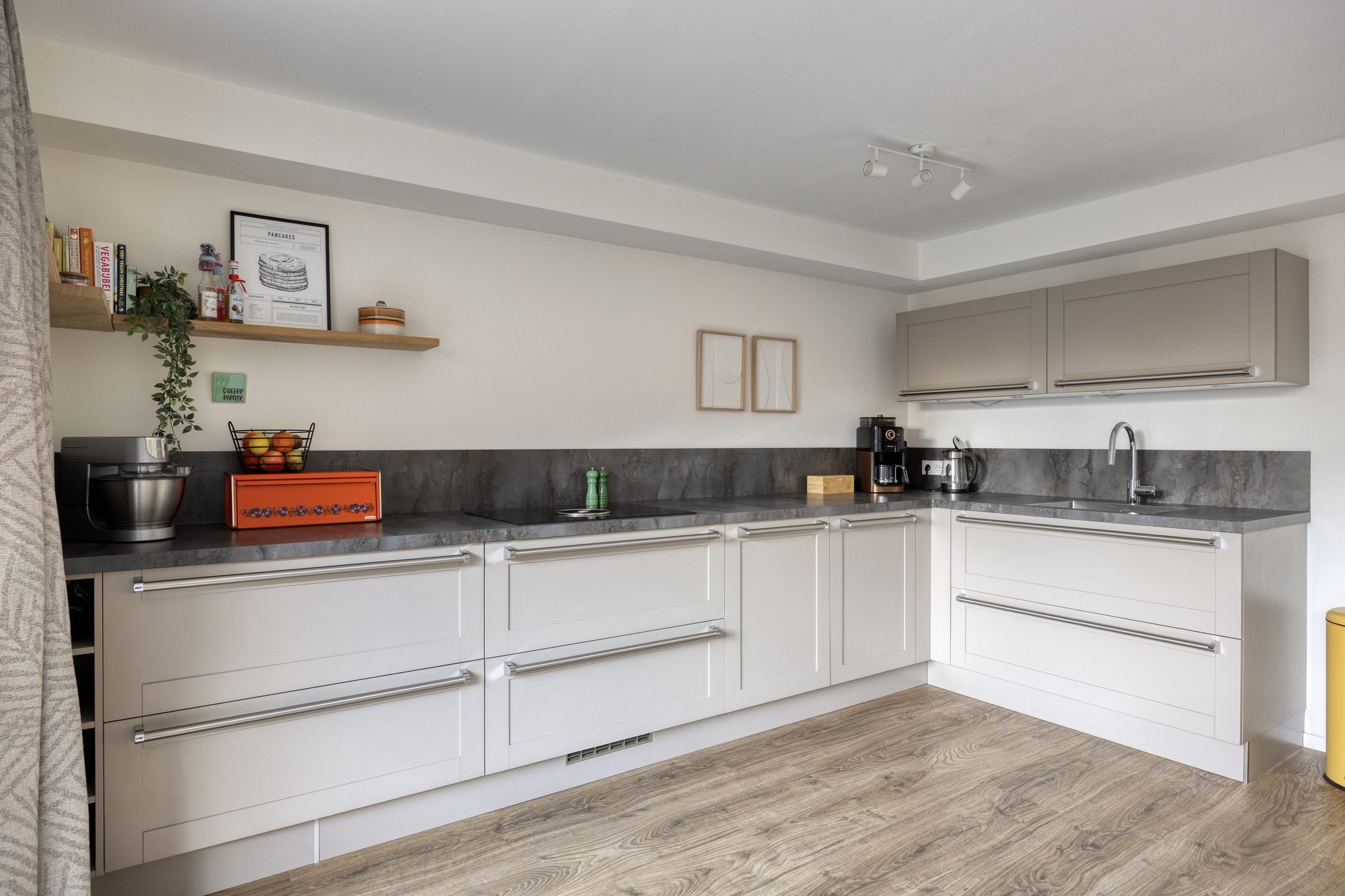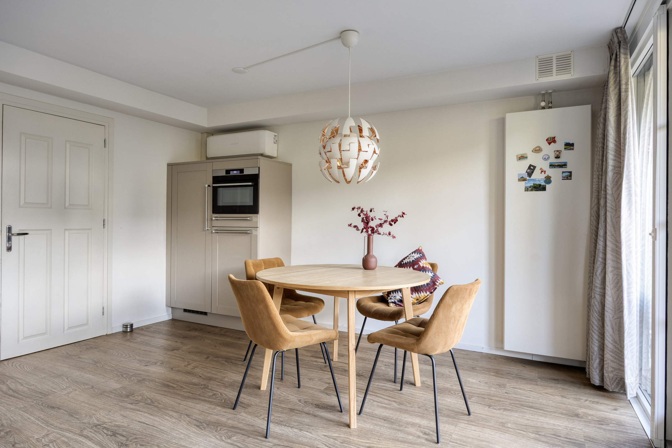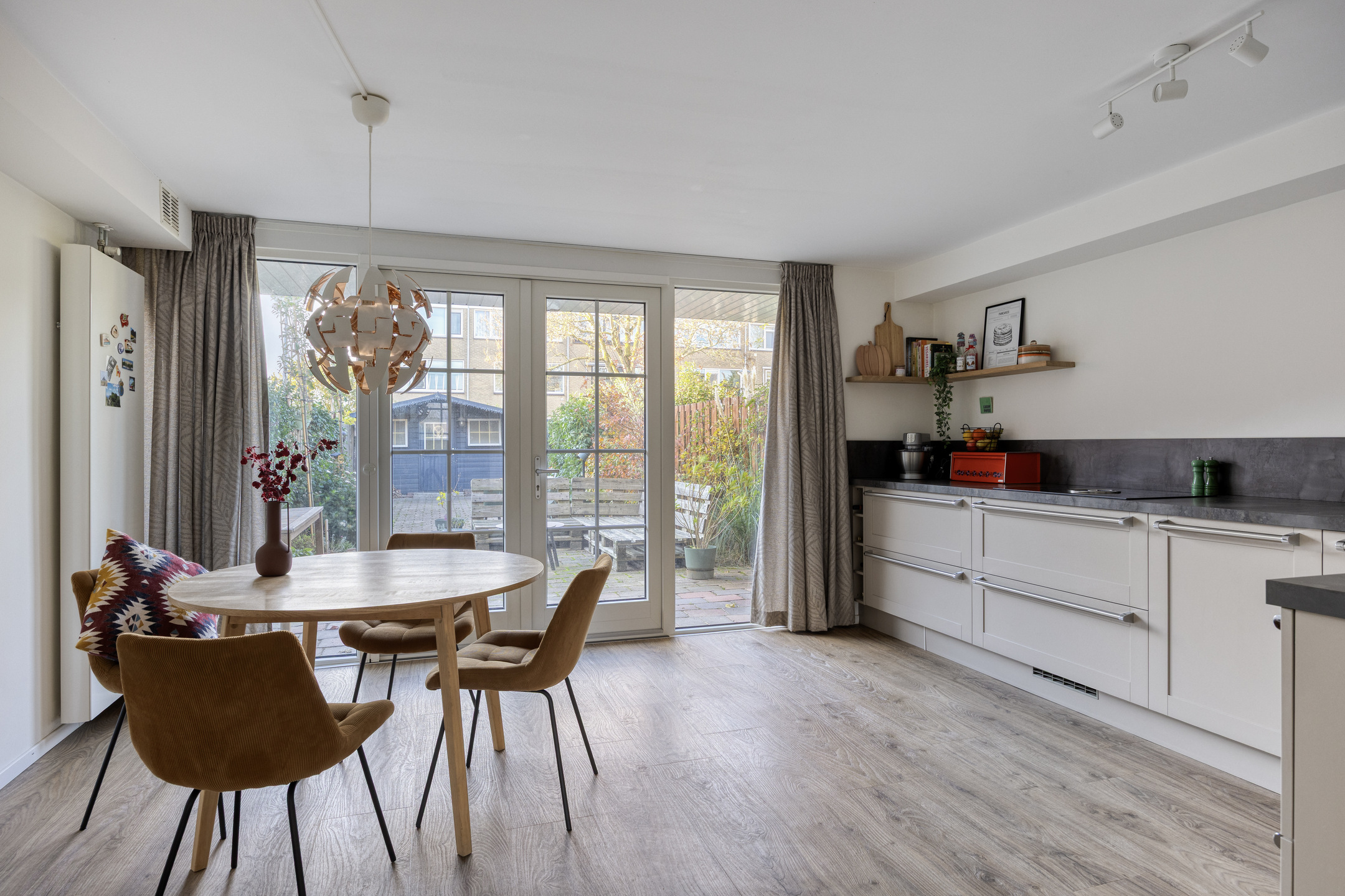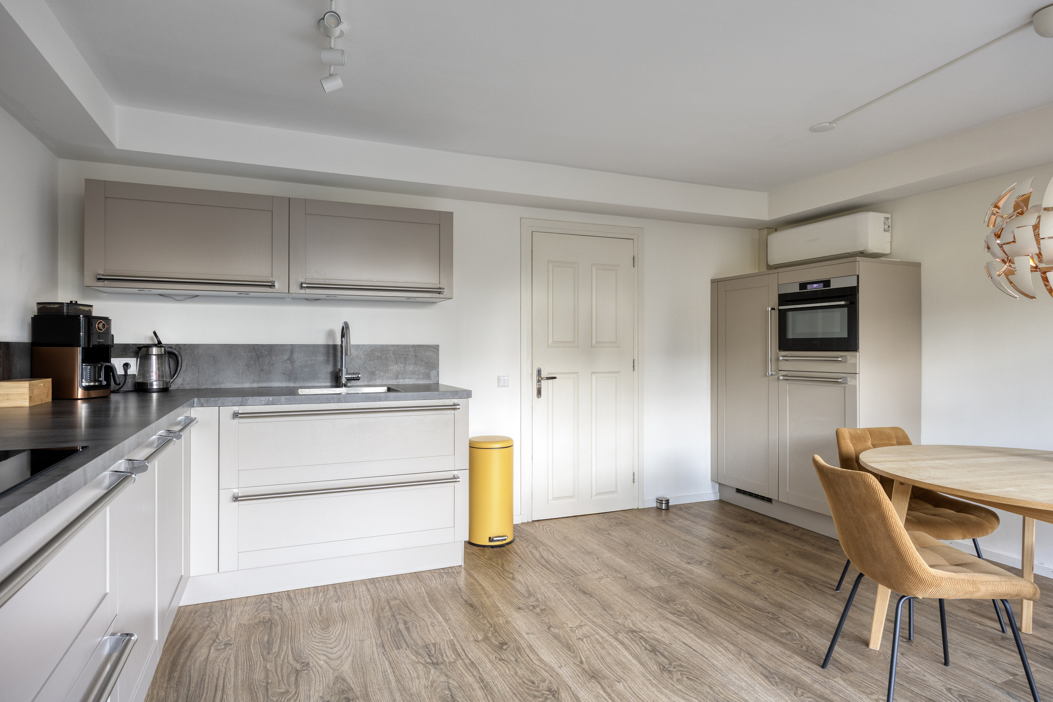 Aan de achterzijde ligt de sfeervolle woonkeuken met openslaande deuren naar de tuin. De keuken is voorzien van diverse inbouwapparatuur, waaronder een combi-oven, Bora inductie downdraft, vaatwasser, koelkast en vriezer. Op de begane grond is ook een airconditioning aanwezig die zowel koelt als verwarmt.