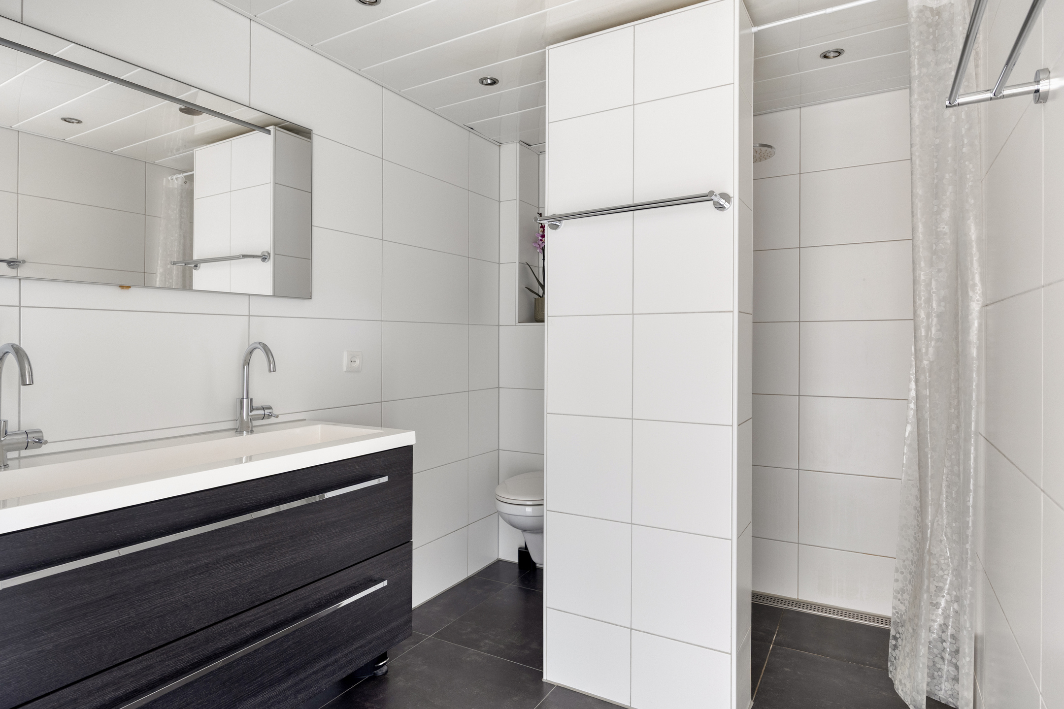 De badkamer is voorzien van een dubbele wastafel, toilet en een ruime inloopdouche.