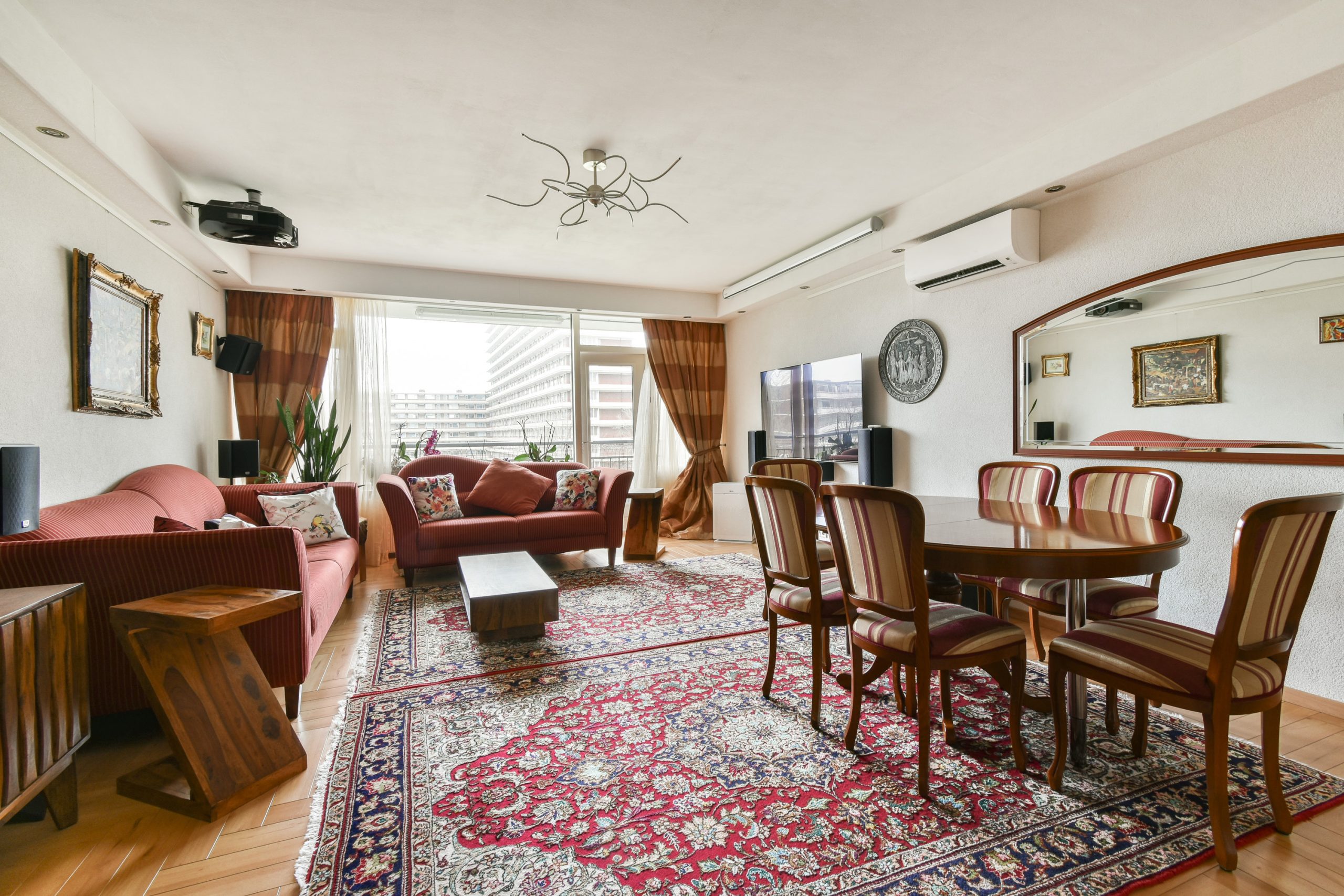 De ruime en lichte woonkamer is voorzien van airconditioning met een koel- én verwarmingsfunctie en een laminaatvloer. Vanuit de woonkamer is er toegang tot het ruime balkon, dat zich over de volledige breedte van het appartement uitstrekt.