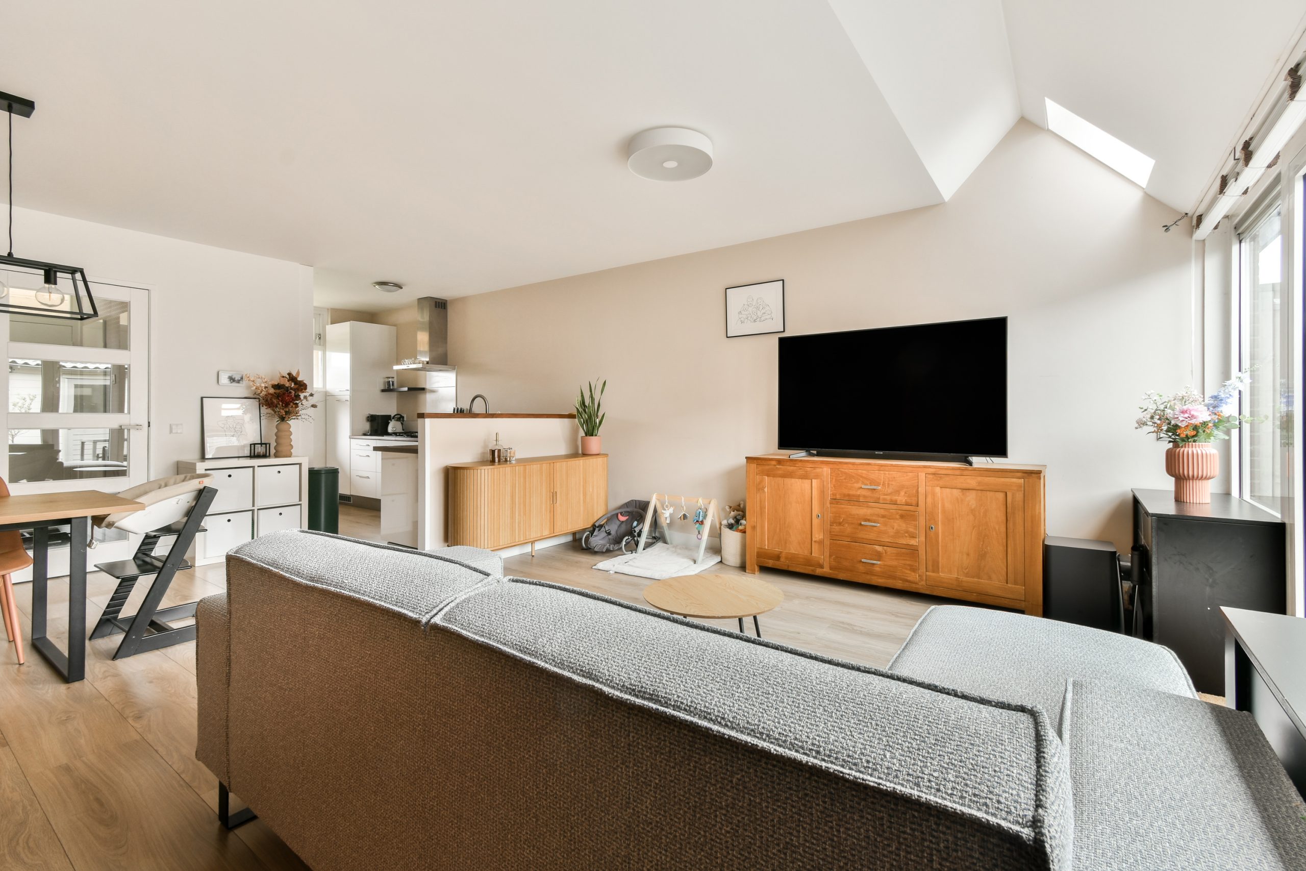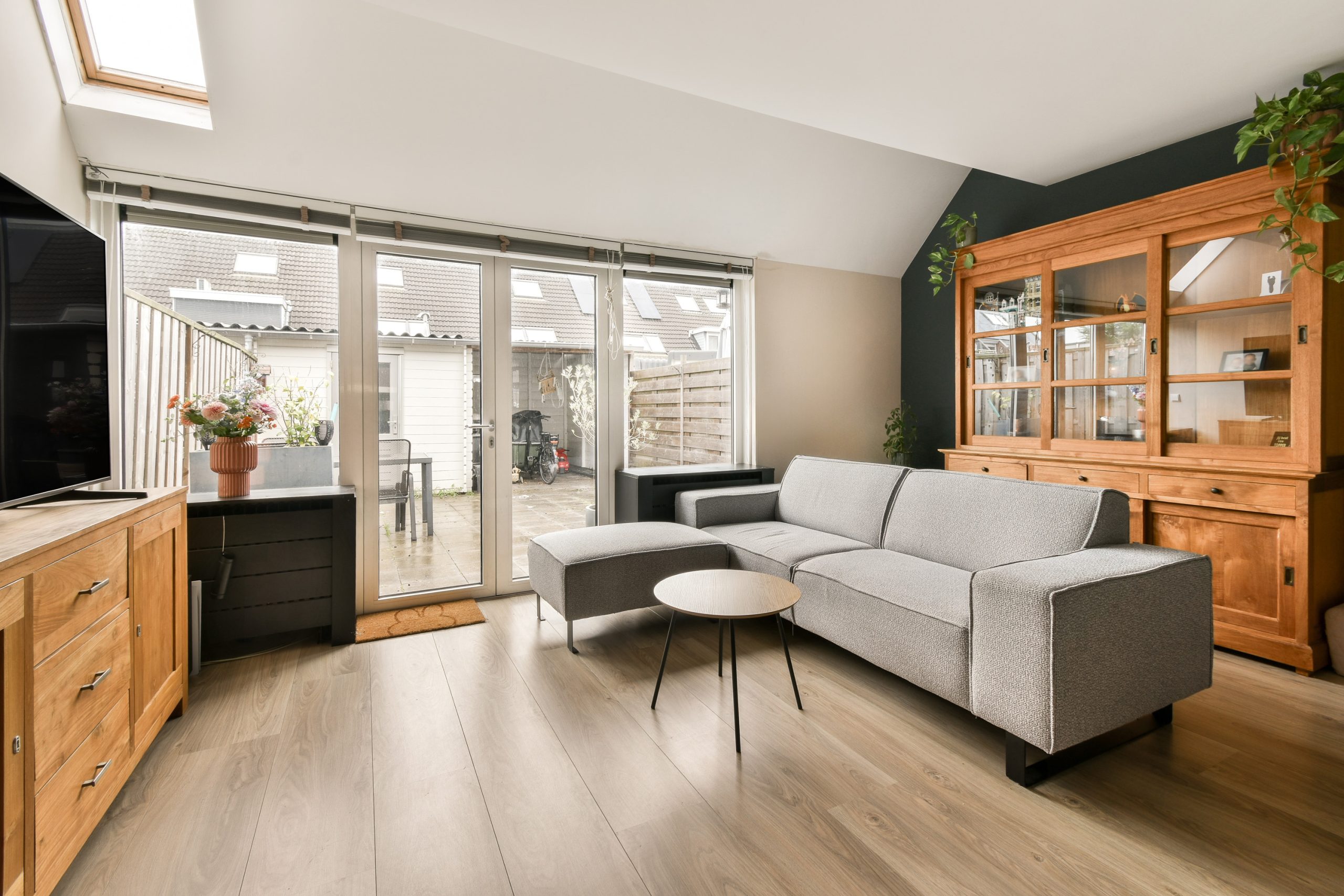 De ruime en lichte woonkamer is voorzien van een laminaatvloer en een dakraam dat zorgt voor extra daglicht. Aan de achterzijde van de woning zijn kunststof kozijnen geplaatst. Vanuit de woonkamer geven de openslaande deuren toegang tot de op het westen gelegen, onderhoudsvriendelijke achtertuin.