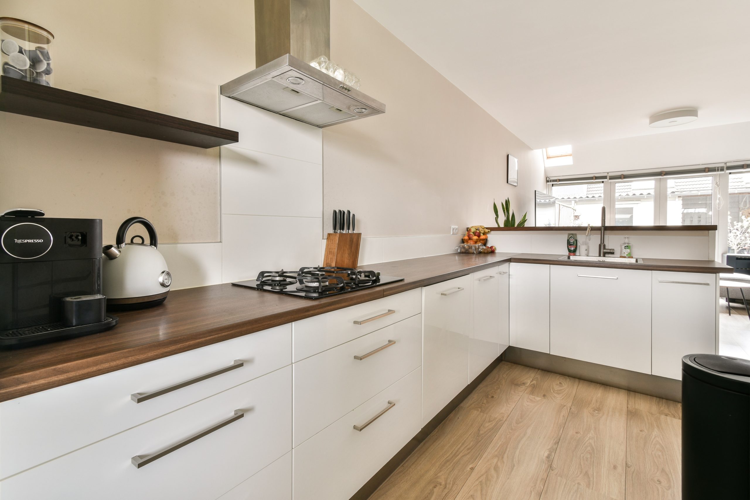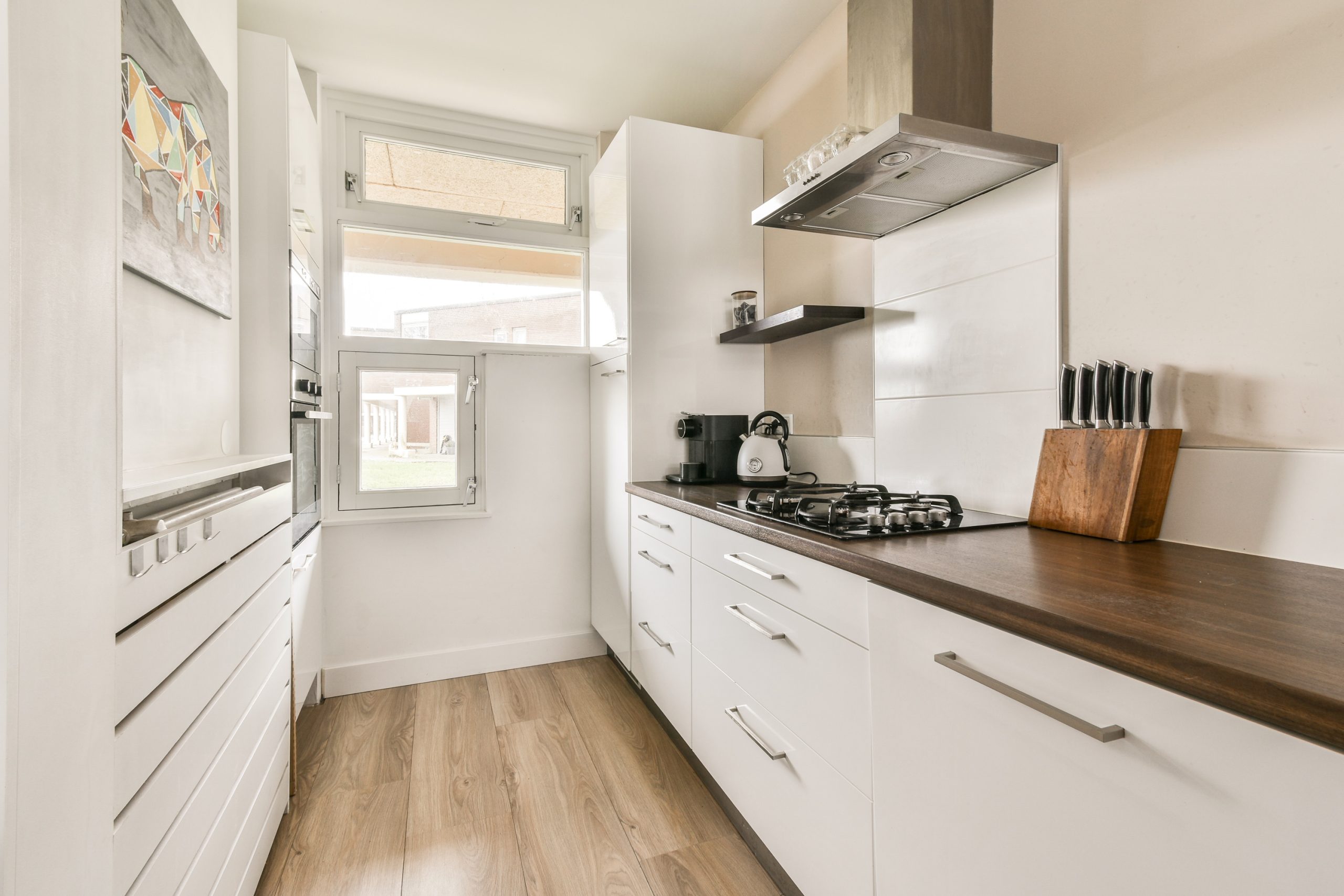 Aan de voorzijde van de woning bevindt zich de moderne keuken. De keuken is voorzien van diverse inbouwapparatuur zoals een 4-pits gasfornuis, oven, magnetron, koelkast met vriesvak, vaatwasser en afzuigkap.