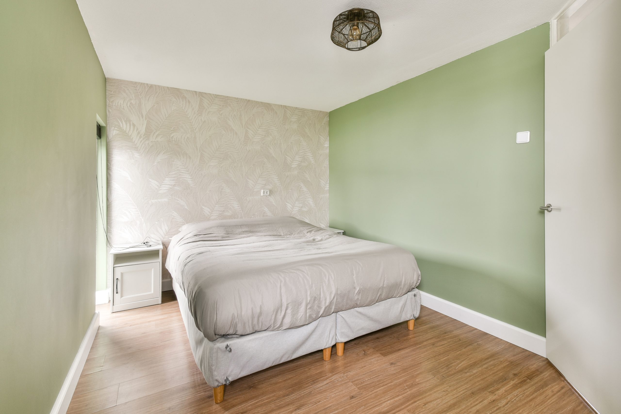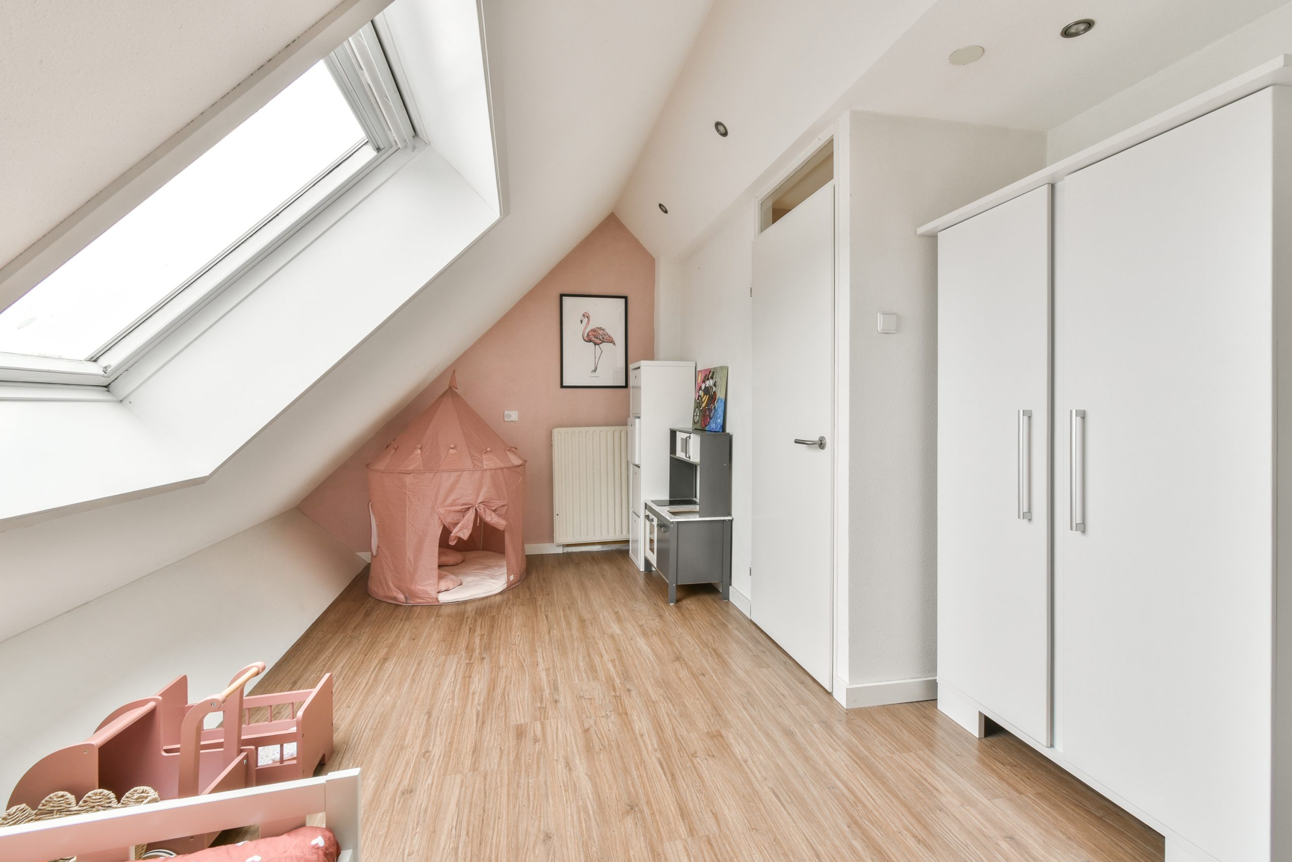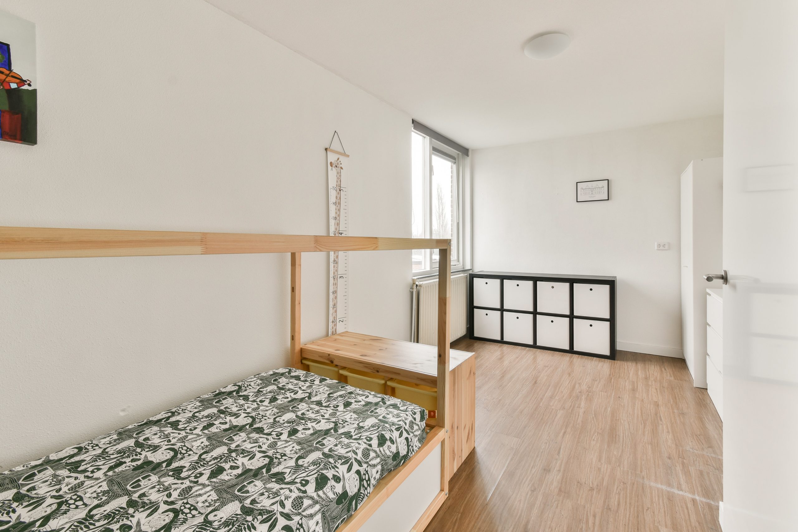 Slaapkamer 5: gelegen aan de voorzijde, voorzien van houten kozijnen met HR++ glas. De mechanische ventilatie bevindt zich achter de wand tussen de slaapkamers.