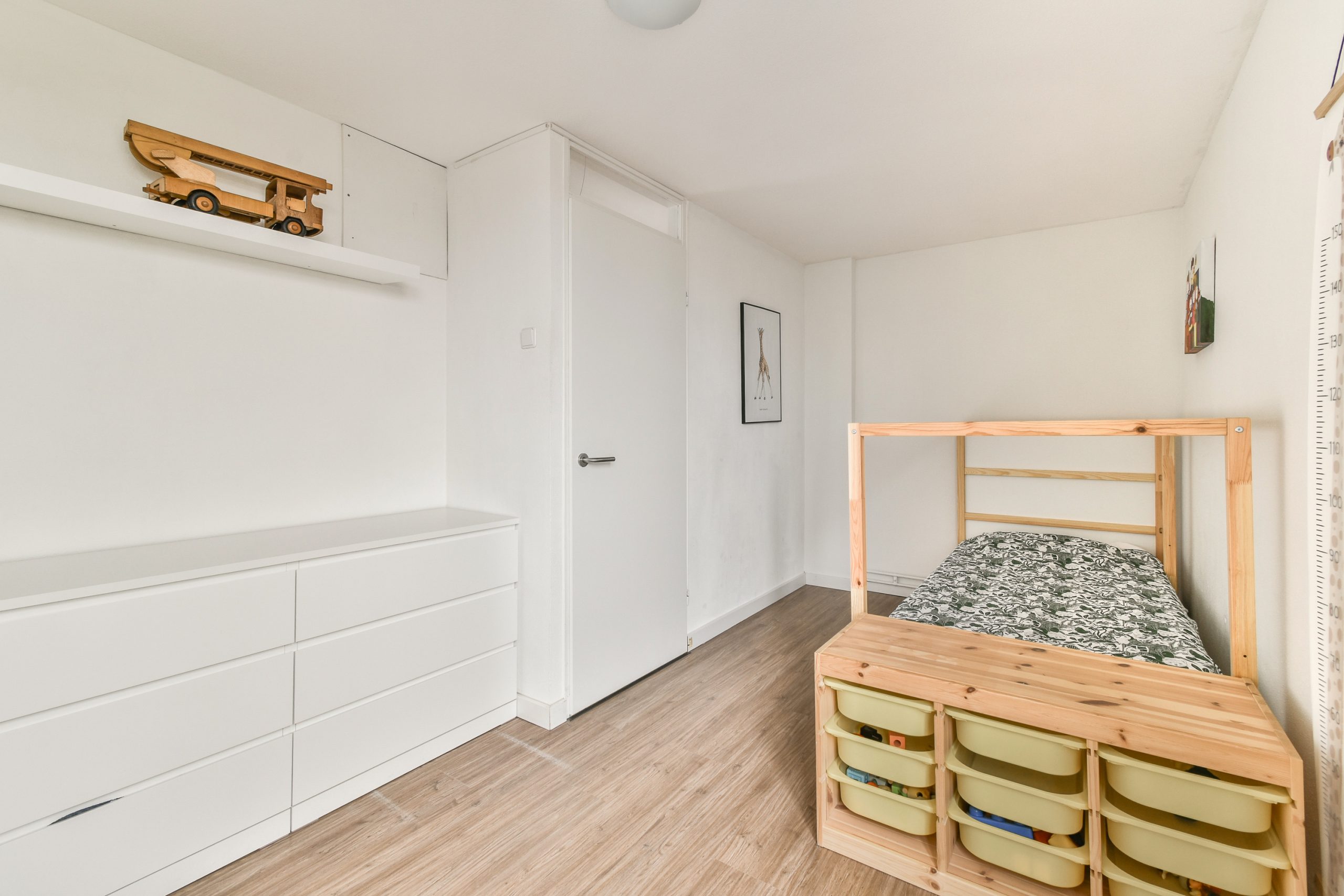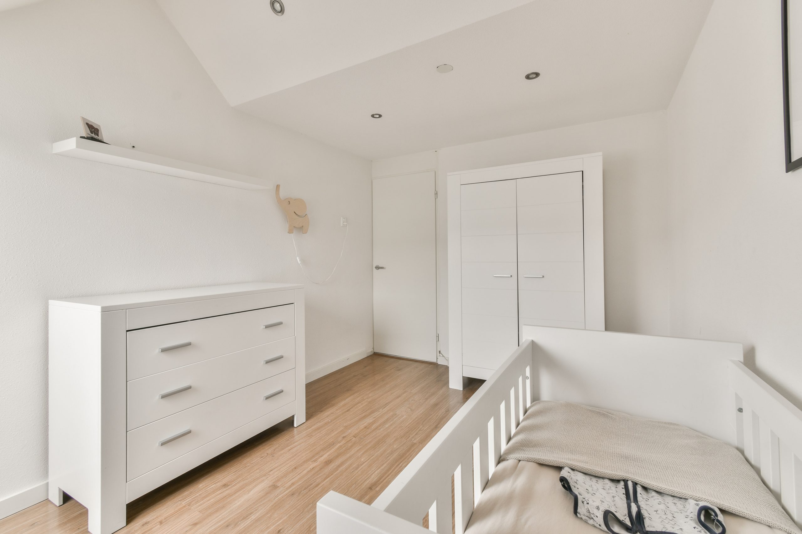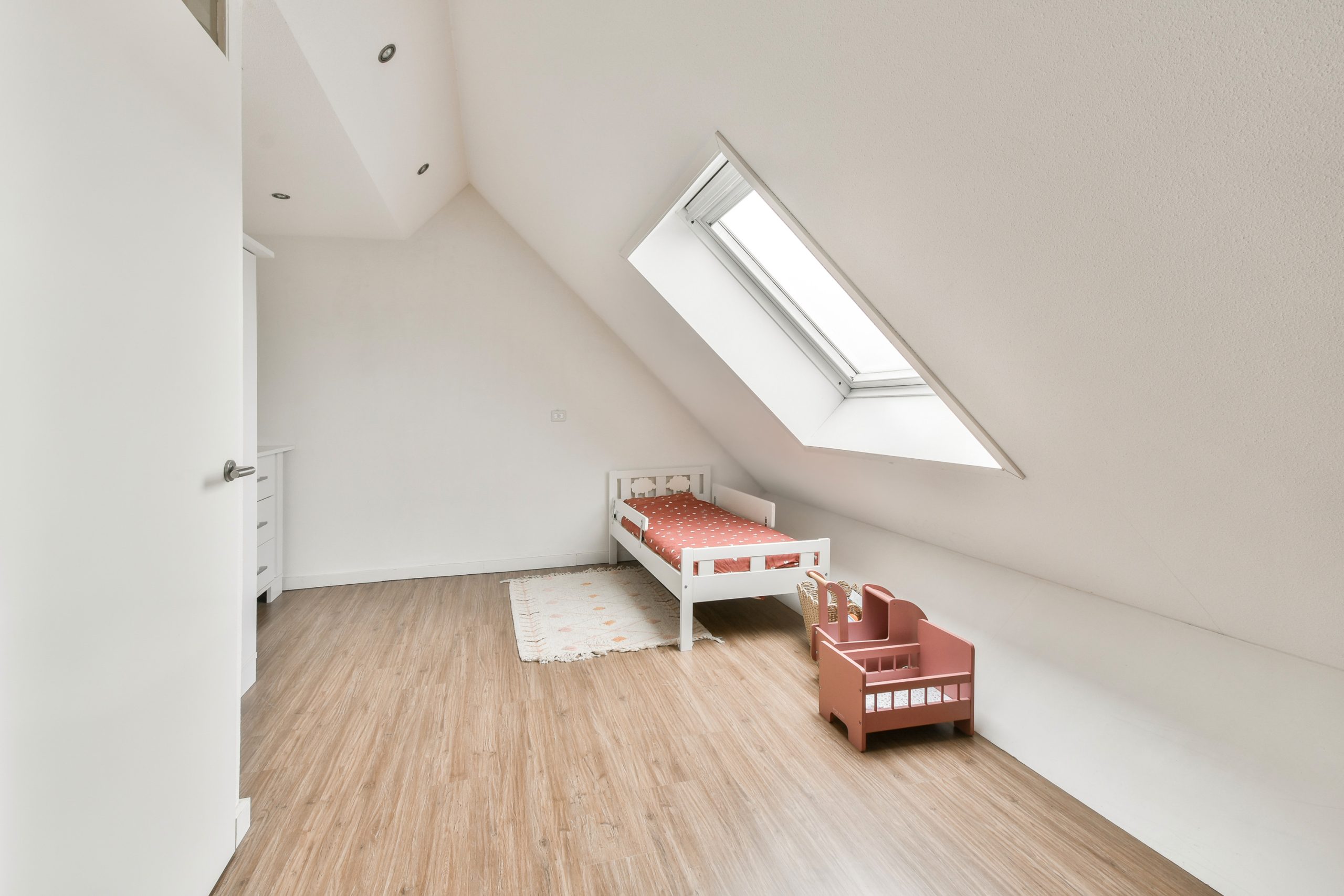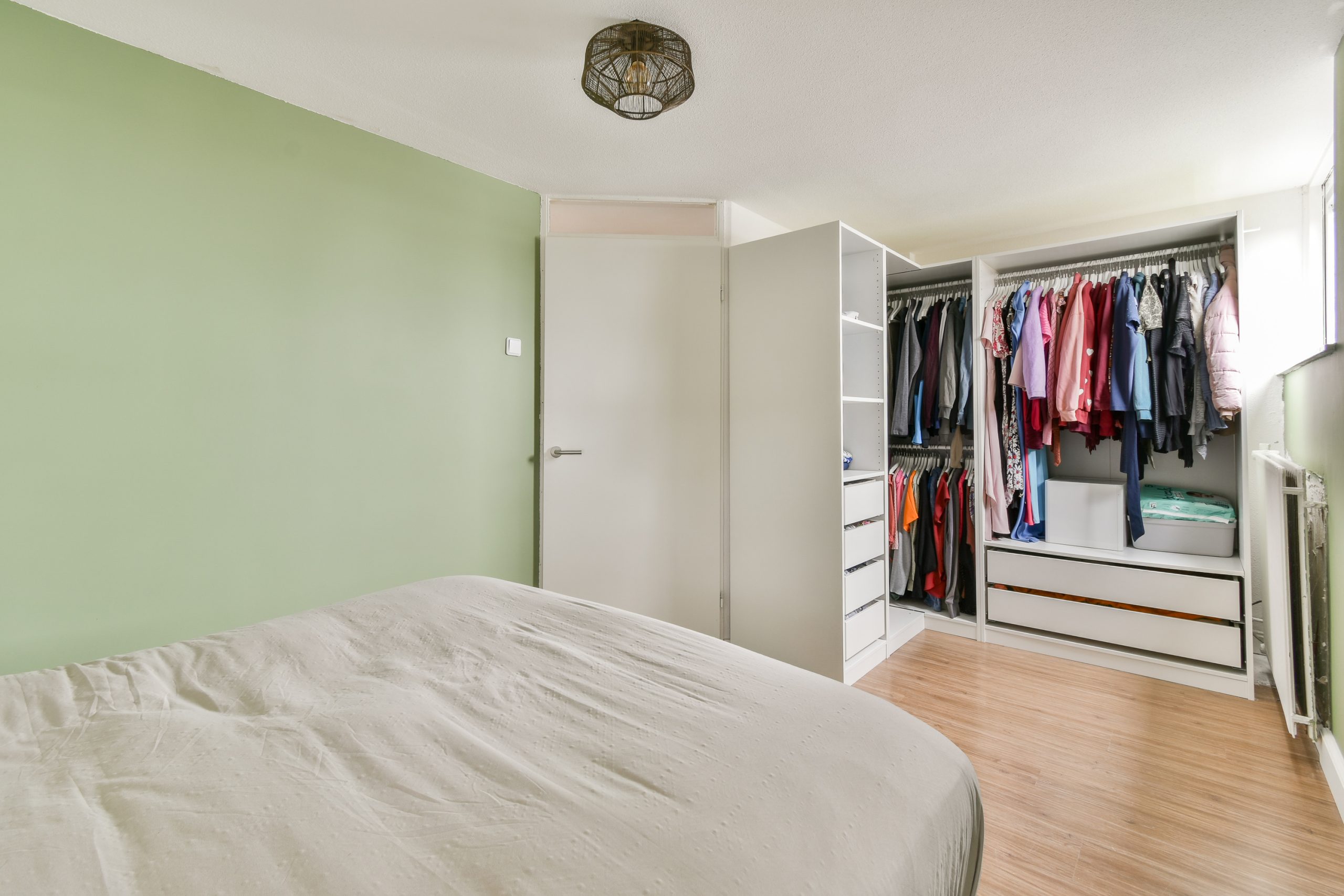Slaapkamer 5: gelegen aan de voorzijde, voorzien van houten kozijnen met HR++ glas. De mechanische ventilatie bevindt zich achter de wand tussen de slaapkamers.