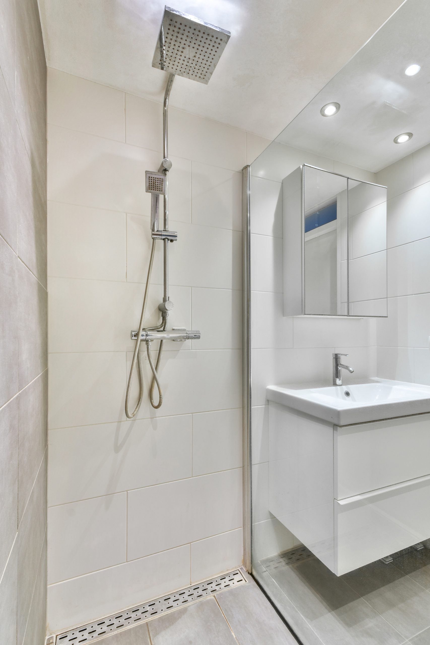 De badkamer beschikt over een wastafelmeubel, inloopdouche, toilet en vloerverwarming.
