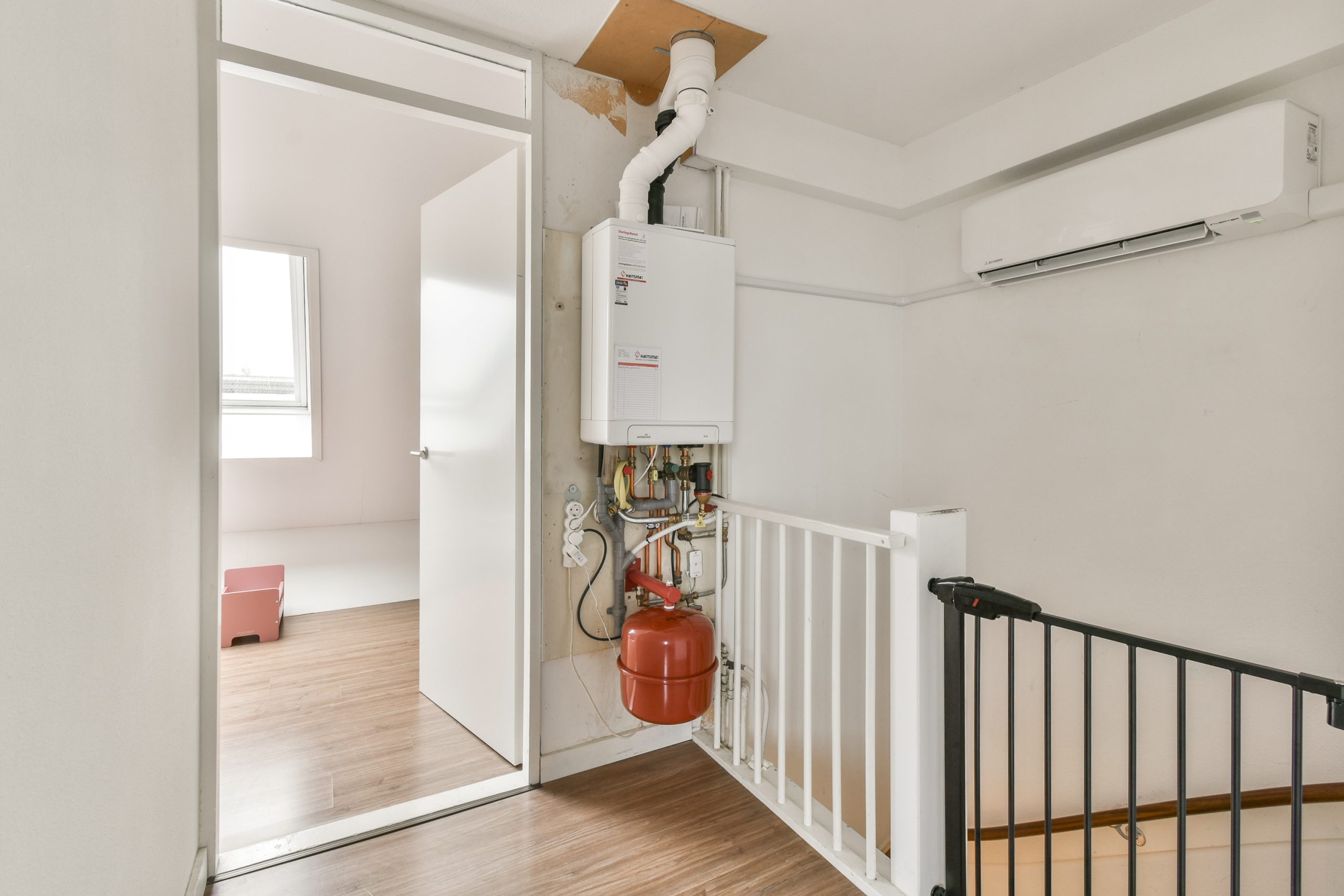Overloop met een airco-unit boven het trapgat, welke kan koelen en verwarmen. Hier bevinden zich tevens de CV-ketel en installaties, geplaatst in april 2025. Vanuit de overloop is er toegang tot twee slaapkamers.