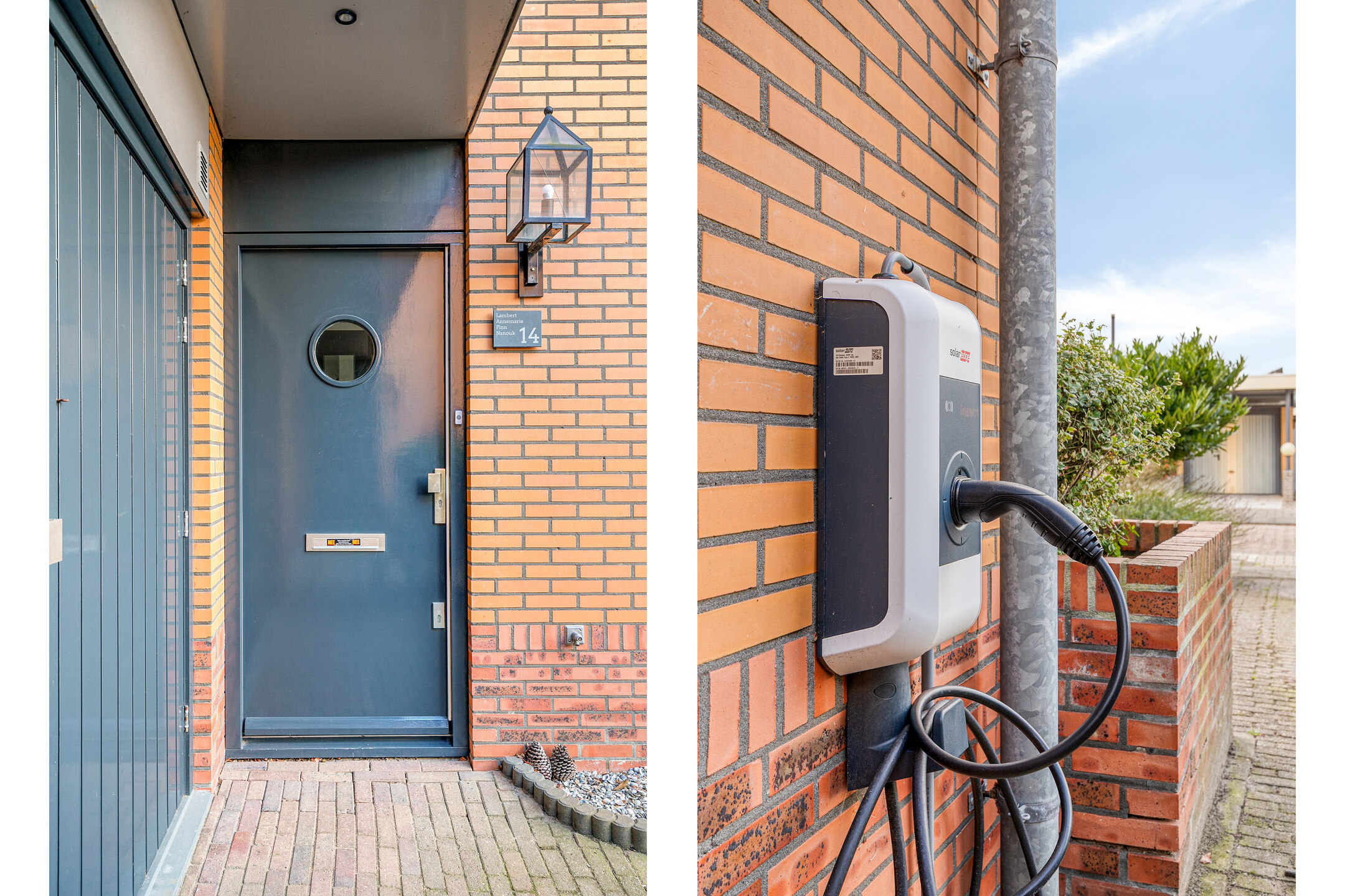De oprit biedt ruimte voor één auto en beschikt over een oplaadpunt voor elektrische voertuigen. Vanuit hier is de ruime (18m2) garage bereikbaar.