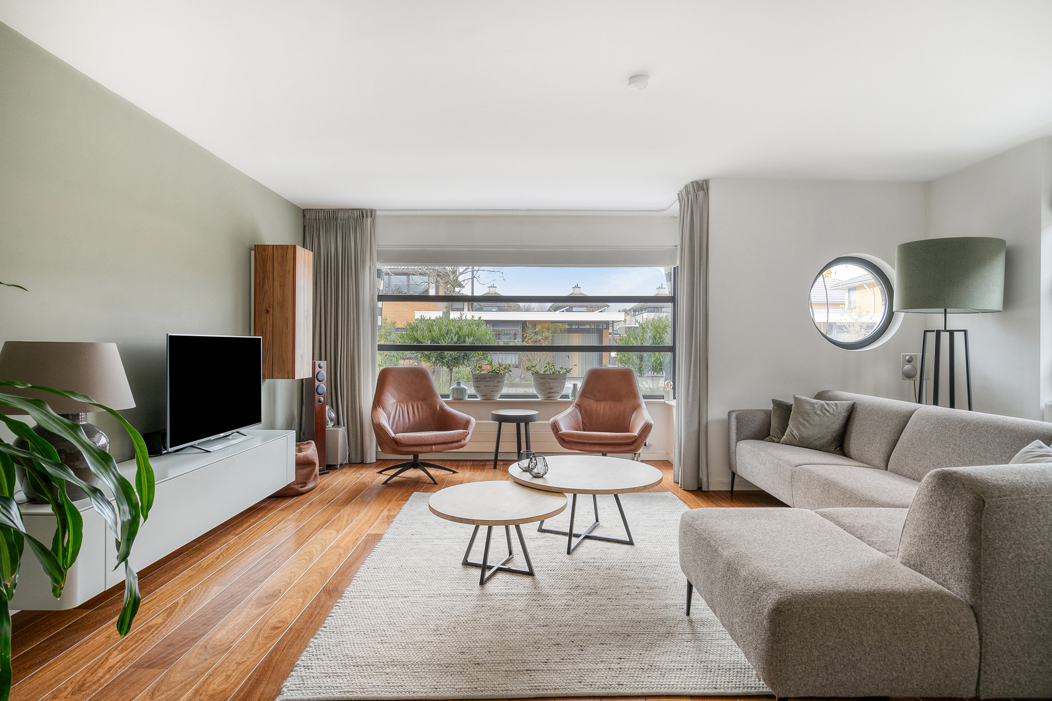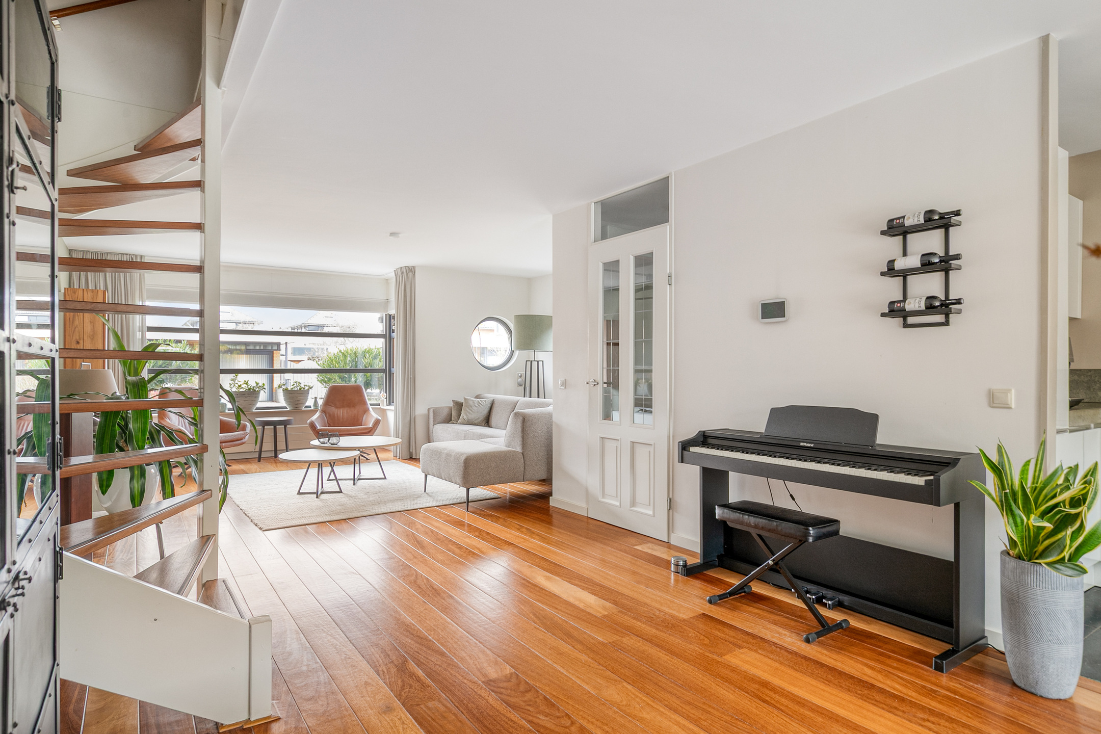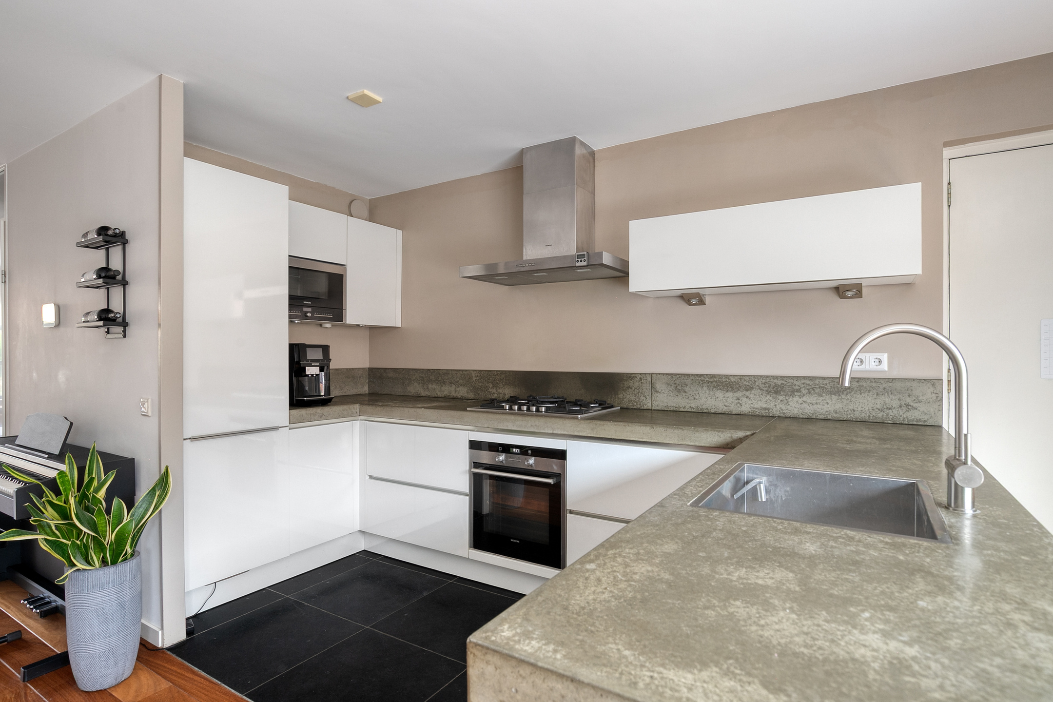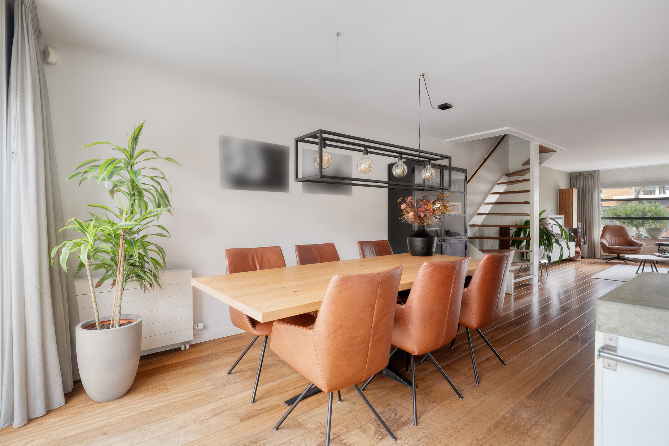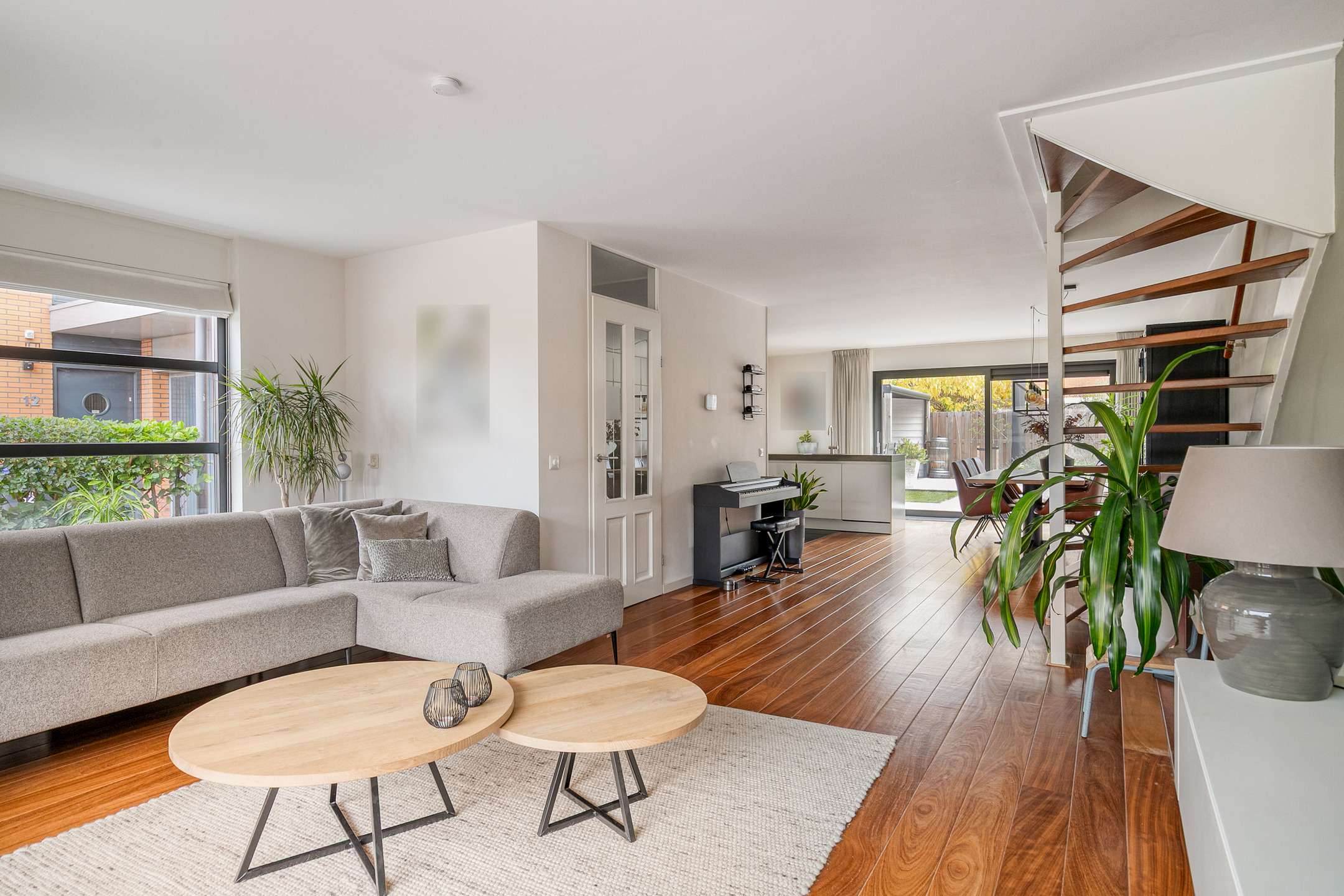 De lichte, sfeervolle en uitgebouwde woonkamer beschikt over een erker aan de voorzijde met een markies en een massief houten vloer. Aan de achterzijde bevindt zich de open keuken die is voorzien van diverse inbouwapparatuur, waaronder een vaatwasser, gasfornuis, afzuigkap, oven, magnetron, koel-vriescombinatie en een spoelbak met mengkraan.