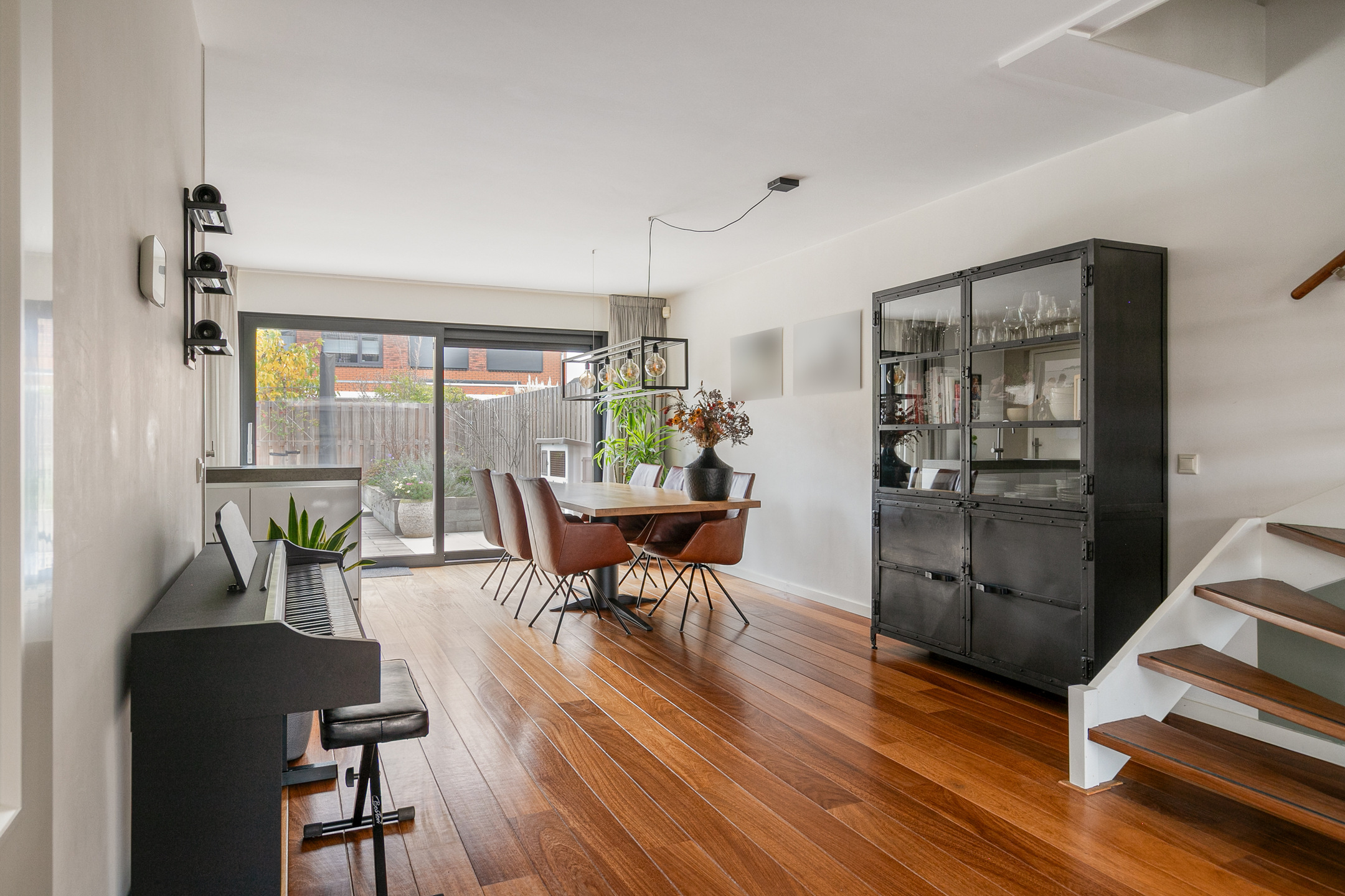 Via de aluminium schuifpui bereik je de achtertuin, uitgerust met een elektrisch zonnescherm.