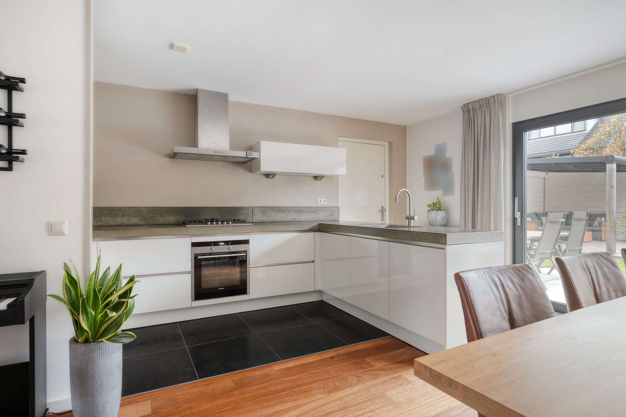 Via de keuken is de garage bereikbaar. Hier bevinden zich de aansluitingen voor wasmachine en droger en tevens toegang tot de achtertuin.