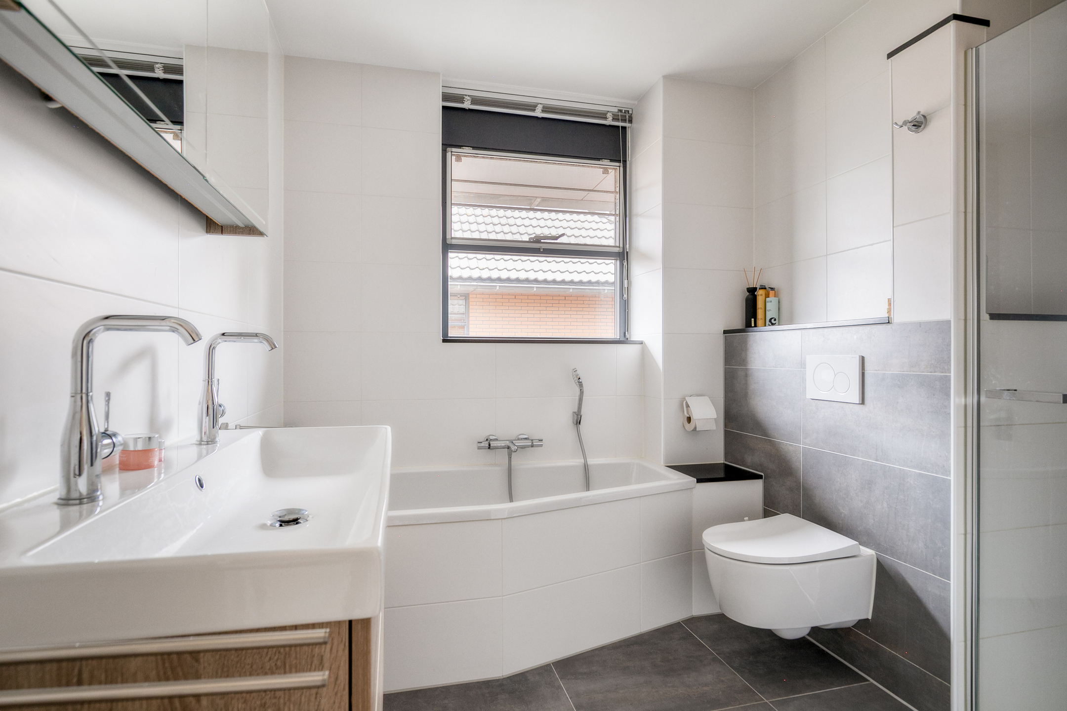 De moderne badkamer is uitgerust met een ligbad, dubbele wastafel, toilet en douche.