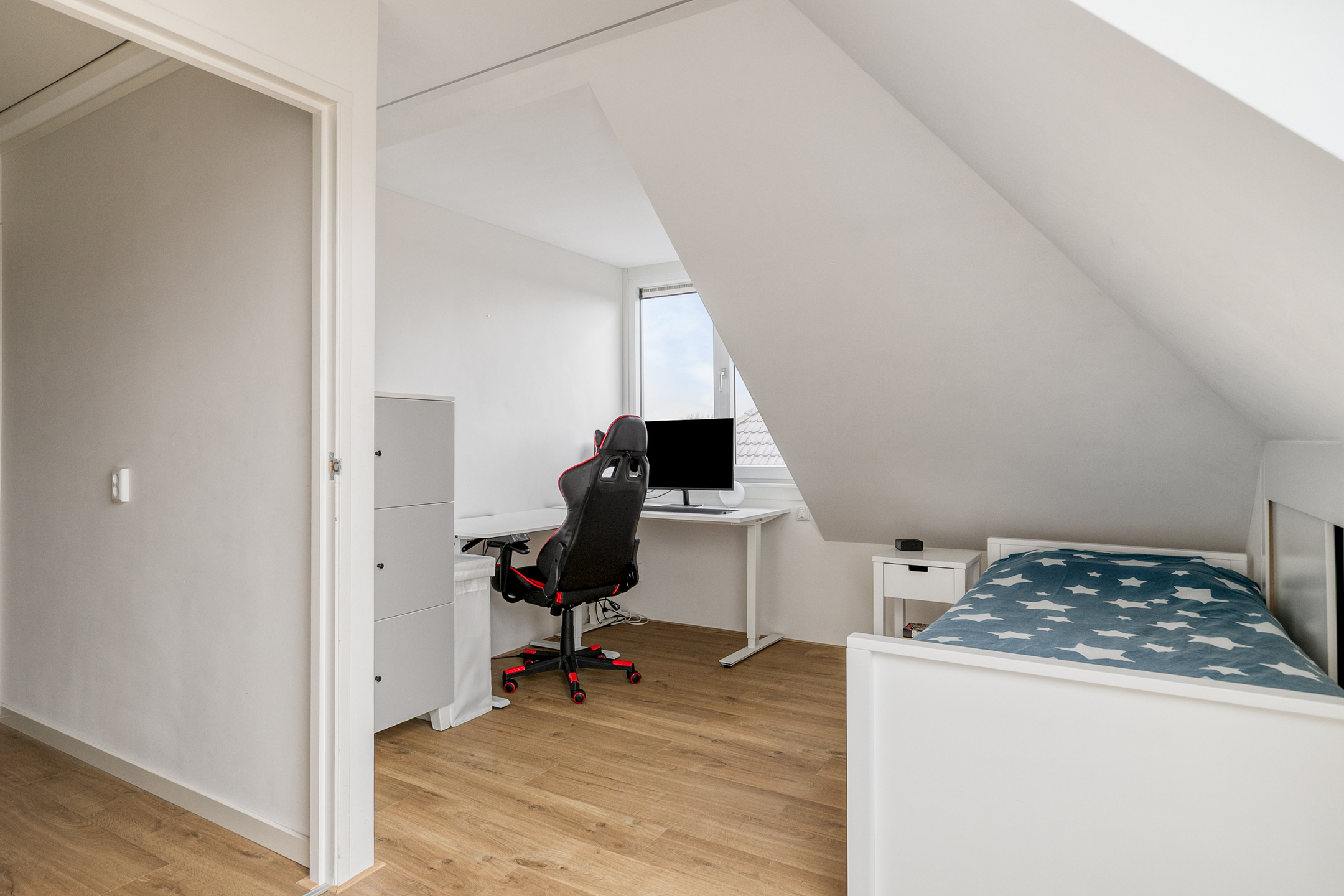 Slaapkamer 5, gelegen aan de achterzijde, is uitgerust met een Velux Cabrio dakraam dat opent tot een mini-balkon, een echte eyecatcher, perfect om in het zonnetje te genieten van het uitzicht over de tuin.