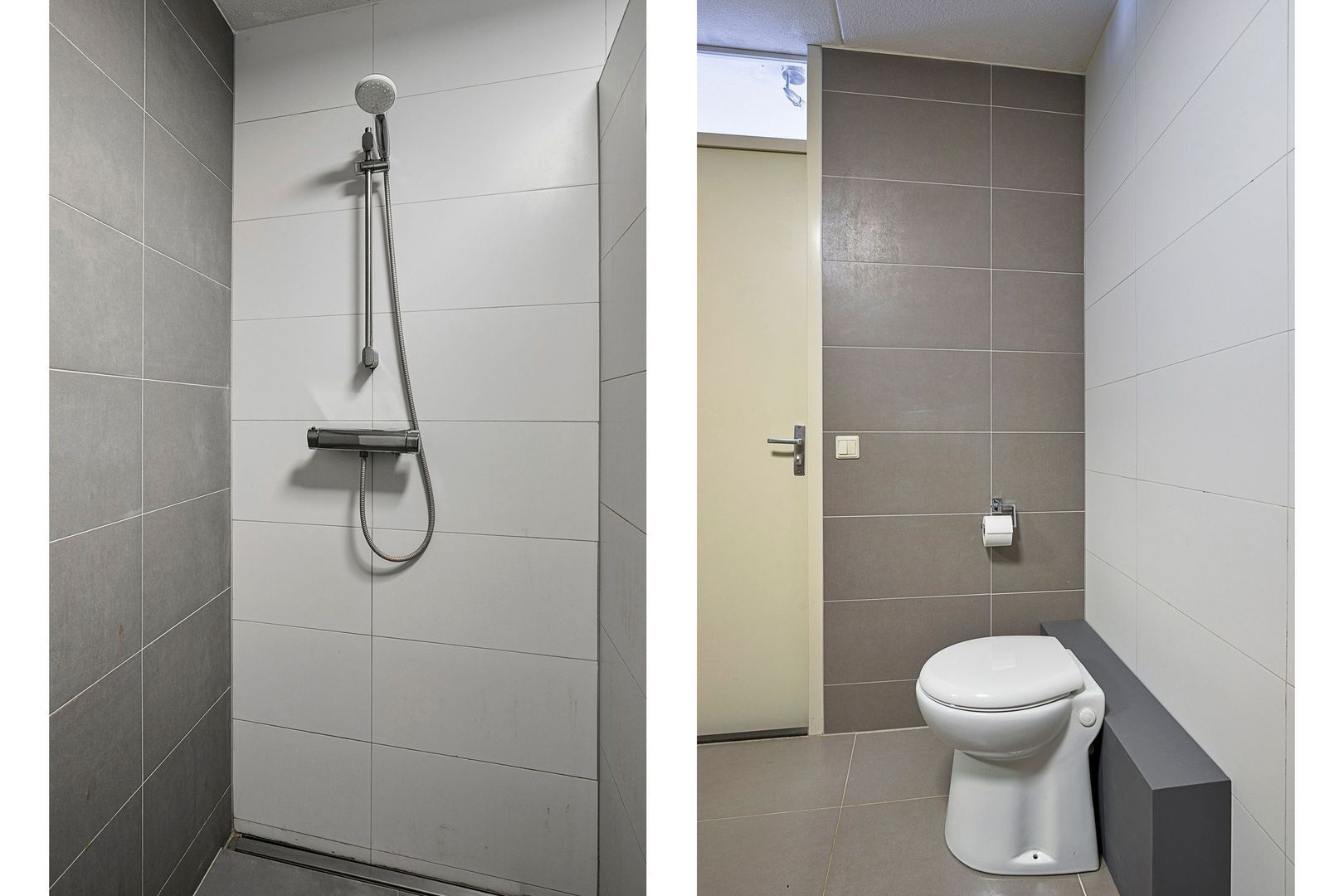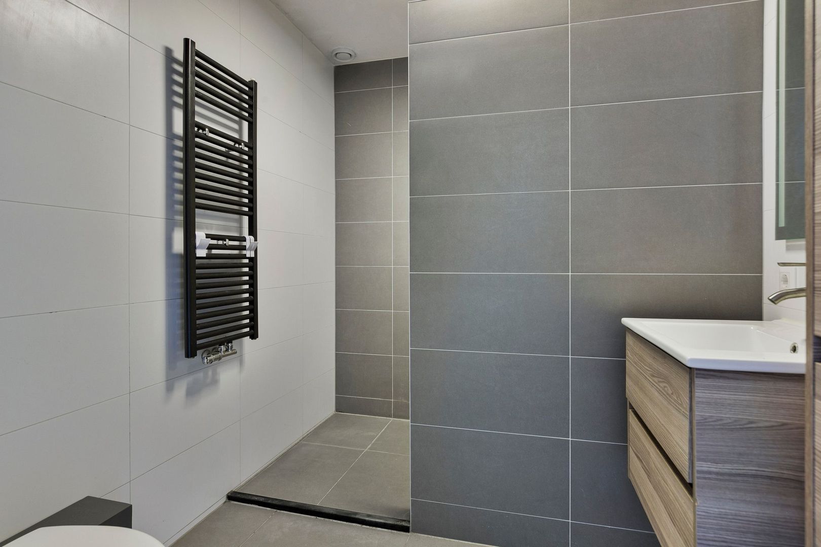 De badkamer is uitgevoerd met een inloopdouche, toilet, wastafel met meubel en een spiegel die zowel kan verwarmen als verlichten.