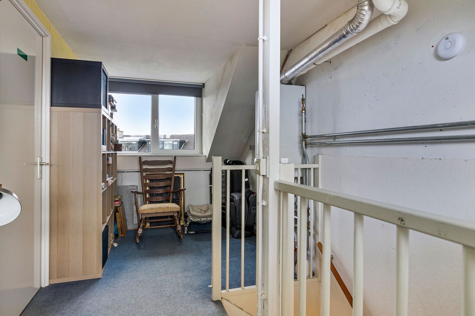 Op de tweede verdieping bevindt zich de overloop waar de cv-ketel opgesteld staat. Ook bevindt zich hier de aansluiting voor de wastafel, wasmachine en droger.