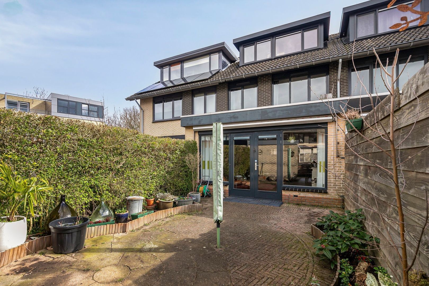 De tuin is gelegen op het noord westen. De stenen berging biedt opslagruimte voor fietsen en tuinspullen. Via een achterpoort is de tuin ook te bereiken.