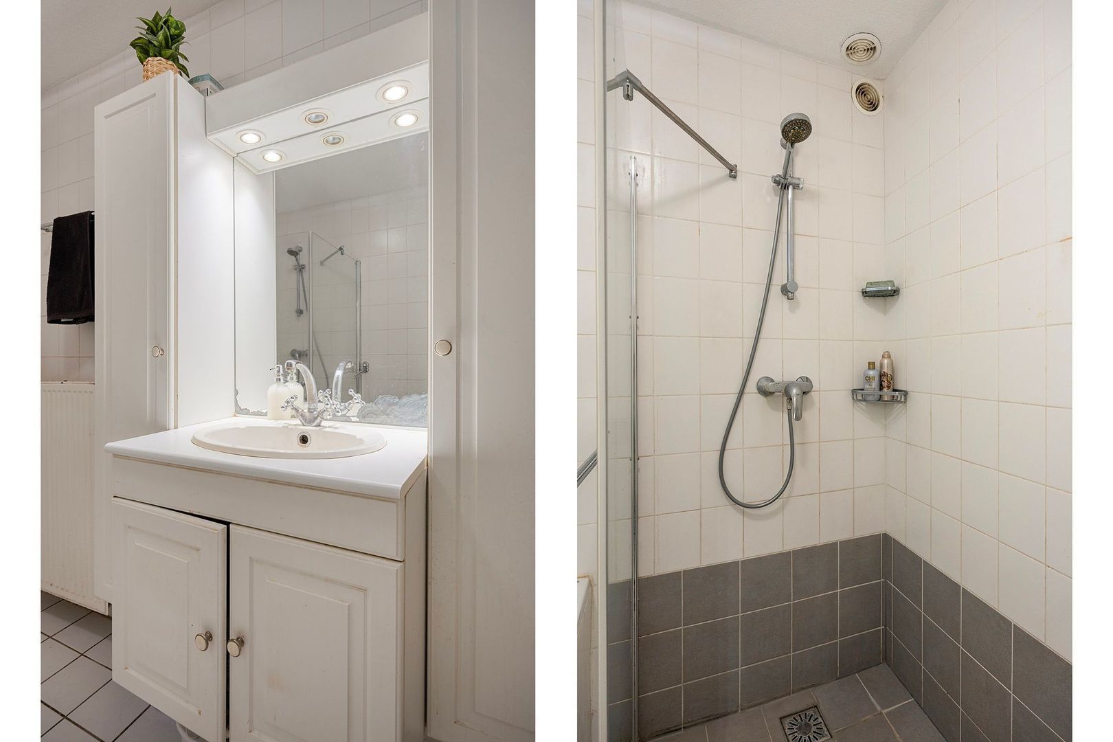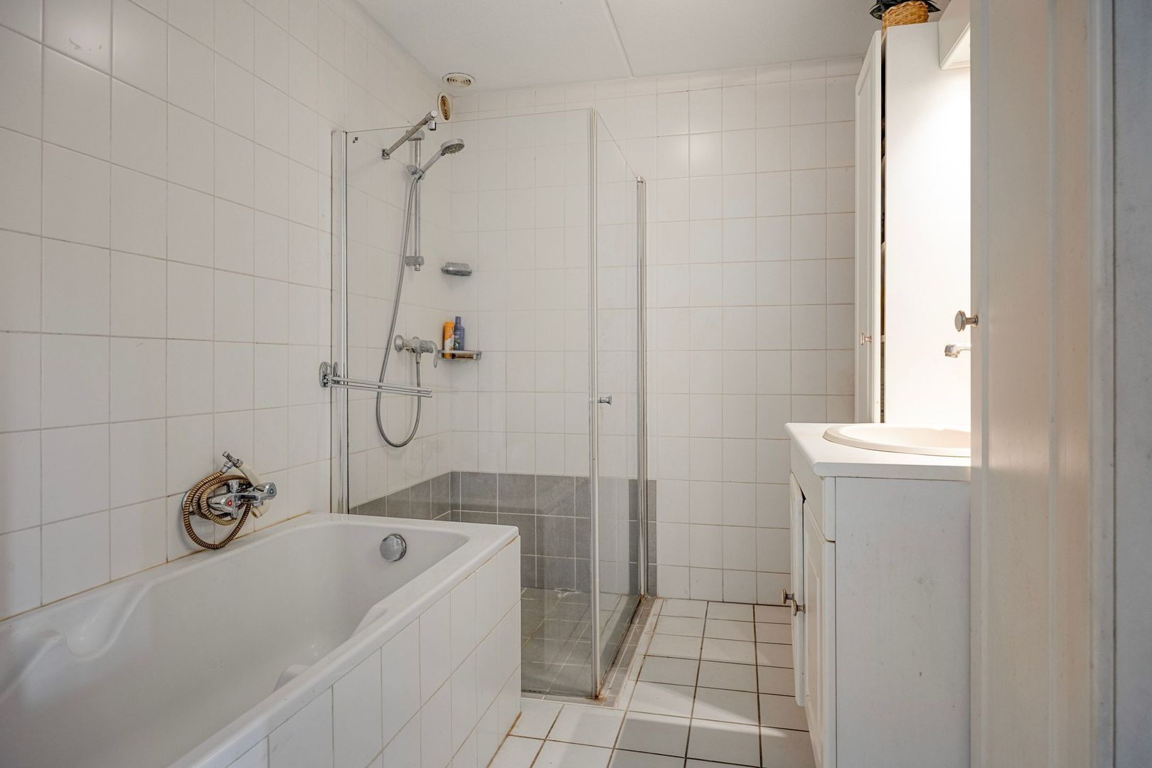 De badkamer is uitgerust met een ligbad, douche, wastafel met meubel en mechanische ventilatie.