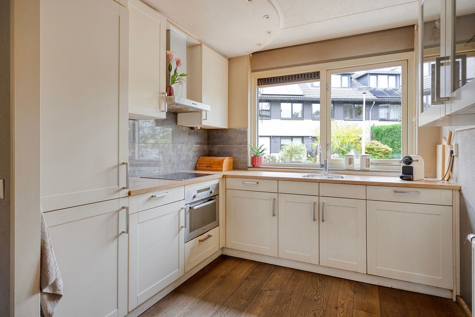De ruime, uitgebouwde woonkamer is aan de achterzijde gelegen en voorzien van een praktische trapkast en een fraaie houten vloer met vloerverwarming. De nette, ruim opgezette keuken aan de voorzijde beschikt over een inductiekookplaat, afzuigkap, koel-vriescombinatie, vaatwasser, combi-oven en een spoelbak met mengkraan.
