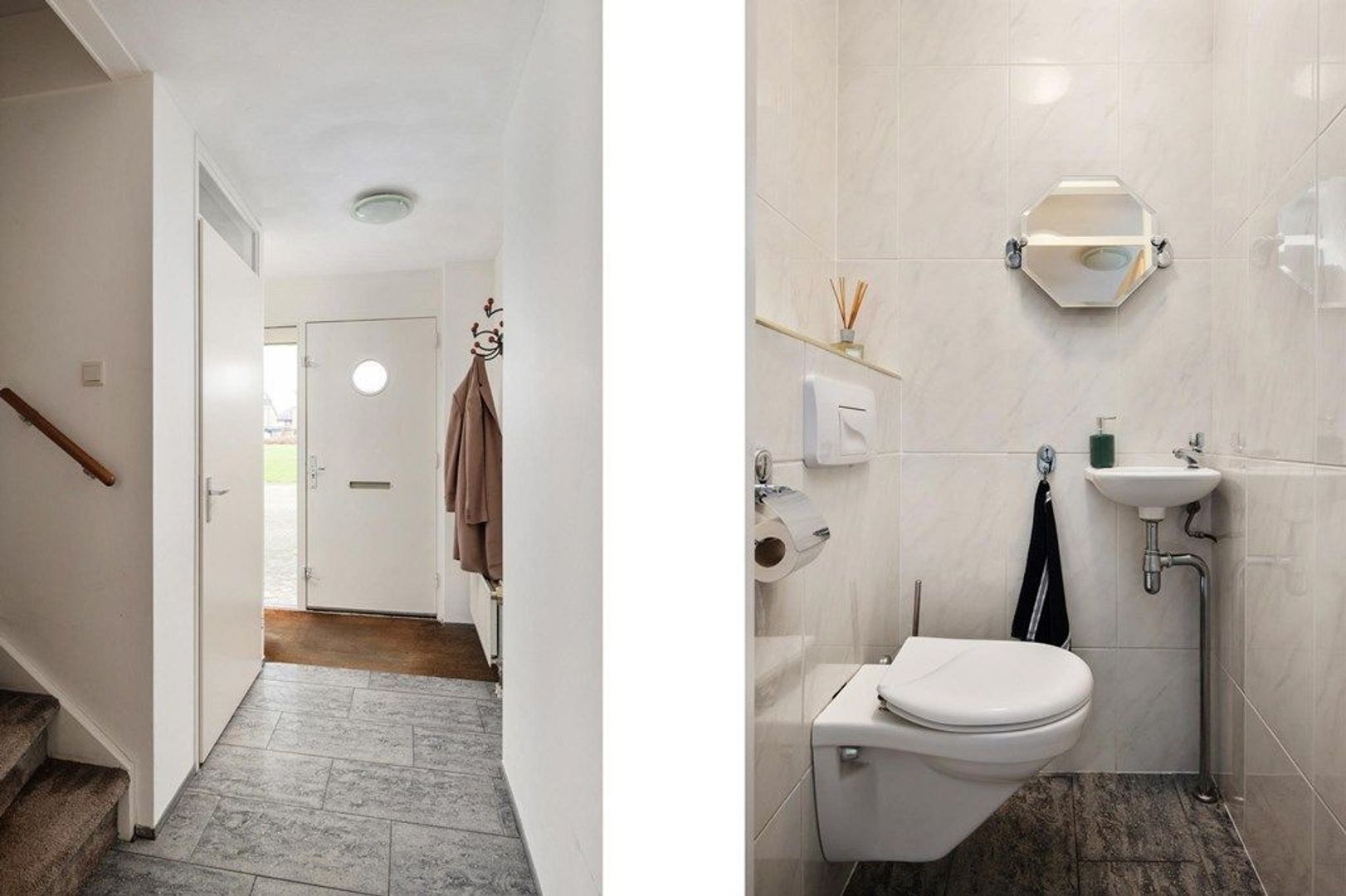 Overdekte entree, hal met meterkast, toilet, trapopgang naar de 1e verdieping, trap naar de kelder/hobbyruimte en toegang tot de living.