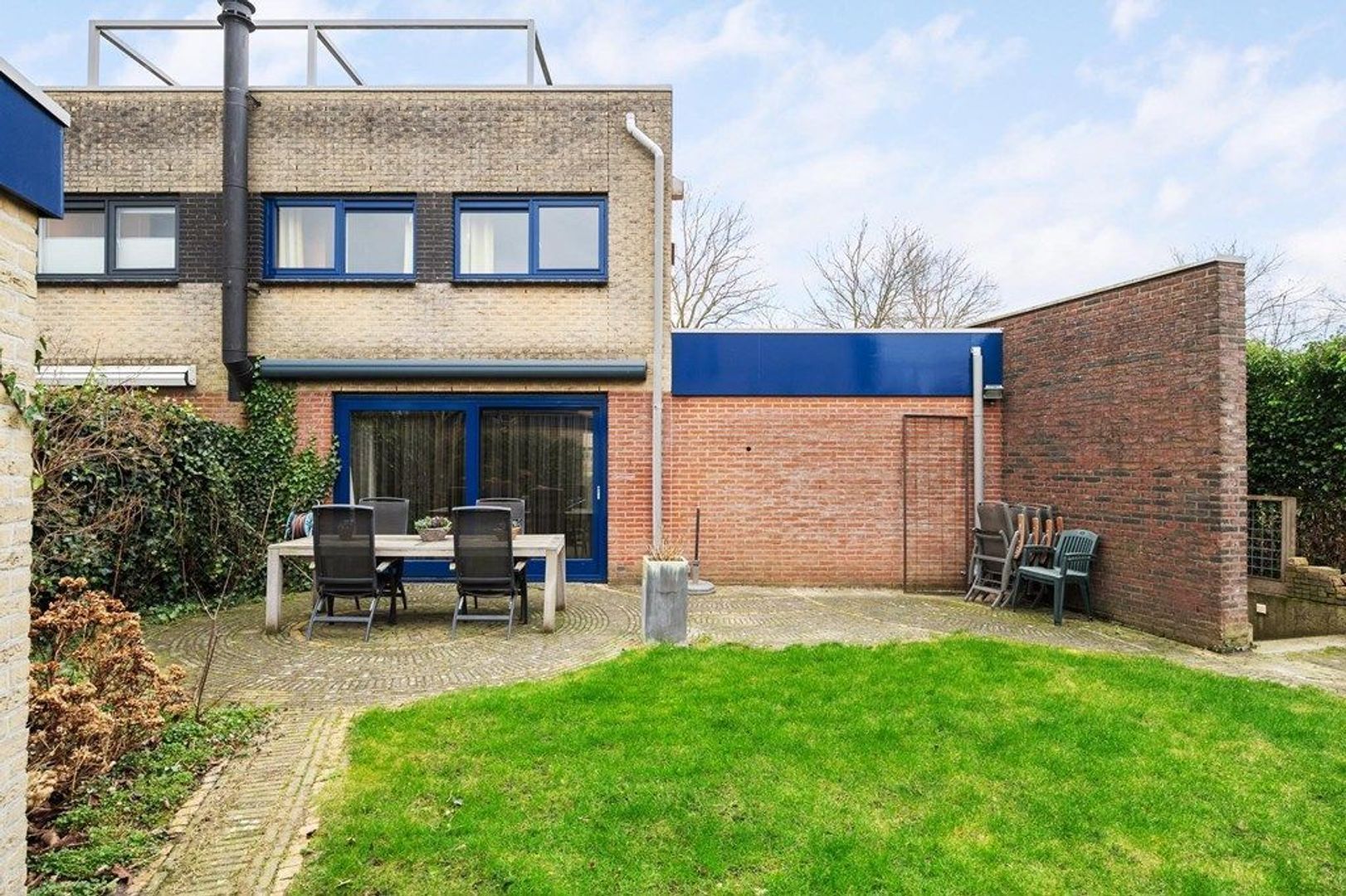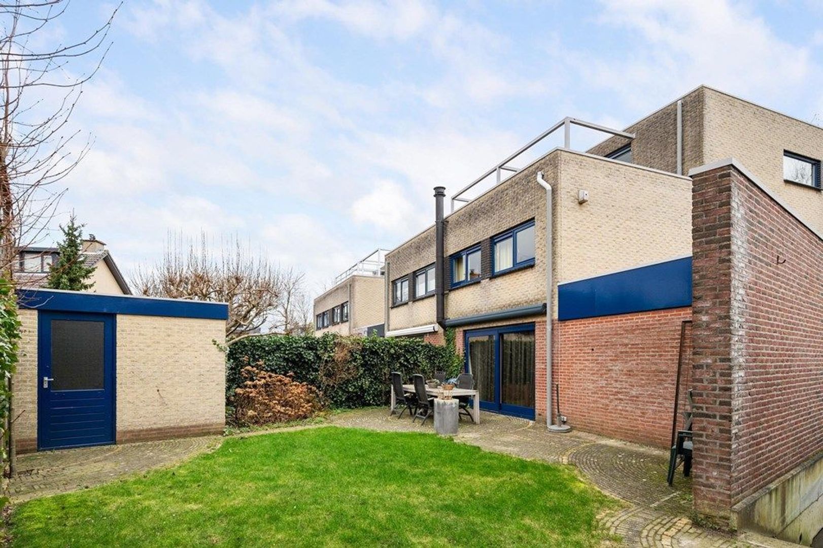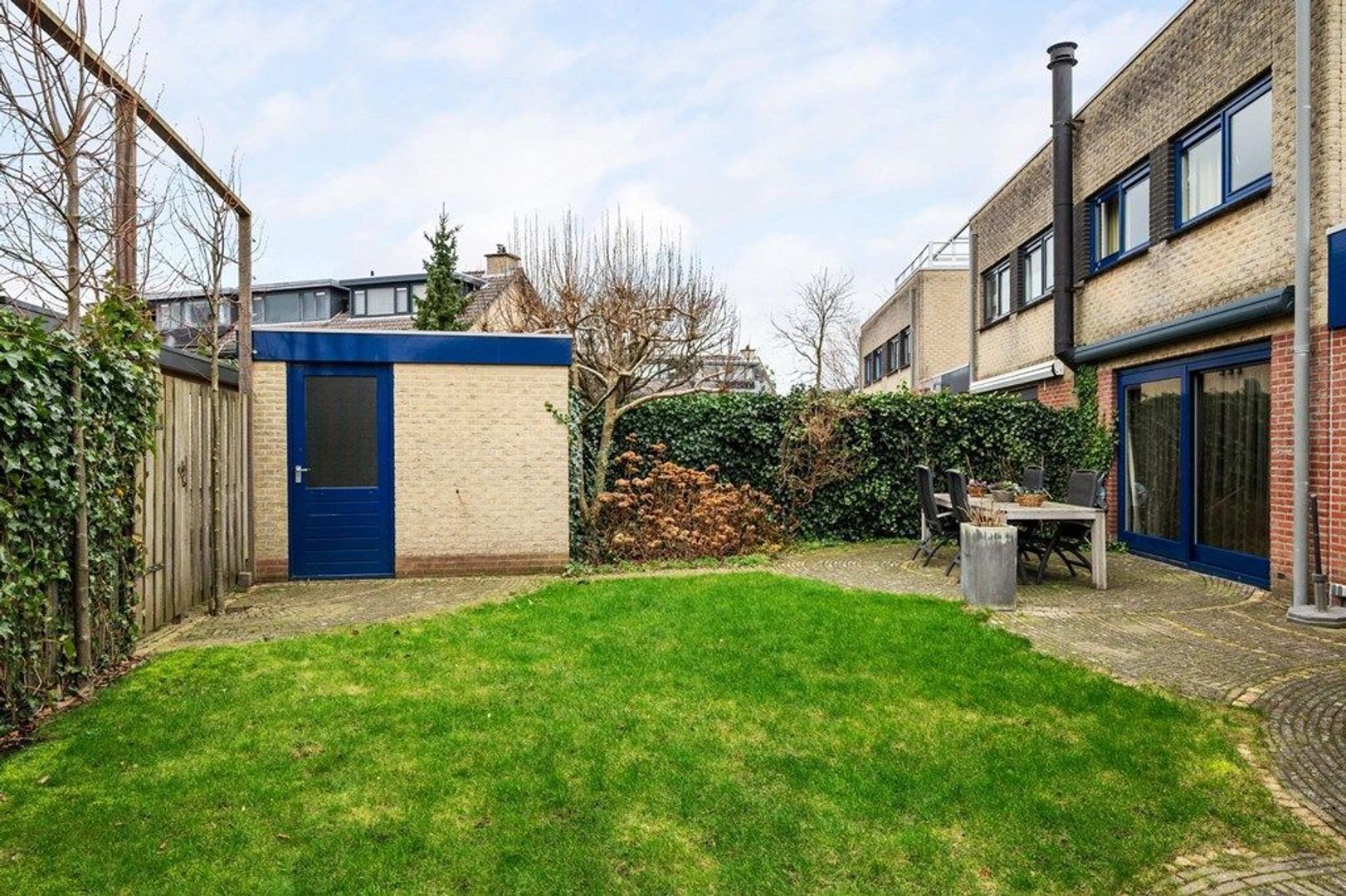 De brede achtertuin is deels betegeld en heeft diverse planten en een stukje gazon. Achterin de tuin vind je de vrijstaande stenen berging.