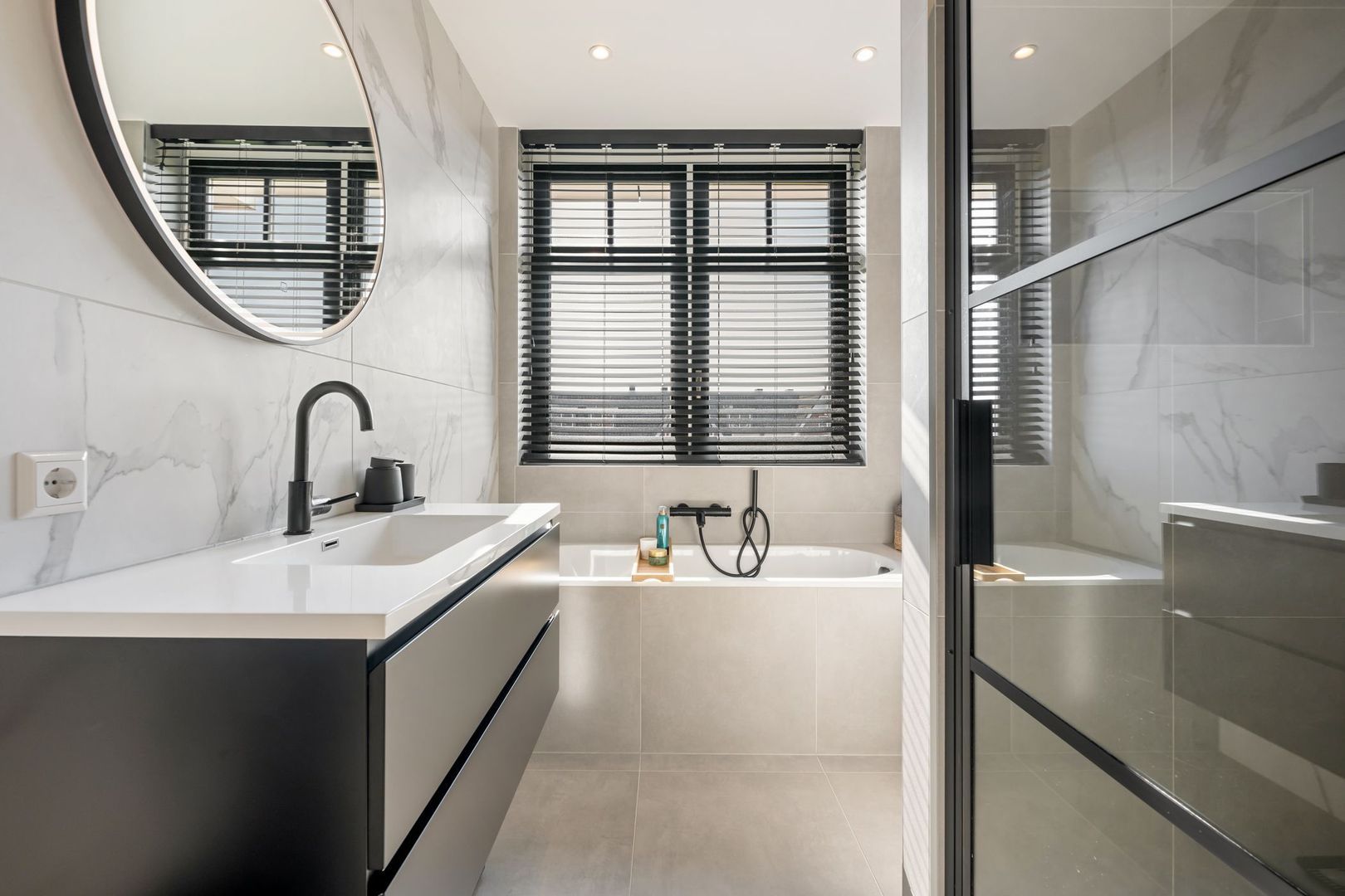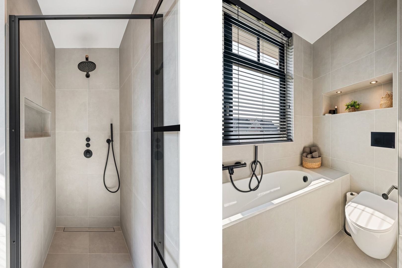De geheel betegelde badkamer is voorzien van een inloopdouche, ligbad, wastafelmeubel, toilet, en een elektrische vloerverwarming.