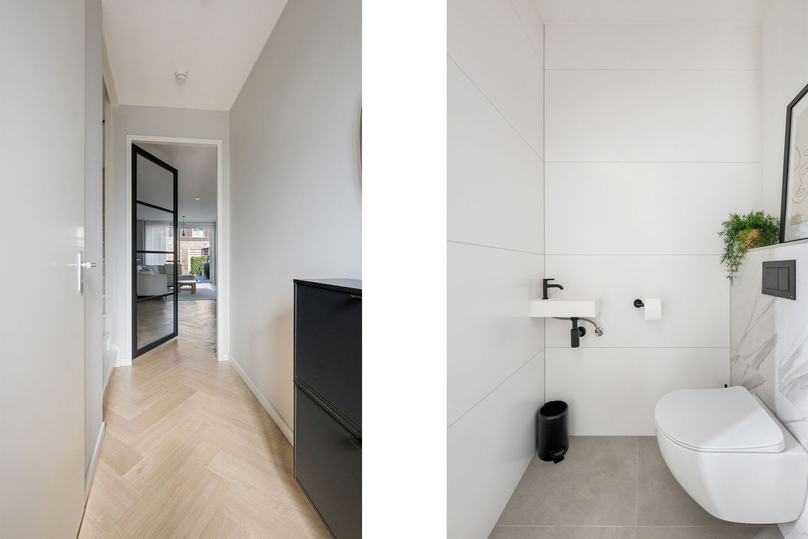 Entree, hal met de meterkast, de hal geeft toegang tot de woonkamer, toilet met ingebouwd bidet, en trapopgang naar de eerste verdieping.