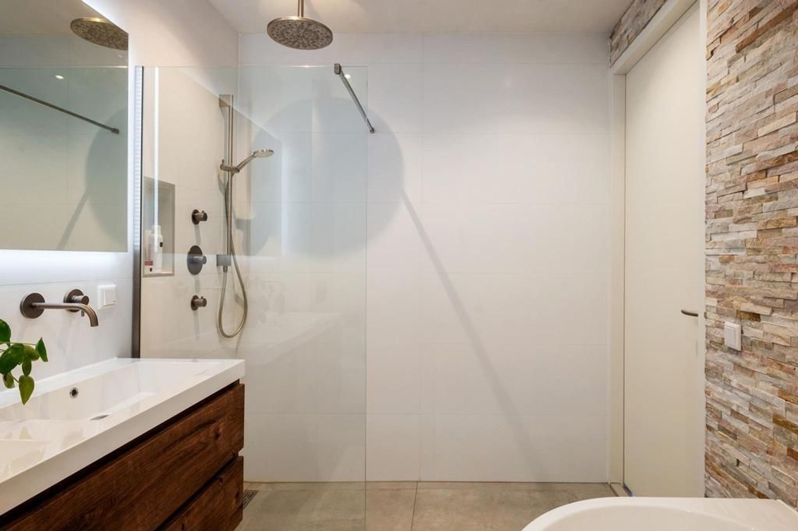 Overloop, een slaapkamer aan de voorzijde, badkamer met douche, ligbad, wastafel en tweede toilet, een slaapkamer aan de achterzijde. Slaapkamer 1 (ca. 4.85 x 3.29m). Slaapkamer 2 (ca. 4.85 x 3.29m).