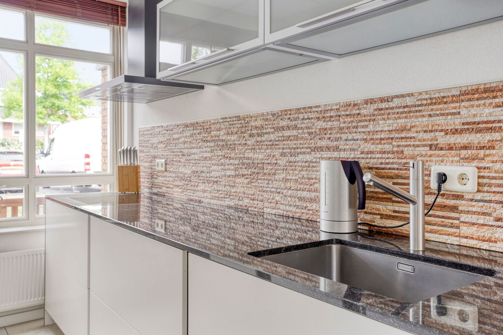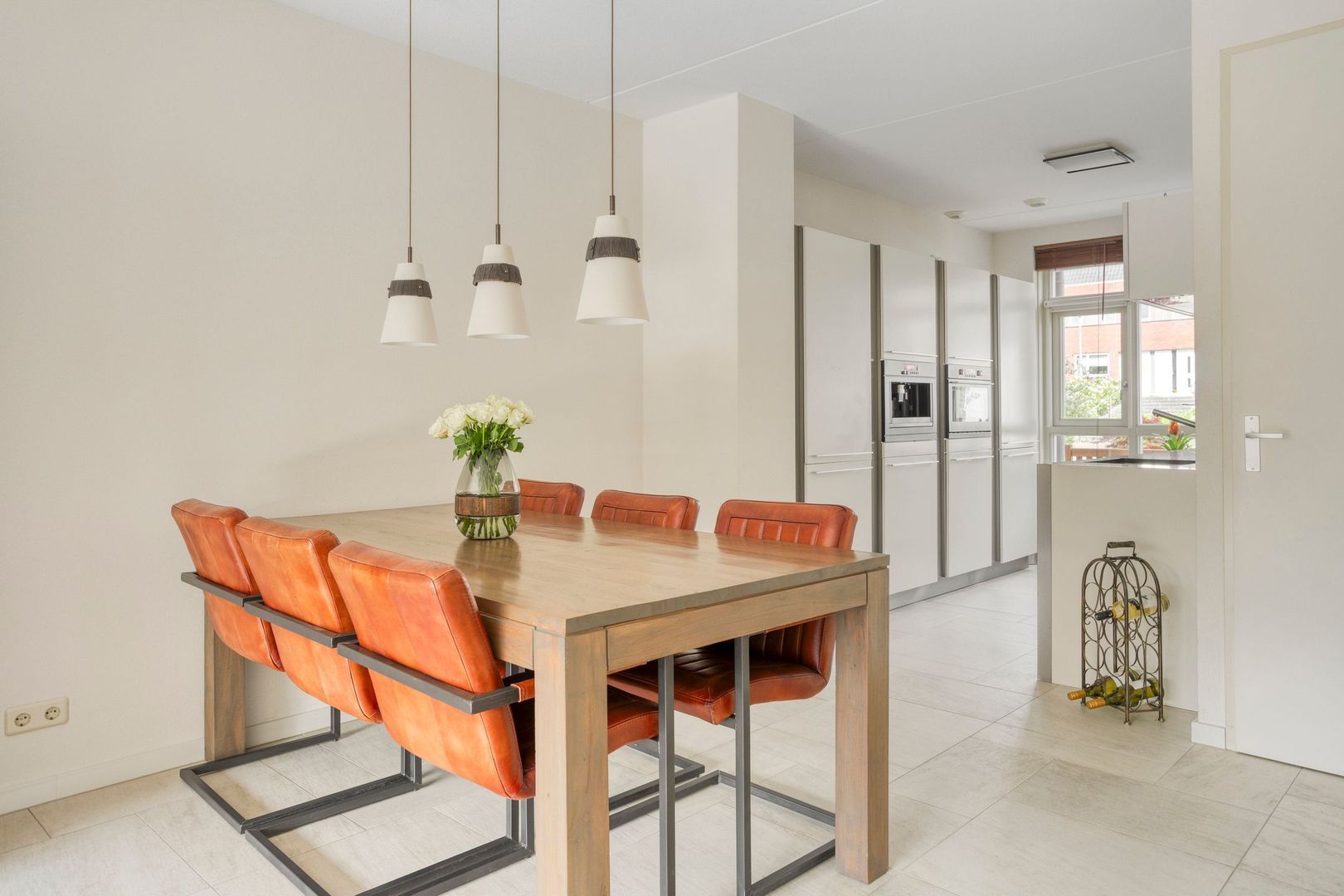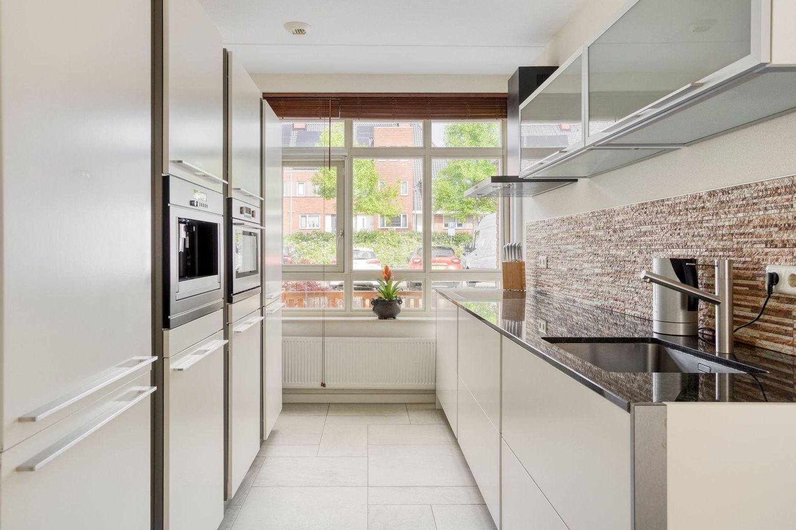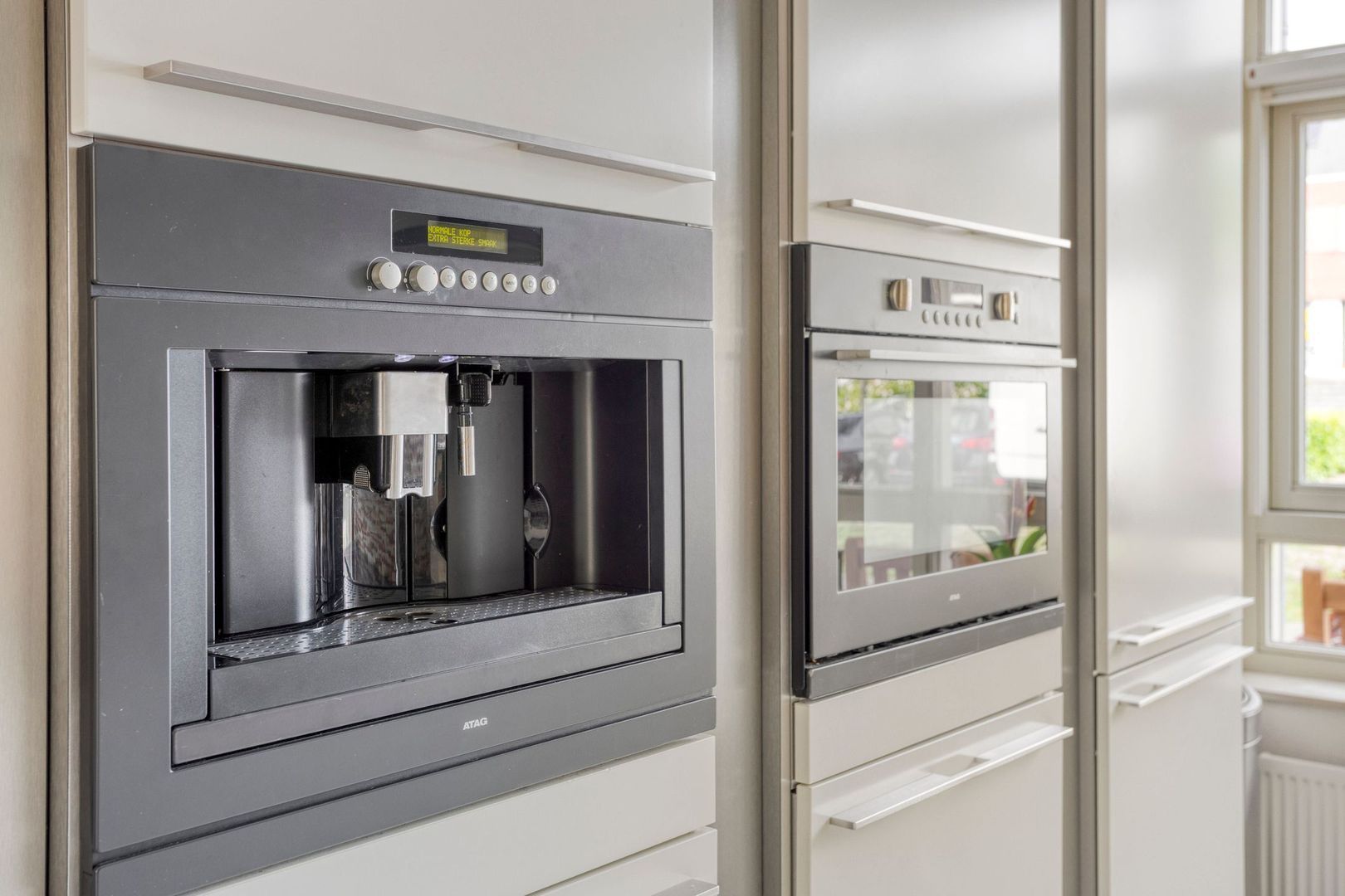 De lichte uitgebouwde woonkamer is voorzien van een plavuizen vloer en vloerverwarming en een ruime bergkast onder de trap. Vanuit de bouw werd de woonkamer uitgebouwd aan de achterzijde zodat deze een uitstekende afmeting heeft. De strakke en moderne keuken is gelegen aan de voorzijde van de woning en beschikt over diverse luxe inbouwapparatuur. Deze is uitgevoerd met een recht aanrechtblok met een inductiekookplaat met afzuigkap, vaatwasser en spoelbak. Aan de andere zijde staat een kastenwand met een combi magnetron en -oven, koelkast en vriezer combinatie en een ingebouwd koffieapparaat.