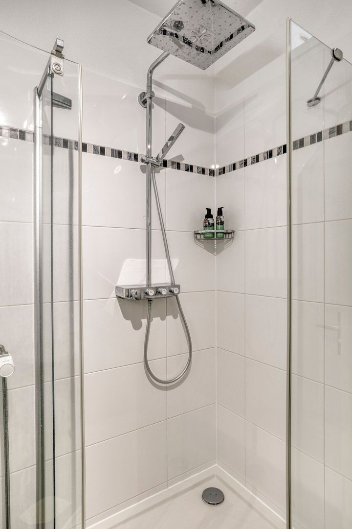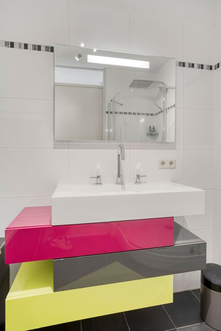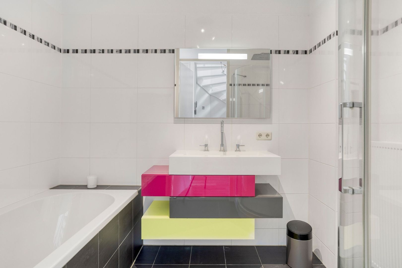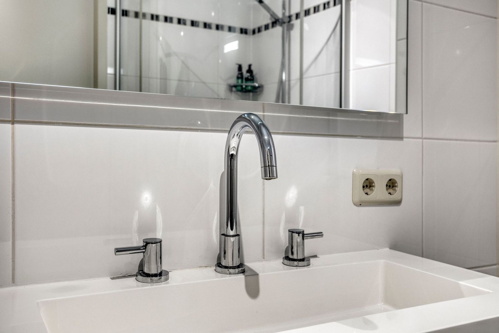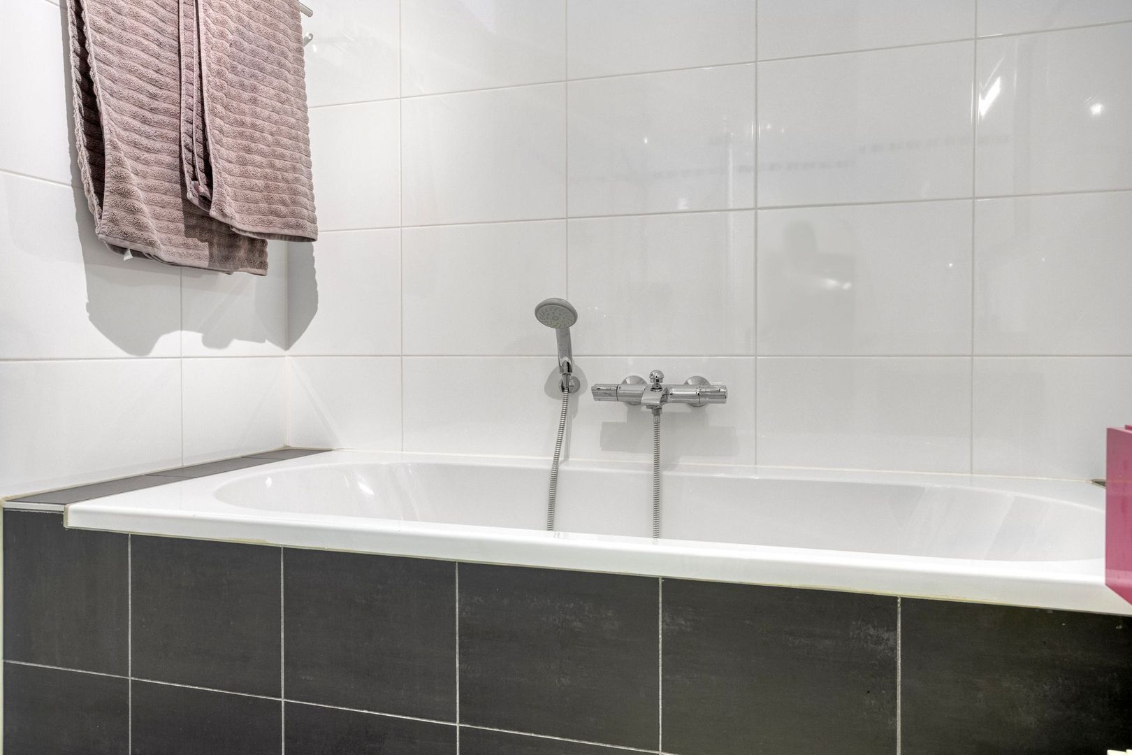 De badkamer is ten tijde van de bouw vergroot en uitgevoerd met een ligbad, inloopdouche, wastafel en handdoekradiator, op de overloop bevindt zich nog een separaat toilet.