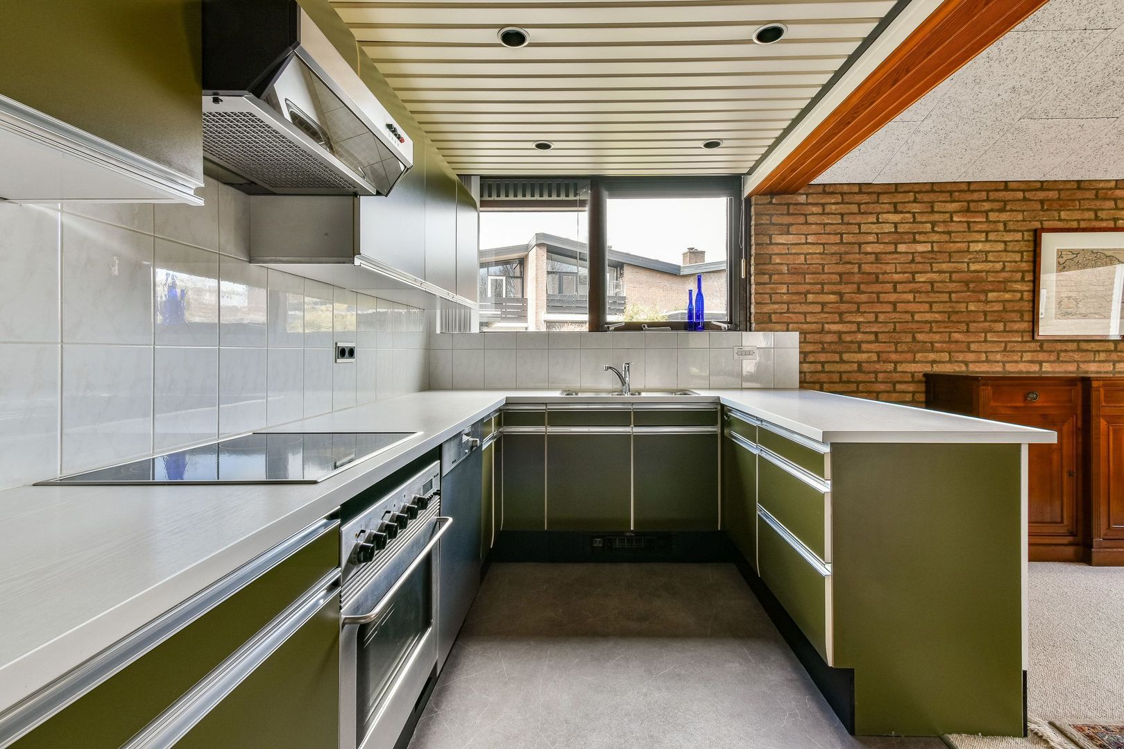 De keuken bevindt zich aan de voorzijde en is uitgerust met diverse inbouwapparatuur, waaronder een vaatwasser, keramische kookplaat, afzuigkap en oven. Daarnaast beschikt de keuken over een verlaagd plafond en een dubbele wasbak.