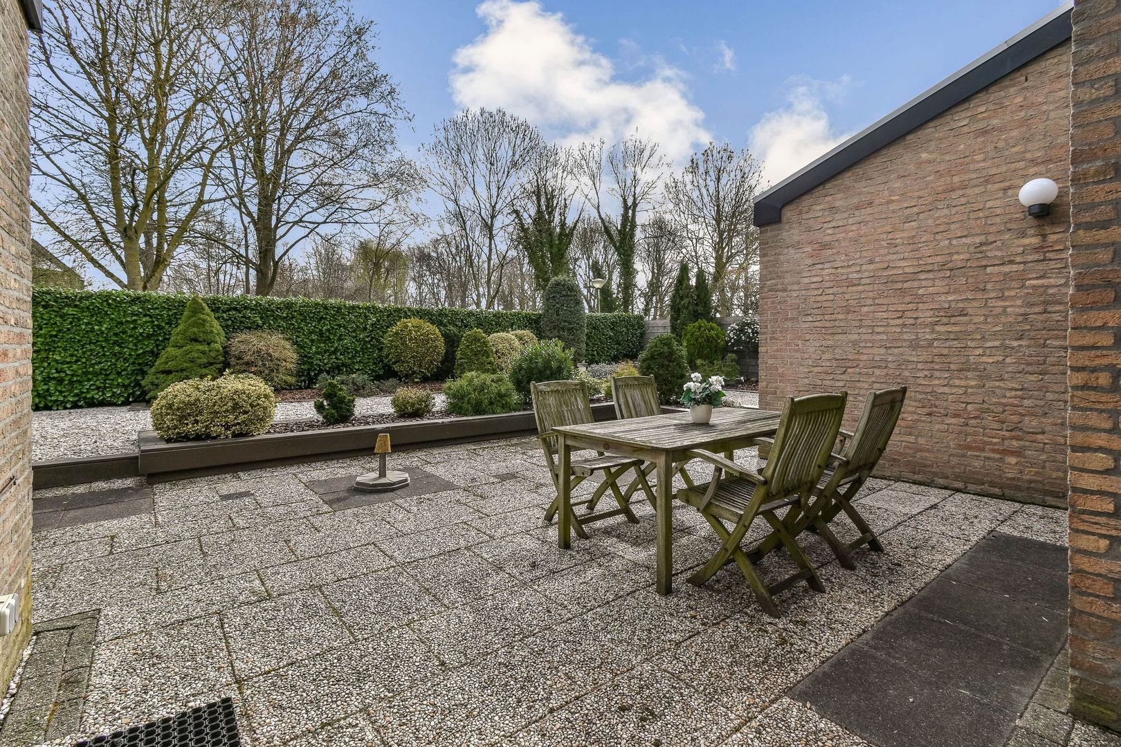 De zonnige achtertuin is gelegen op het zuiden en beschikt over een terras met buitenhaard. Hier geniet je in alle rust van zowel zon als schaduw.