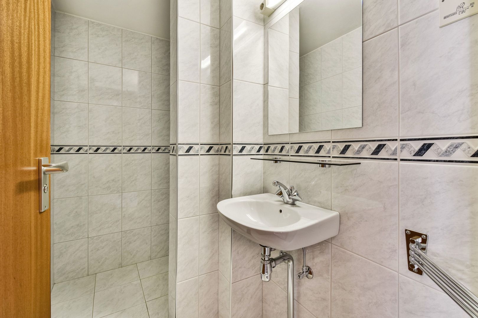 De eerste badkamer is voorzien van een douche en wastafel.