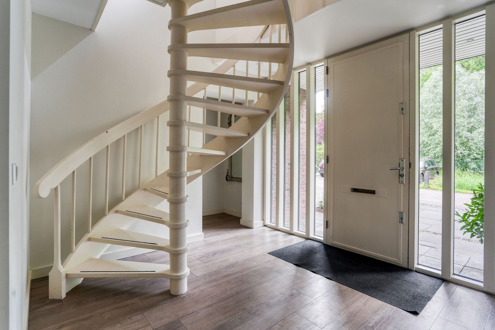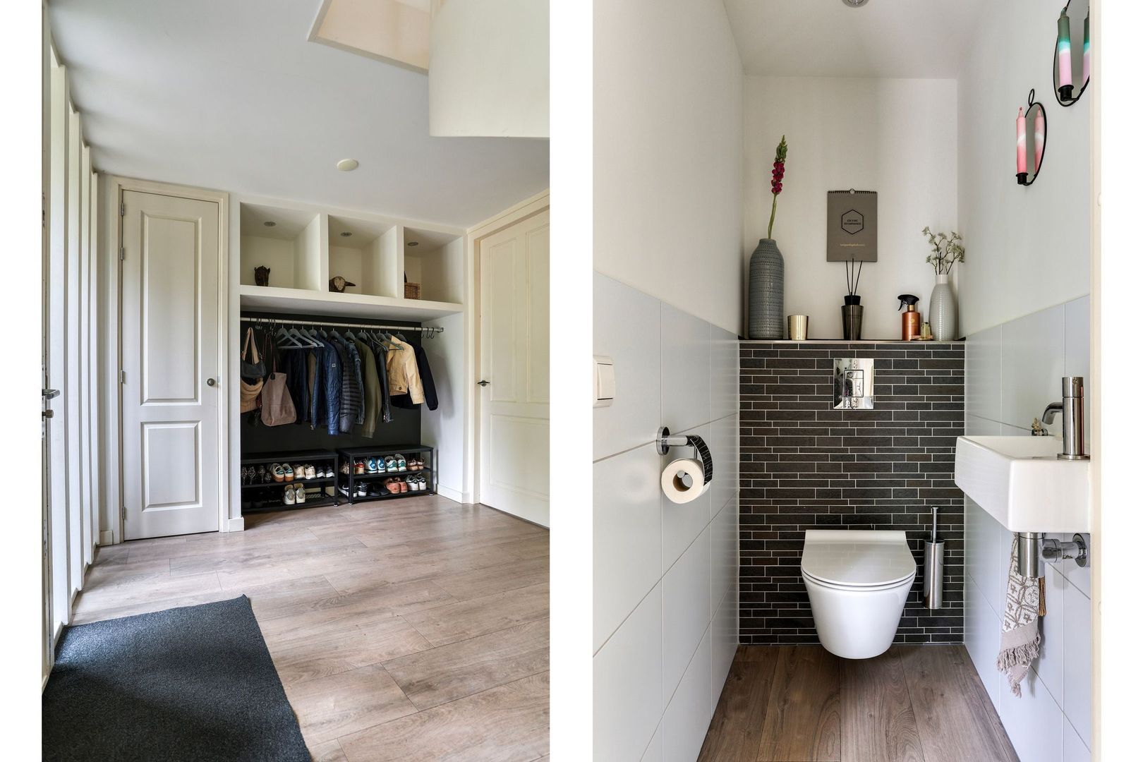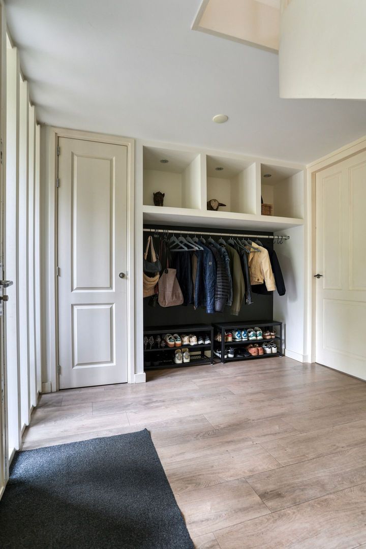 Entree woning, ruime hal met garderobe, meterkast welke is aangepast voor een laadpaal, toegang naar de garage, trapopgang naar de eerste verdieping en een modern afgewerkt toilet.