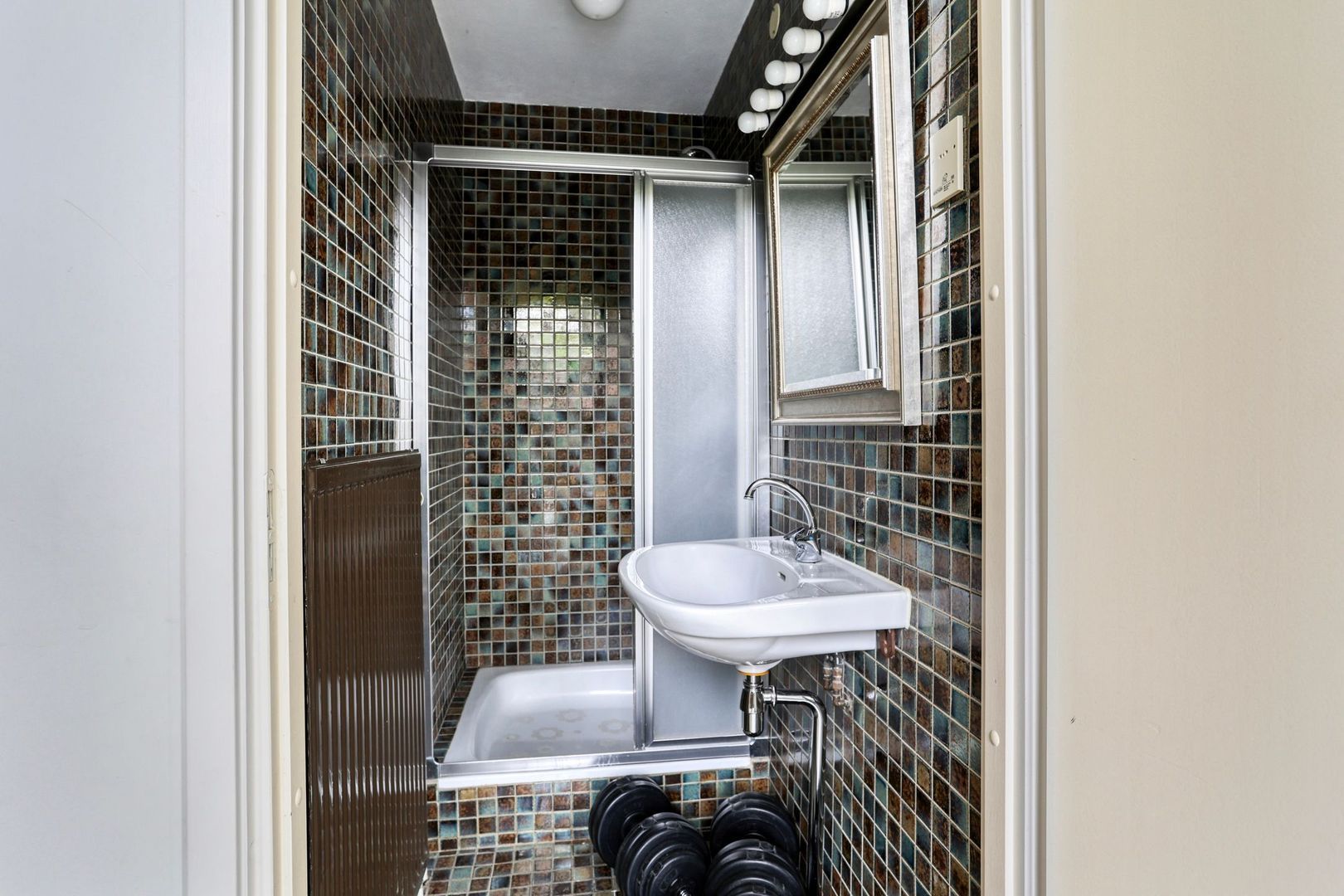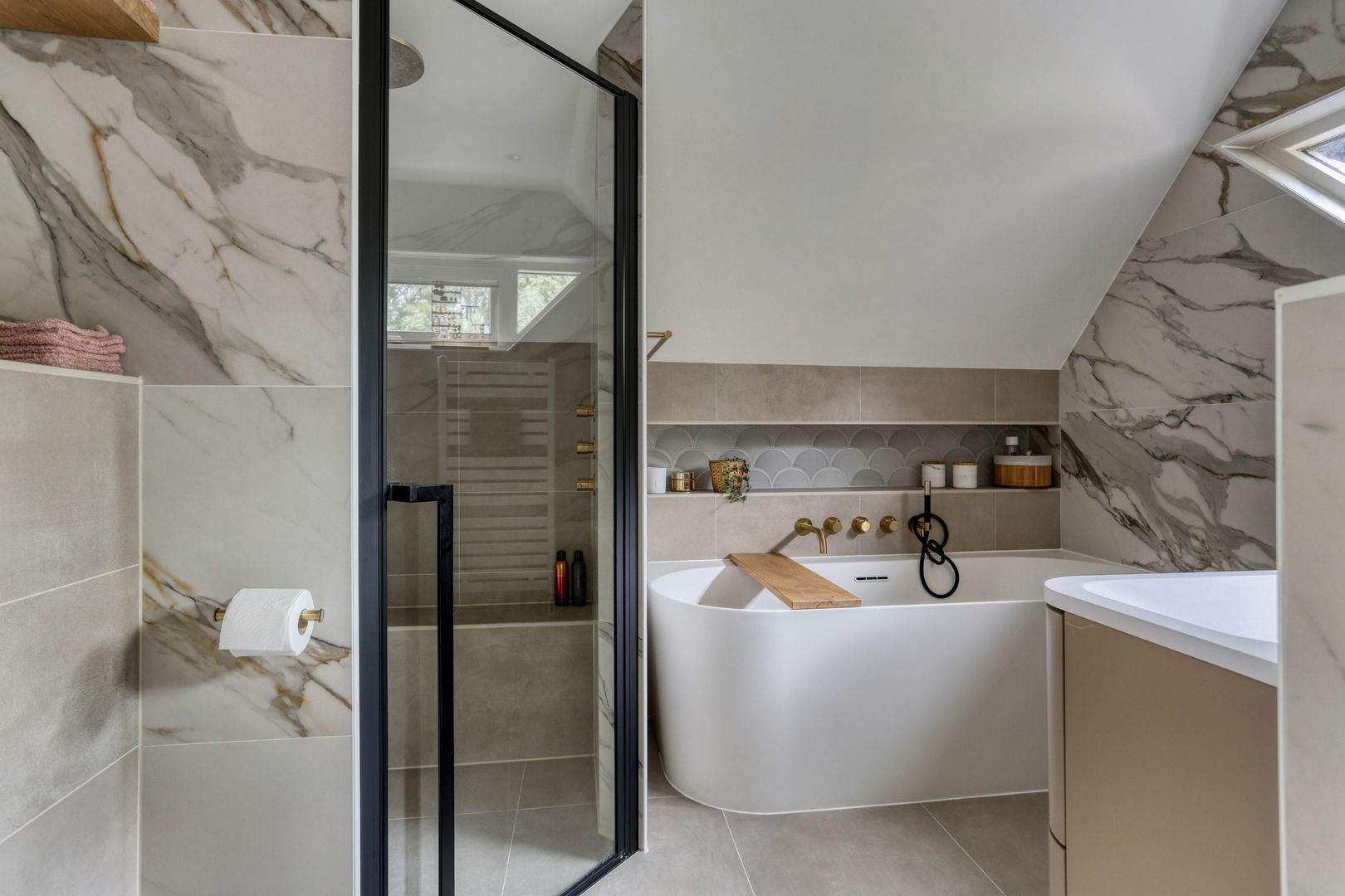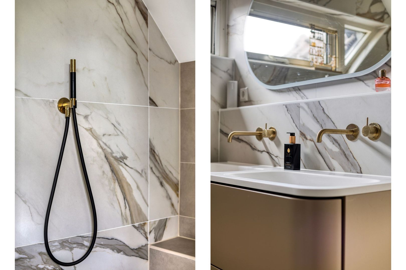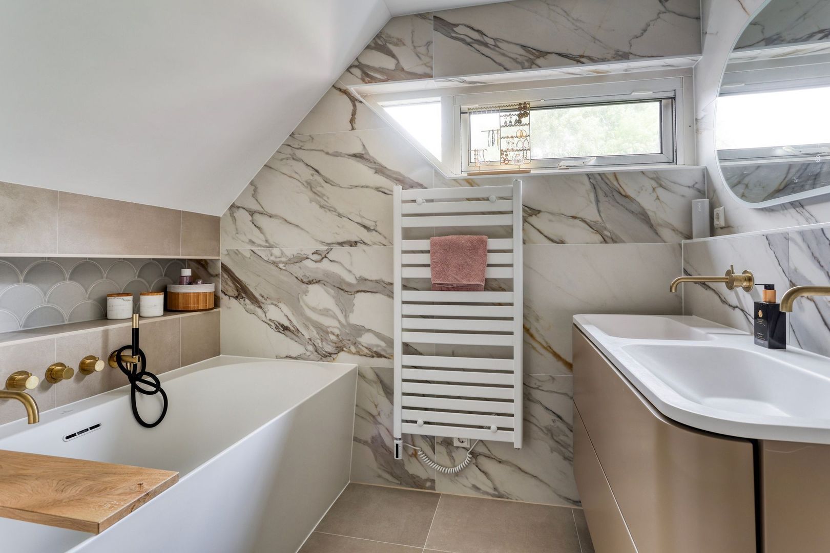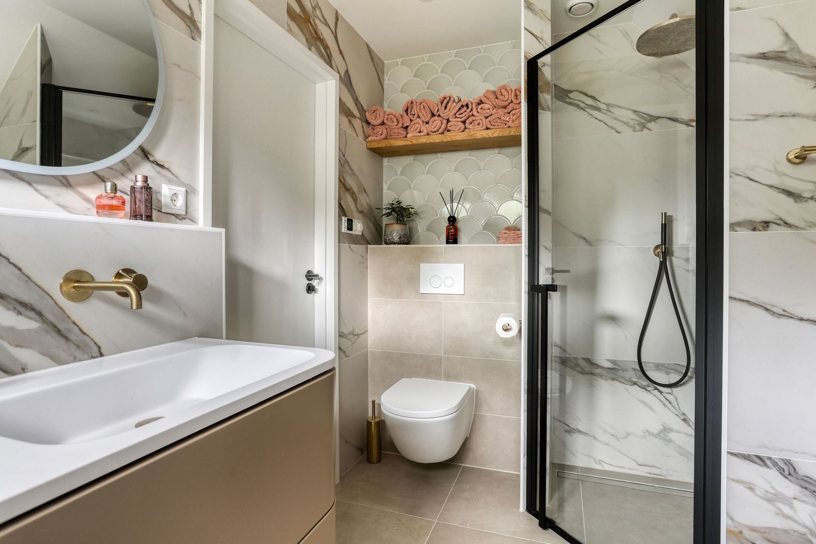 De recent vernieuwde en stijlvol afgewerkte badkamer (2025) straalt luxe en comfort uit. Deze volledig betegelde ruimte is uitgerust met een royale inloopdouche met regendouche, een vrijstaand ligbad, een dubbele wastafel met modern meubel, een spiegel met geïntegreerde verlichting en anti-condensverwarming, een design handdoekradiator, elektrische vloerverwarming én een tweede toilet.