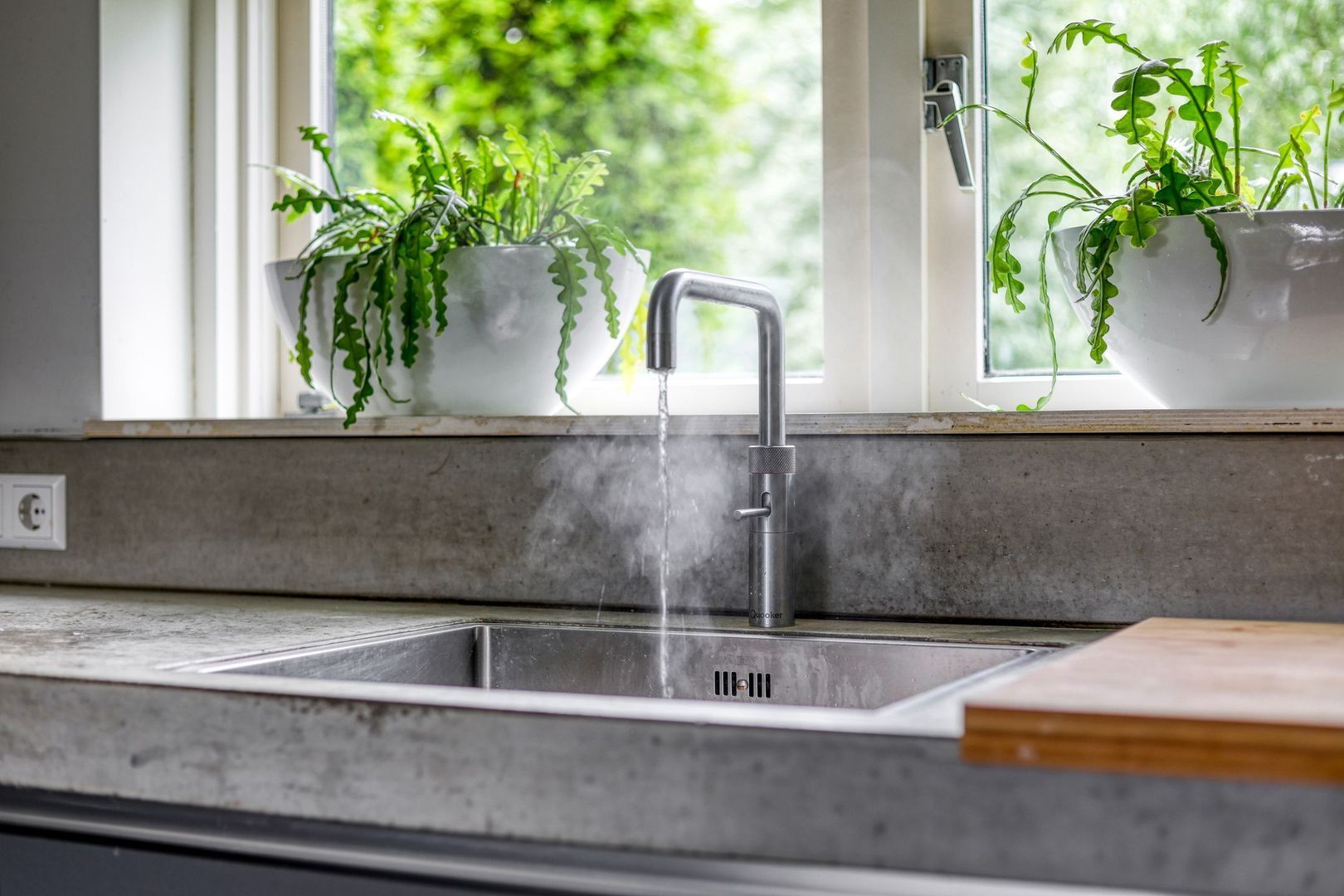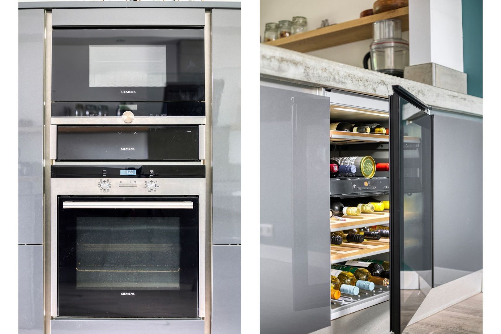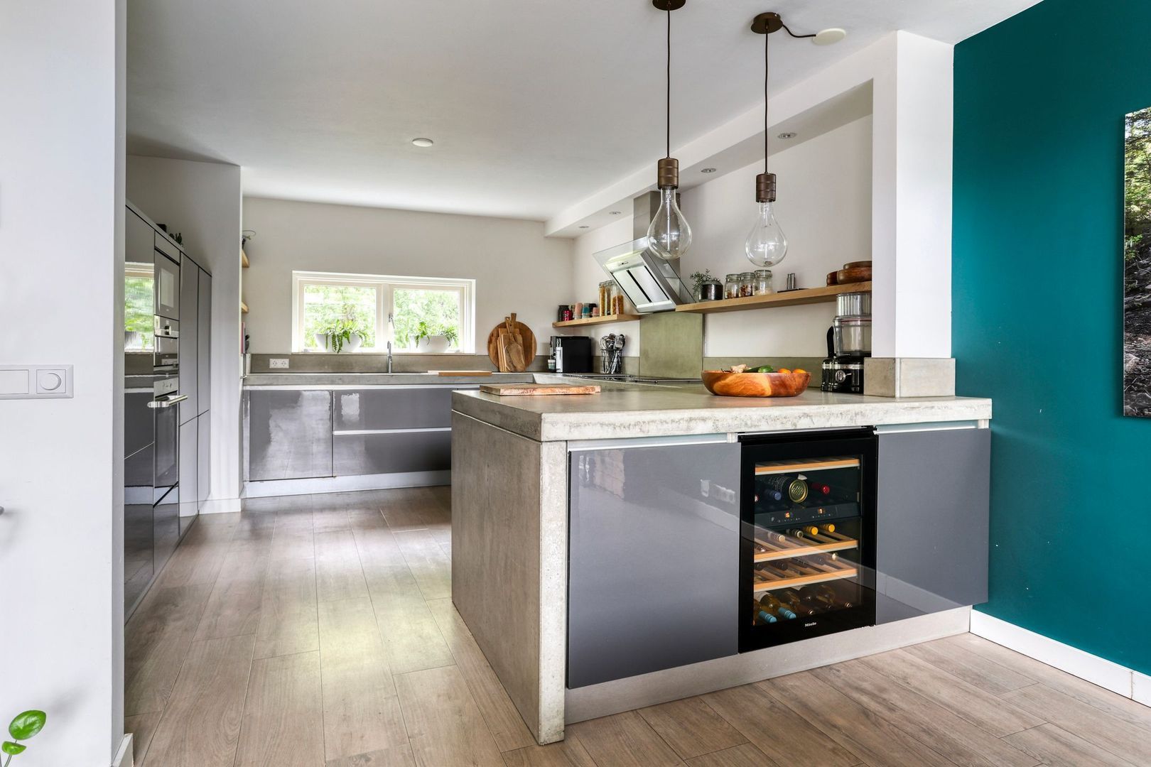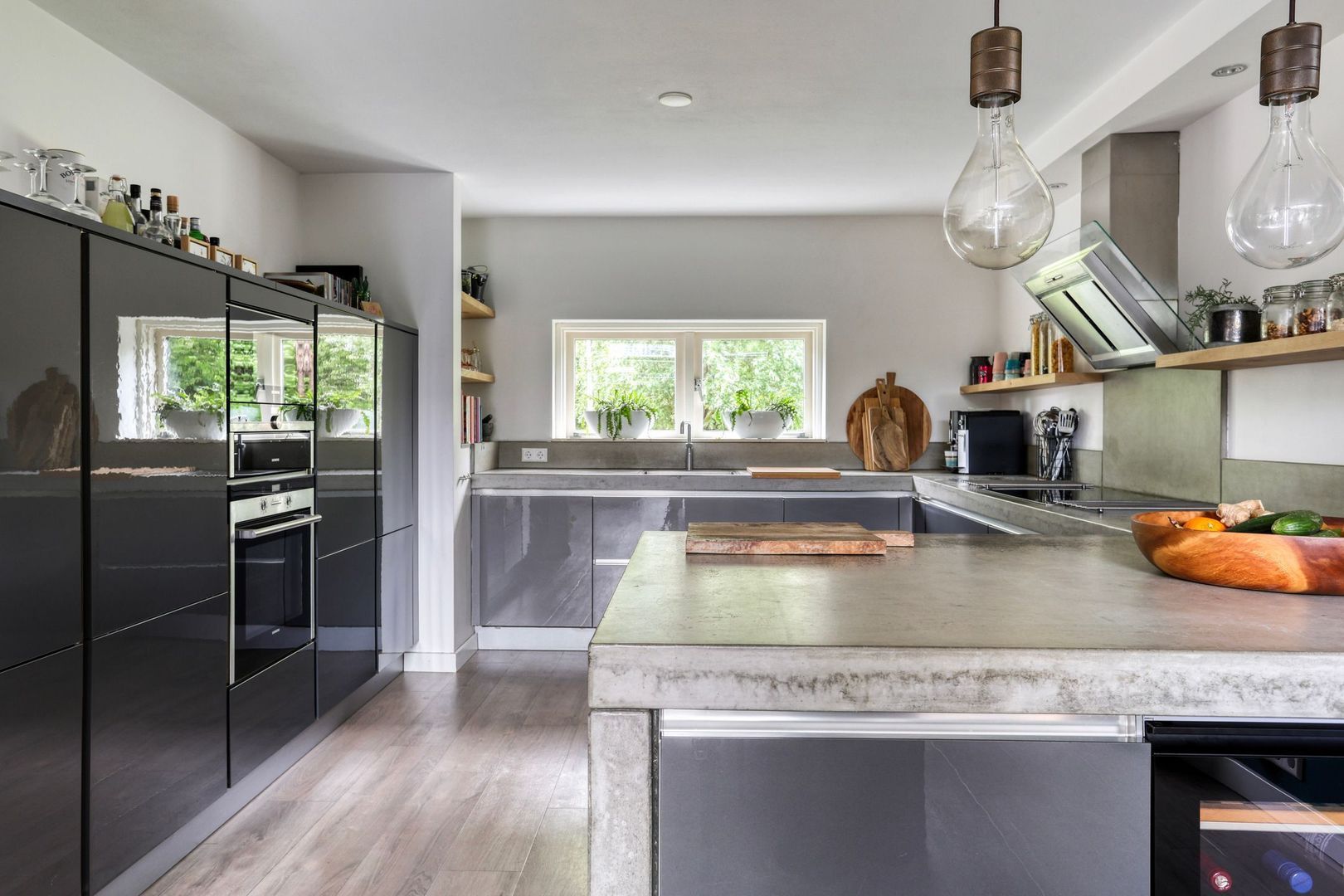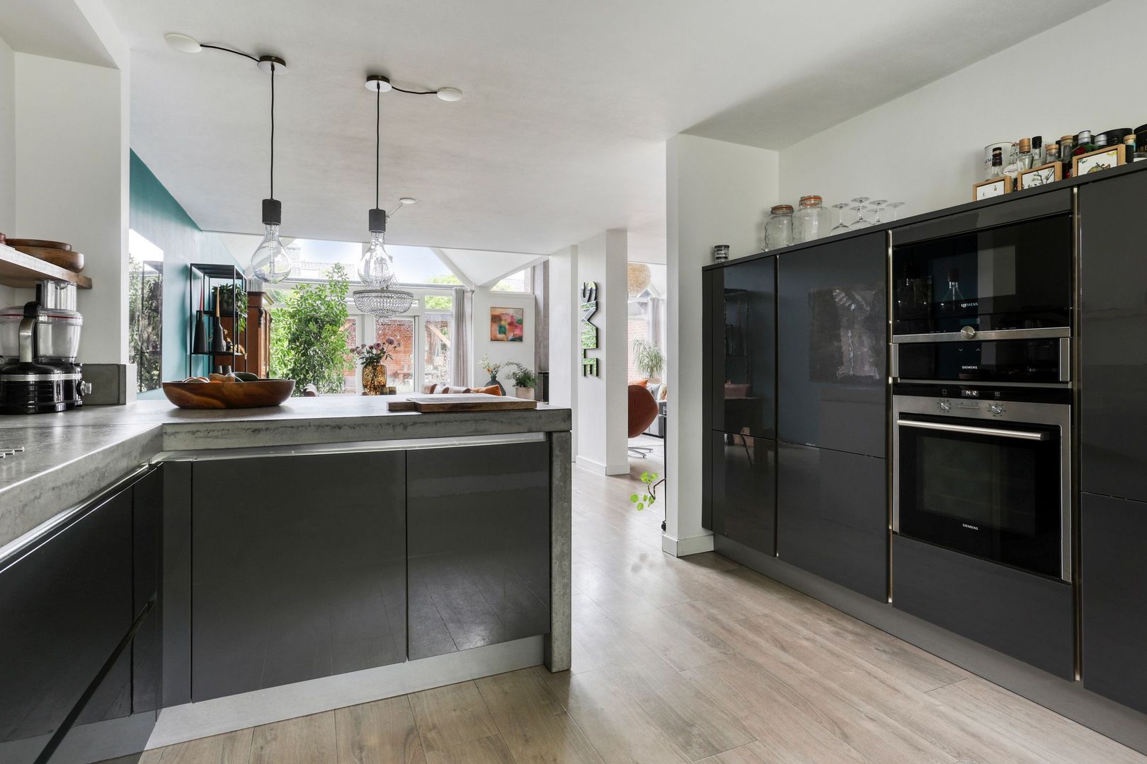 Aan de voorzijde tref je een moderne keuken. De keuken is voorzien van divers inbouwapparatuur zoals vaatwasser, koel-/vriescombinatie, magnetron, oven, inductiekookplaat, Ouooker, wijnkoelkast, RVS afzuigschouw en veel kast/opbergruimte.