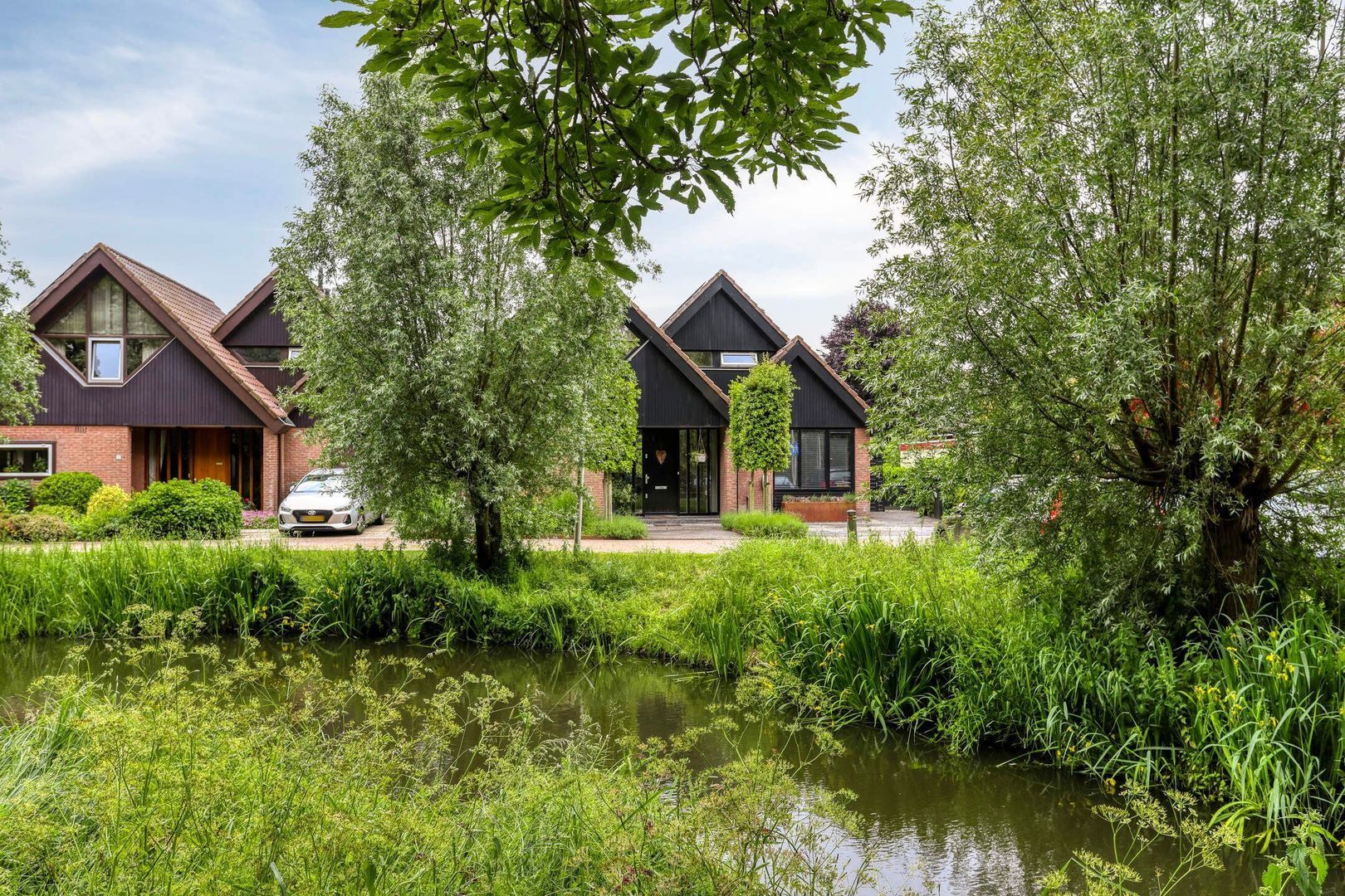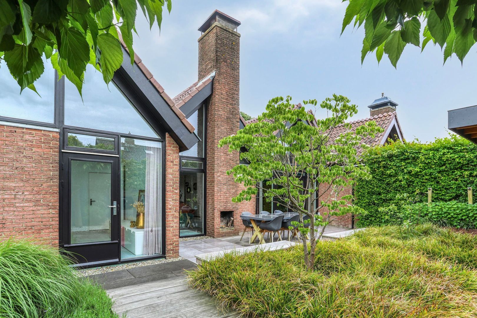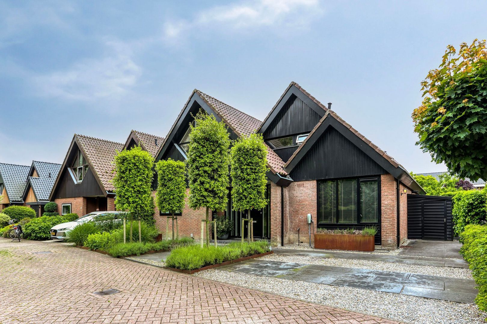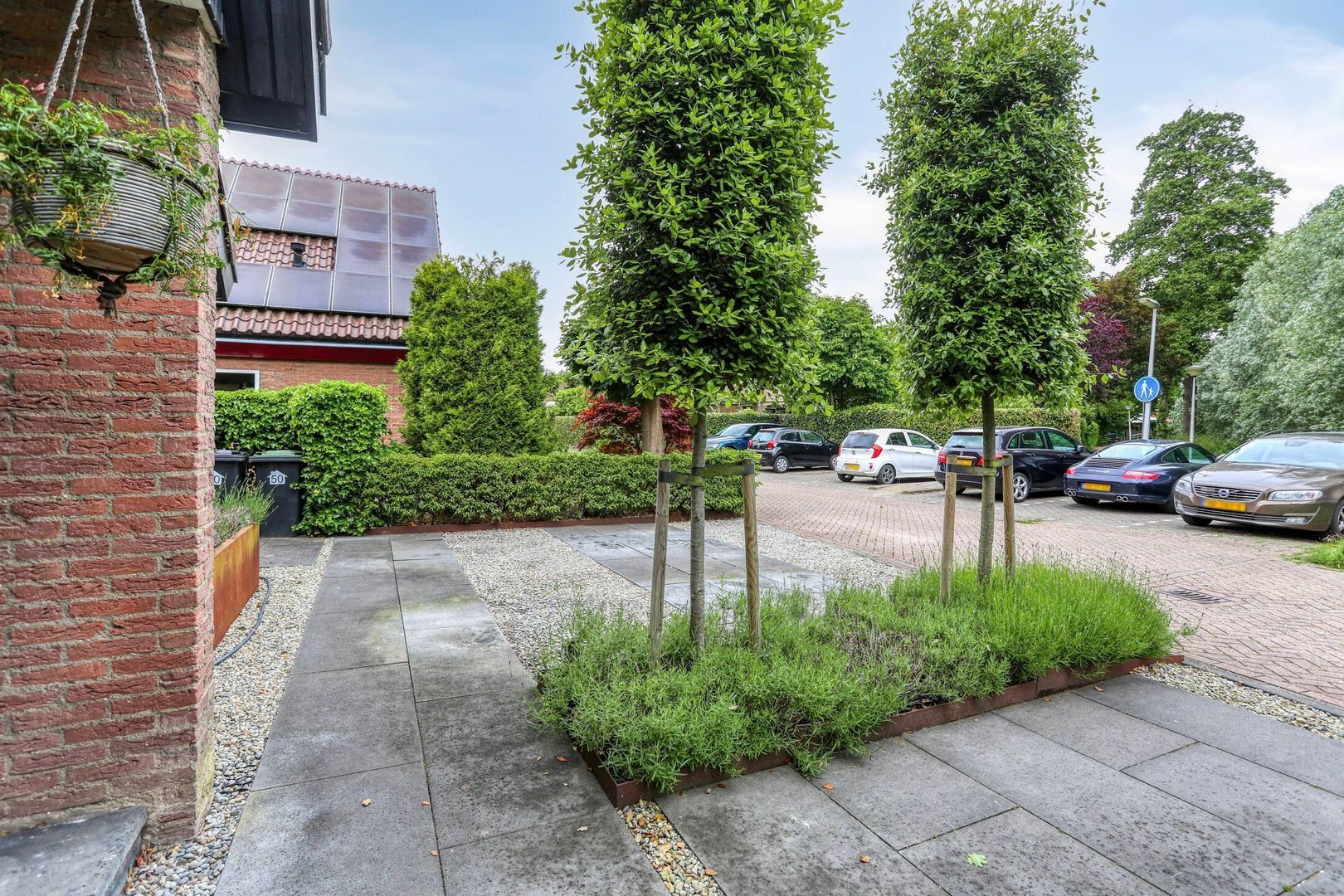De fraai aangelegde voortuin, biedt twee parkeerplaatsen en geeft toegang tot eveneens fraai aangelegde achtertuin.