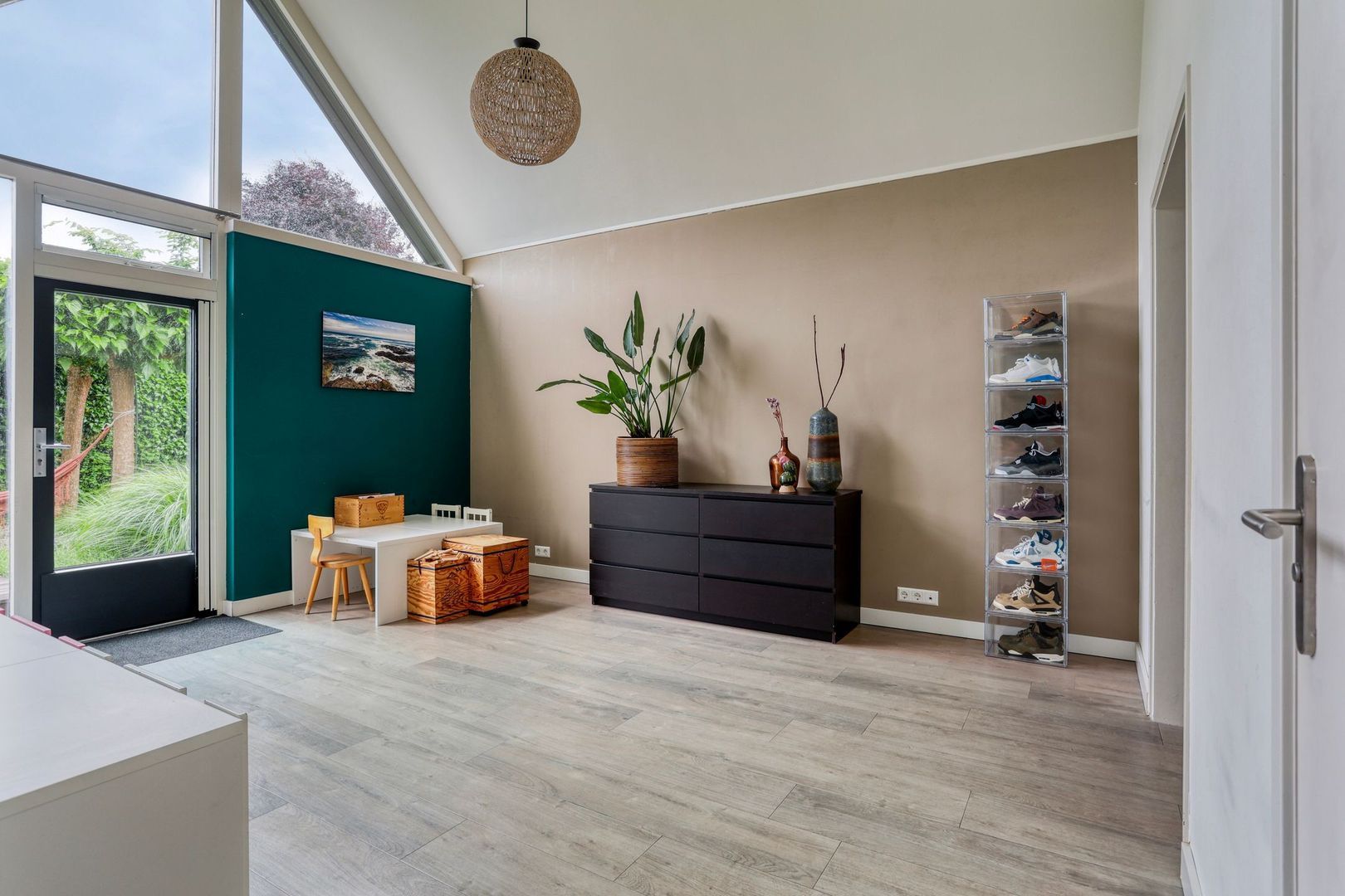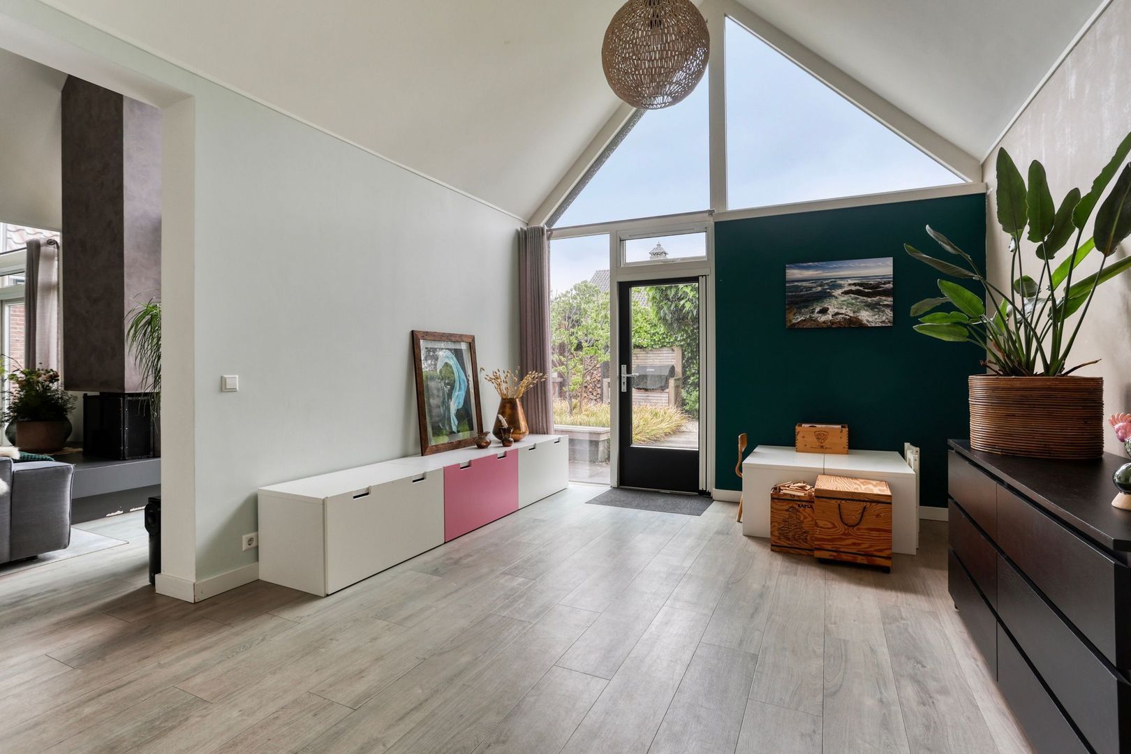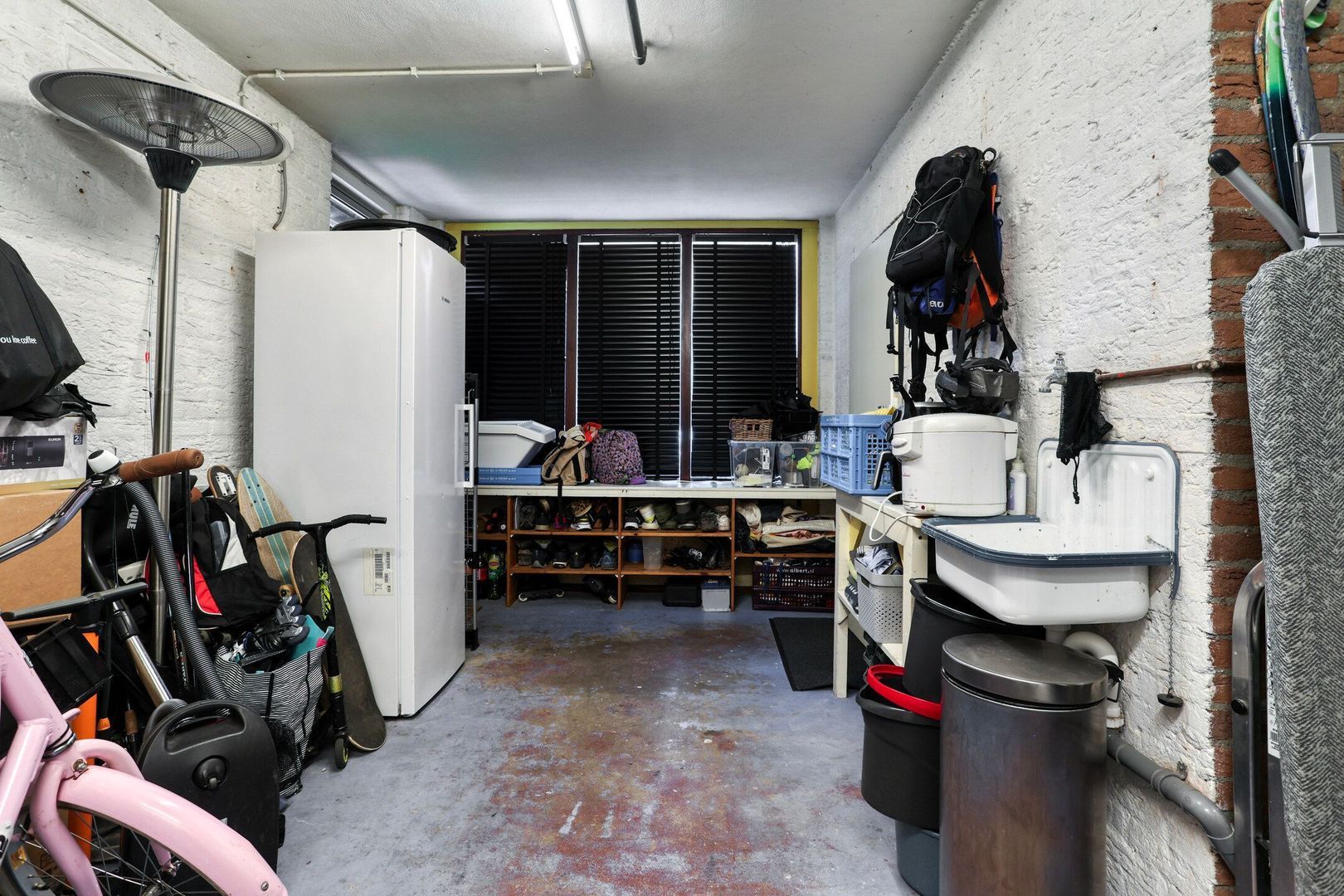 Via de hal heb je toegang tot aangebouwde garage. Hier bevindt zich de opstelplaats voor wasmachine, droger en de cv ketel.