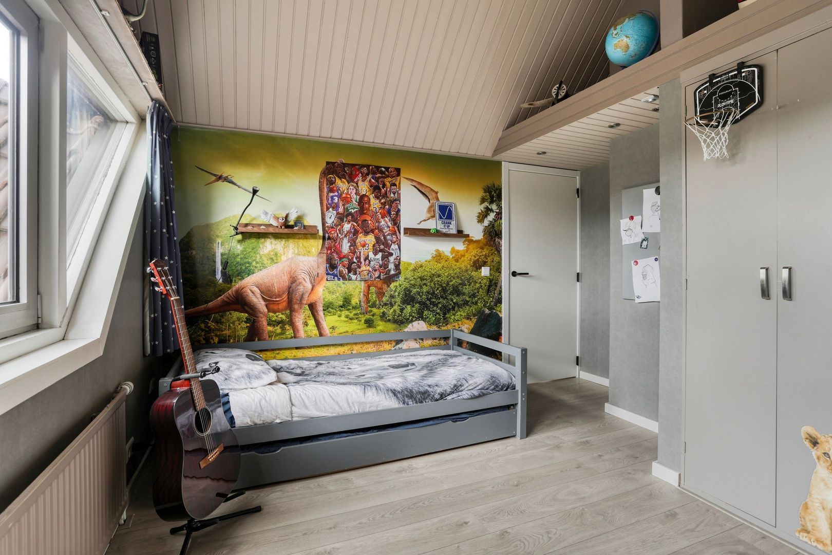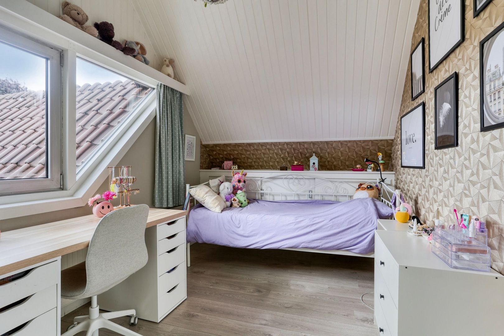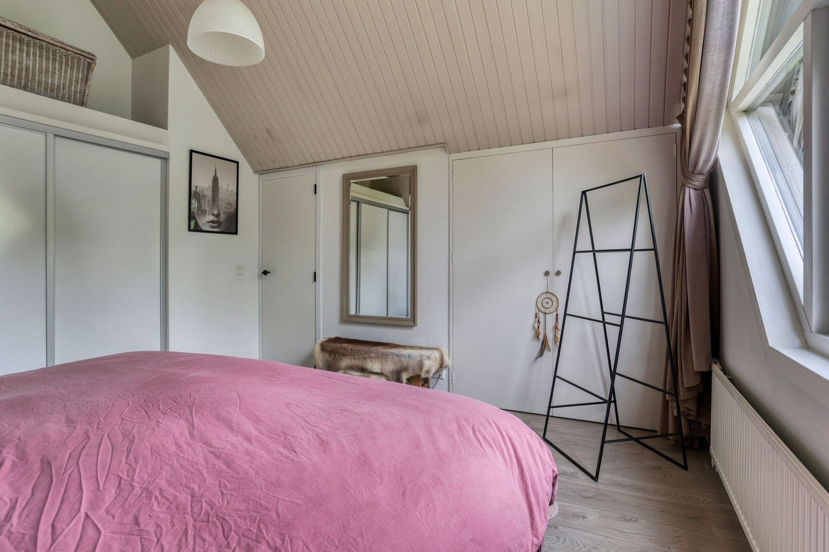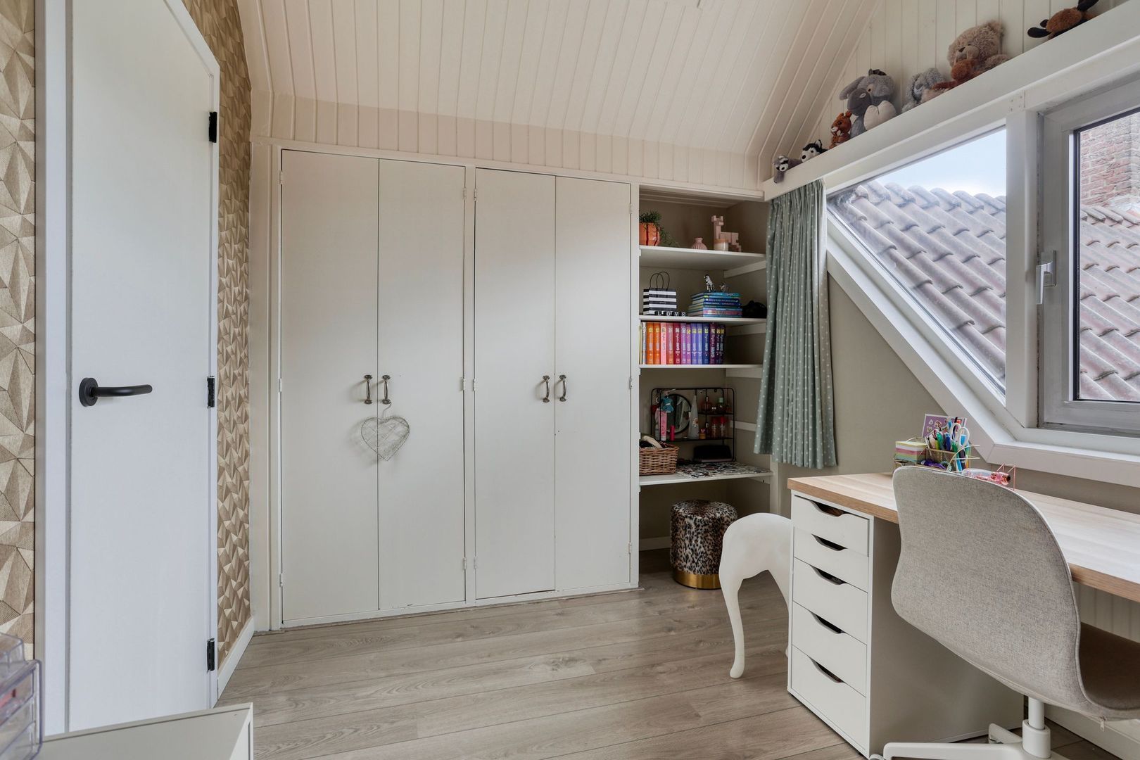 Slaapkamer 1, gelegen aan de voorzijde van de woning en is voorzien van een vaste kast, knieschotten en uitzicht op het park.