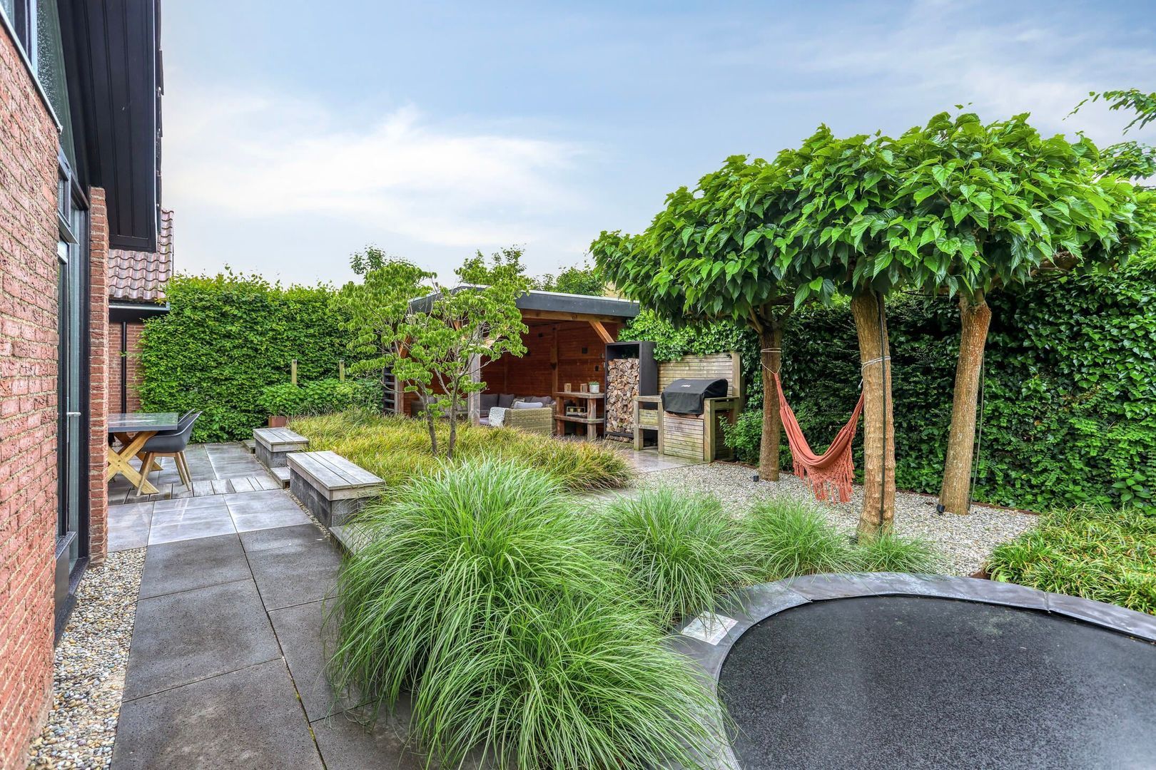 De fraai aangelegde zonnige tuin op het zuidwesten biedt veel privacy, deze heeft een overkapping en zitjes in de zon waardoor je altijd een fijne plek hebt om te zitten en te genieten van de zon of schaduw. Kinderen kunnen zich uitleven op de inground trampoline. De achtergevel is onlangs pas nog geschilderd en is voorzien van een elektrische zonnescherm.