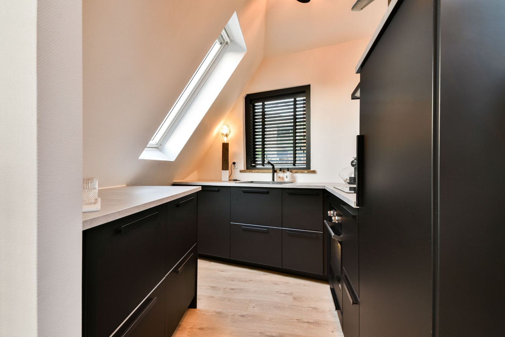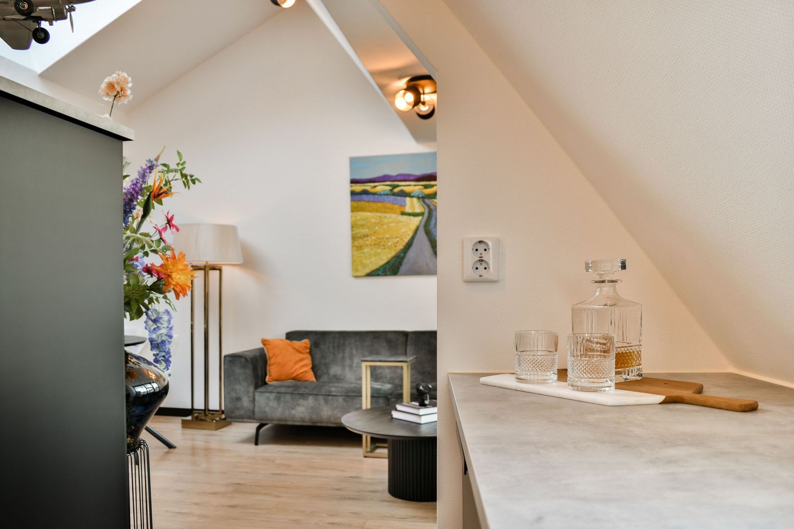 De sfeervolle woonkamer is voorzien van een elektrisch zonnescherm en een dakraam, wat zorgt voor extra veel licht. Vanuit de woonkamer heb je uitzicht op de Dorpsstraat en de winkels in het centrum van Bergschenhoek.