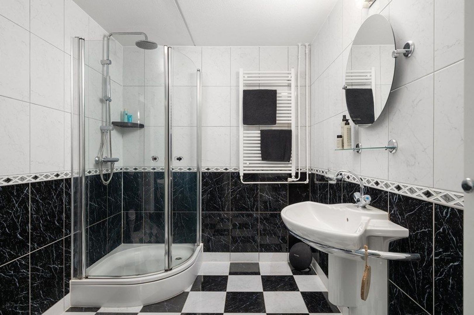 De badkamer is voorzien van een wastafel met spiegel, douche cabine en toilet.