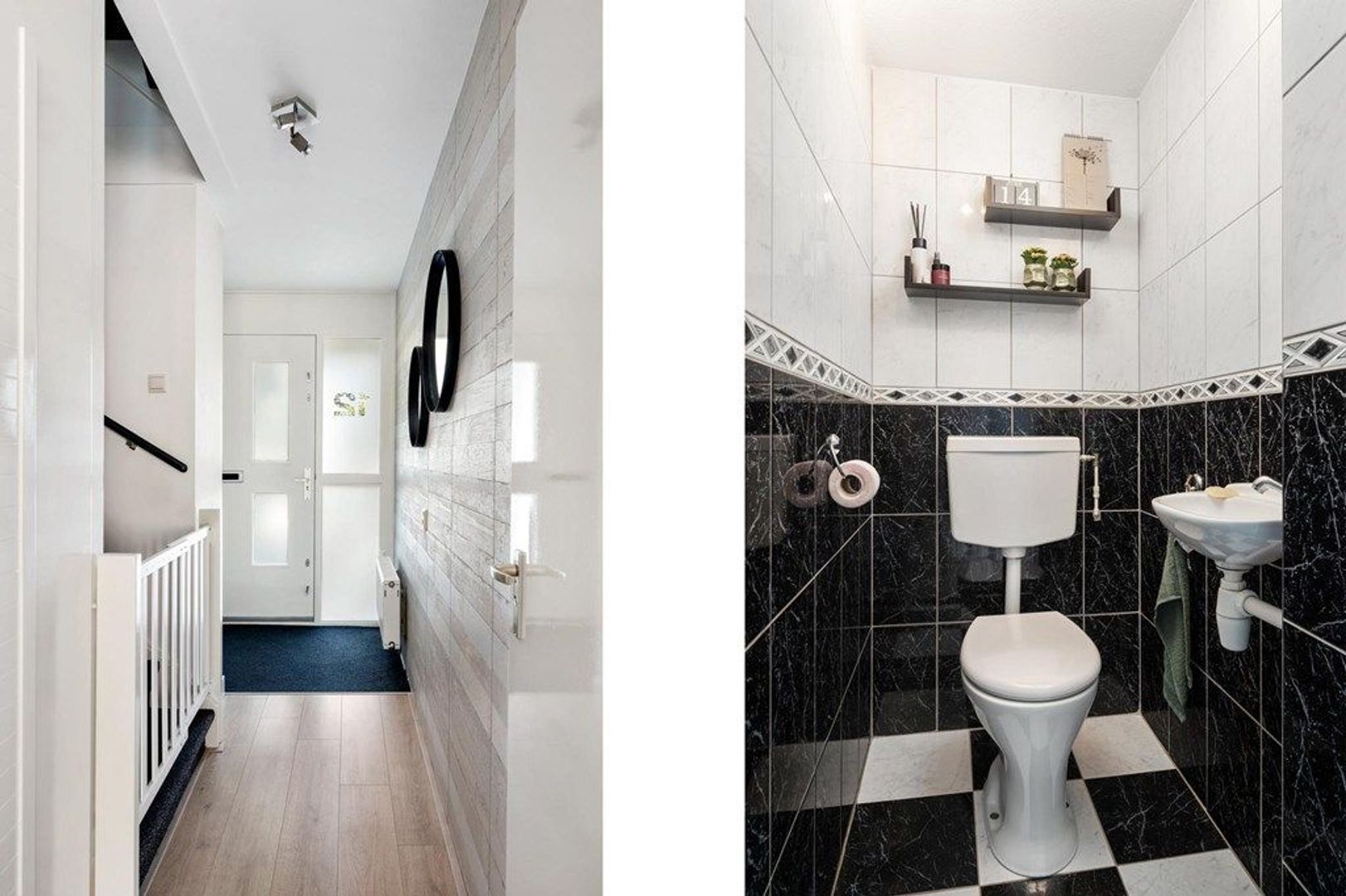 Hal, meterkast met glasvezel aansluiting, voorraadkast, toilet, trapopgang naar 1e verdieping en toegang tot de woonkamer.