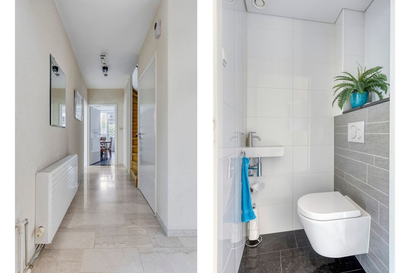 Hal met een elektrisch rolluik bij de voordeur, toilet, trapopgang naar de eerste verdieping en toegang tot de woonkamer en berging.