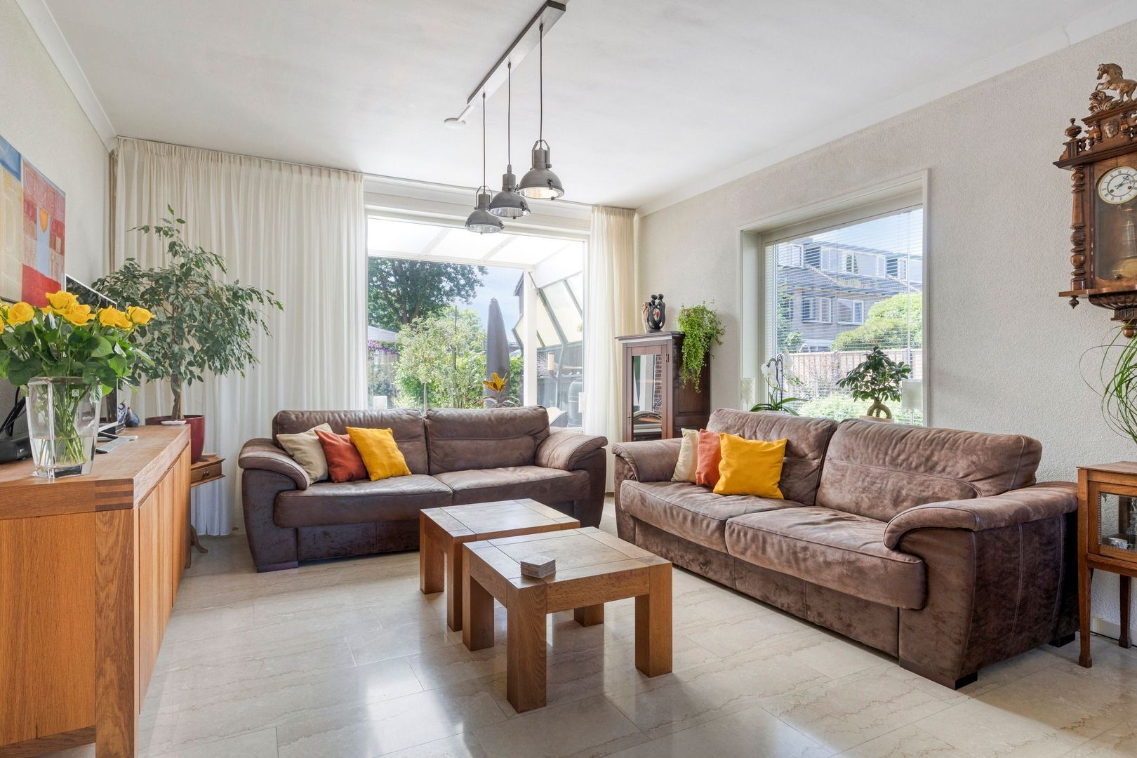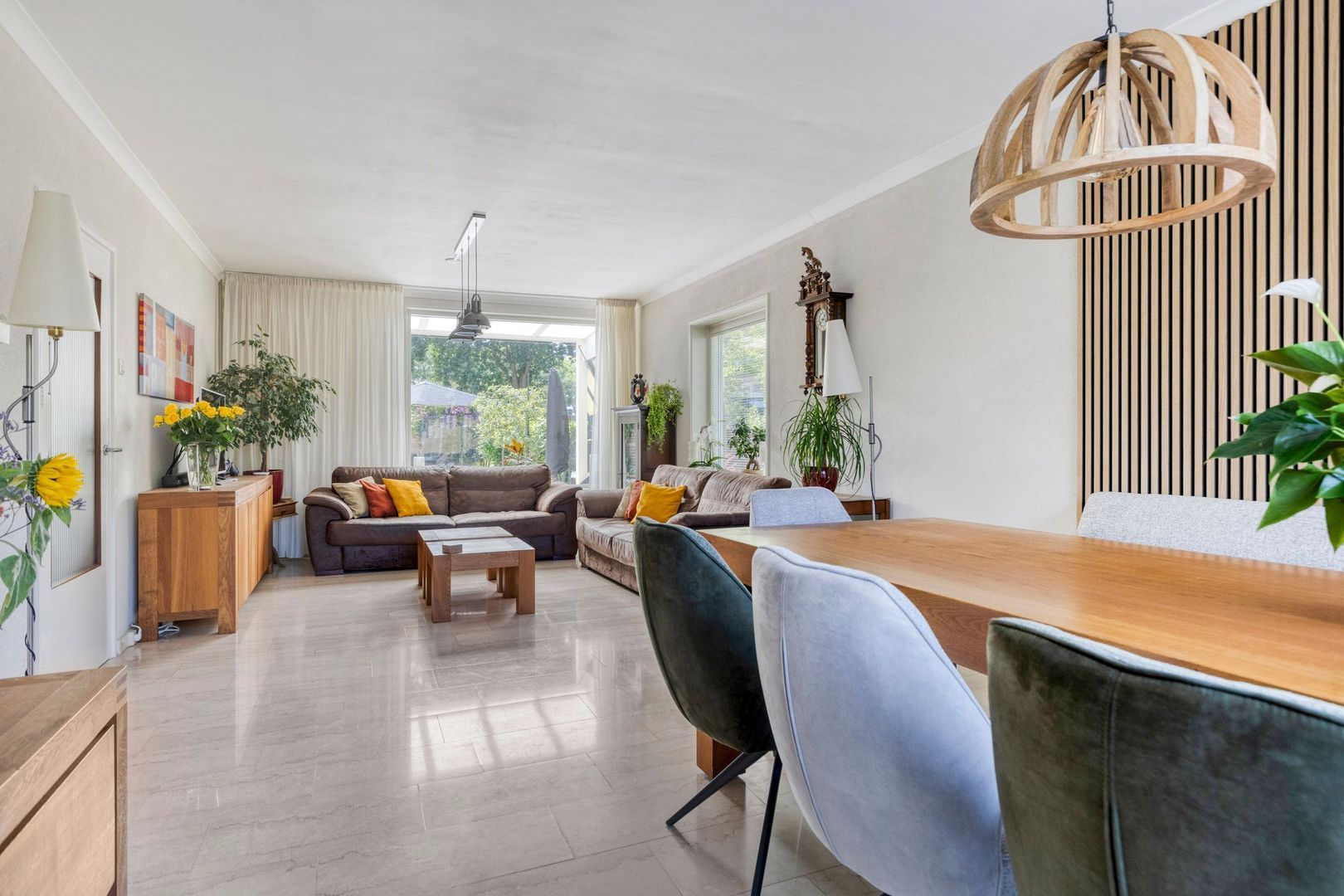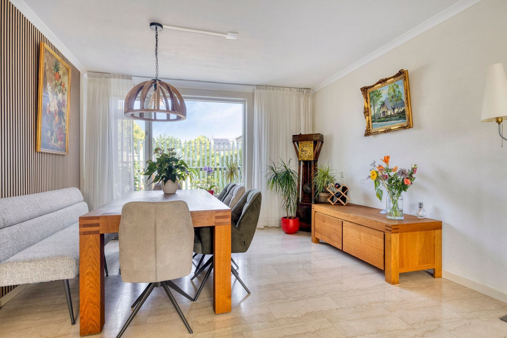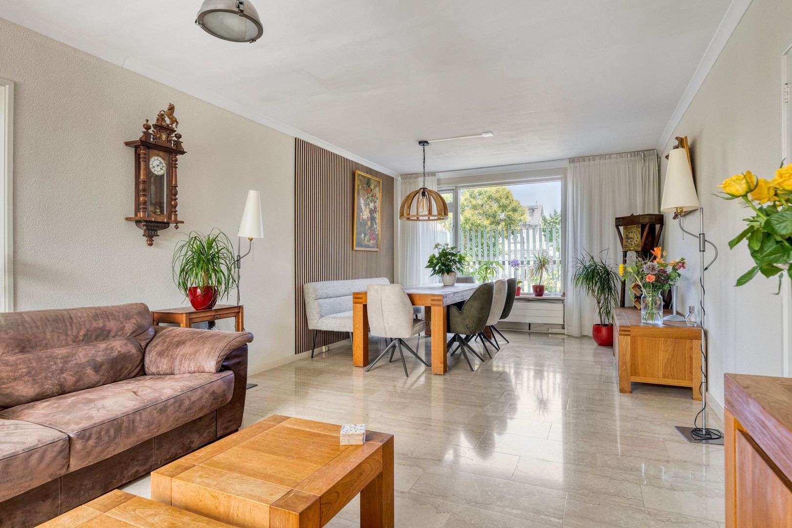 De lichte woonkamer is gelegen aan de achterzijde van de woning en is voorzien van mooie marmer vloer met vloerverwarming.